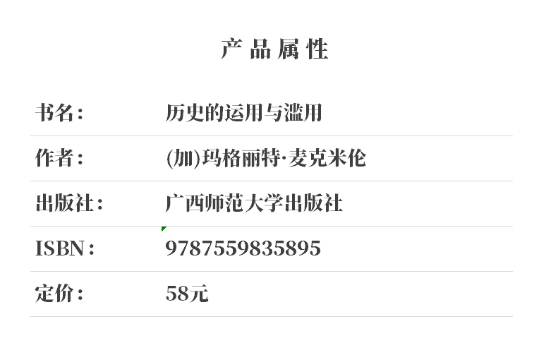 当我们制造谎言或是只从单一视角出发书写历史时,我们就在滥用历史。——玛格丽特•麦克米伦★撷取近现代舞台上的知名人物与事件,解读历史如何被看不见的手所操纵当今世界,对历史的操纵越来越普遍。独裁者可能会压制历史,以免失去威权统治的立基点。民族主义者可能会讲述关于过去的虚假故事。政治领导人可能通过说谎来动员人民。牛津大学教授麦克米伦撷取近现代人物史事,从罗伯斯庇尔、希特勒、丘吉尔到克林顿和小,皆是引领一时风骚的政治外交巨子,以各国政治及历史人物的大小故事与关键时刻借镜、立论,讲述了历史如何被扭曲、美化和政治化,反映史实理解的多重可能。★很好史学名家,非凡的靠前视野麦克米伦是当代西方史学界声誉卓著的大师级人物,主力研究领域为一战史事、靠前关系及外交史,家承显赫,其曾外祖父即为一战后巴黎和会的英国一代名相劳合•乔治。本书是其浸润在政治外交领域笔耕多年的心得集成,展现了她非一般历史学者所能及的靠前视野。