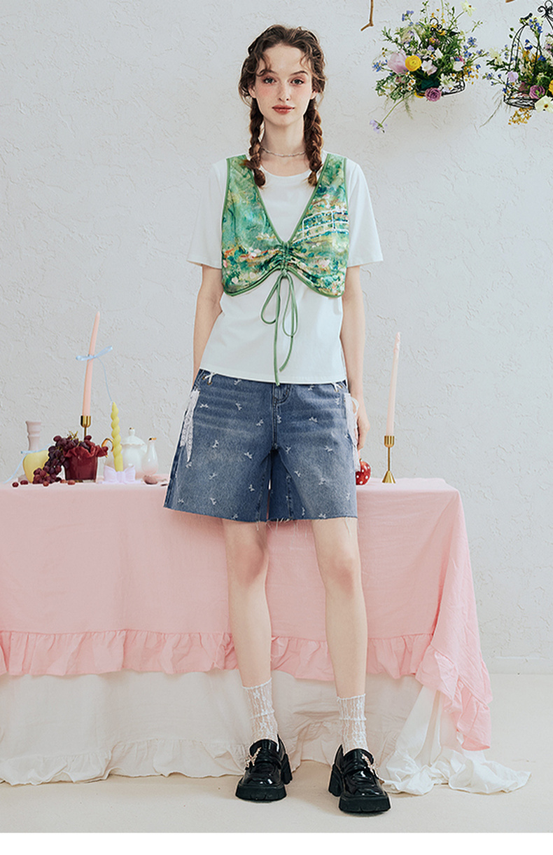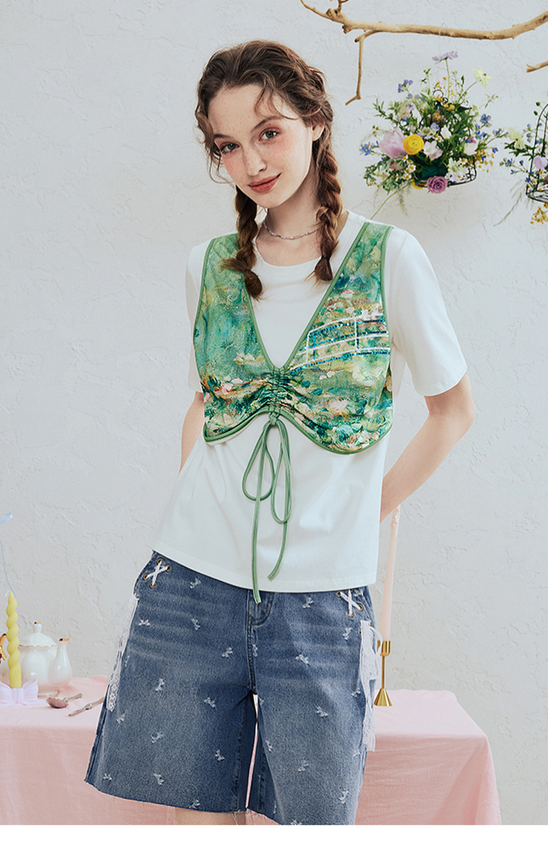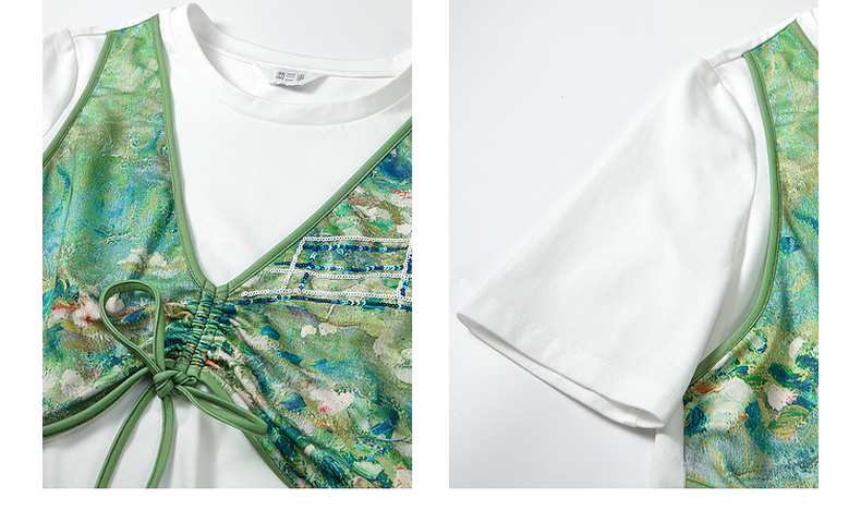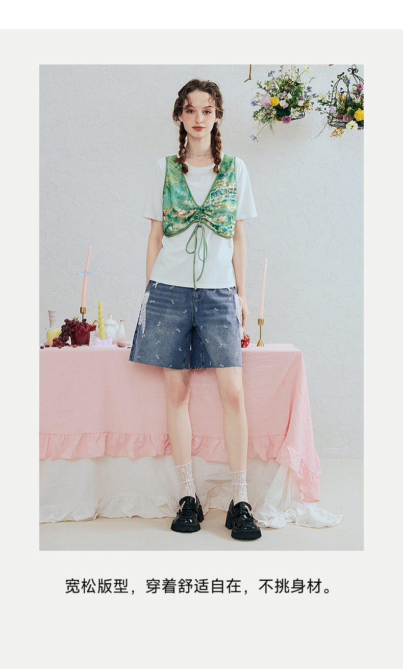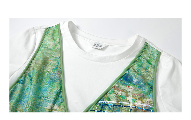 两三事 蝶吻清泉 2025夏季新款时尚珠片绣印花布拼接假两件t恤女