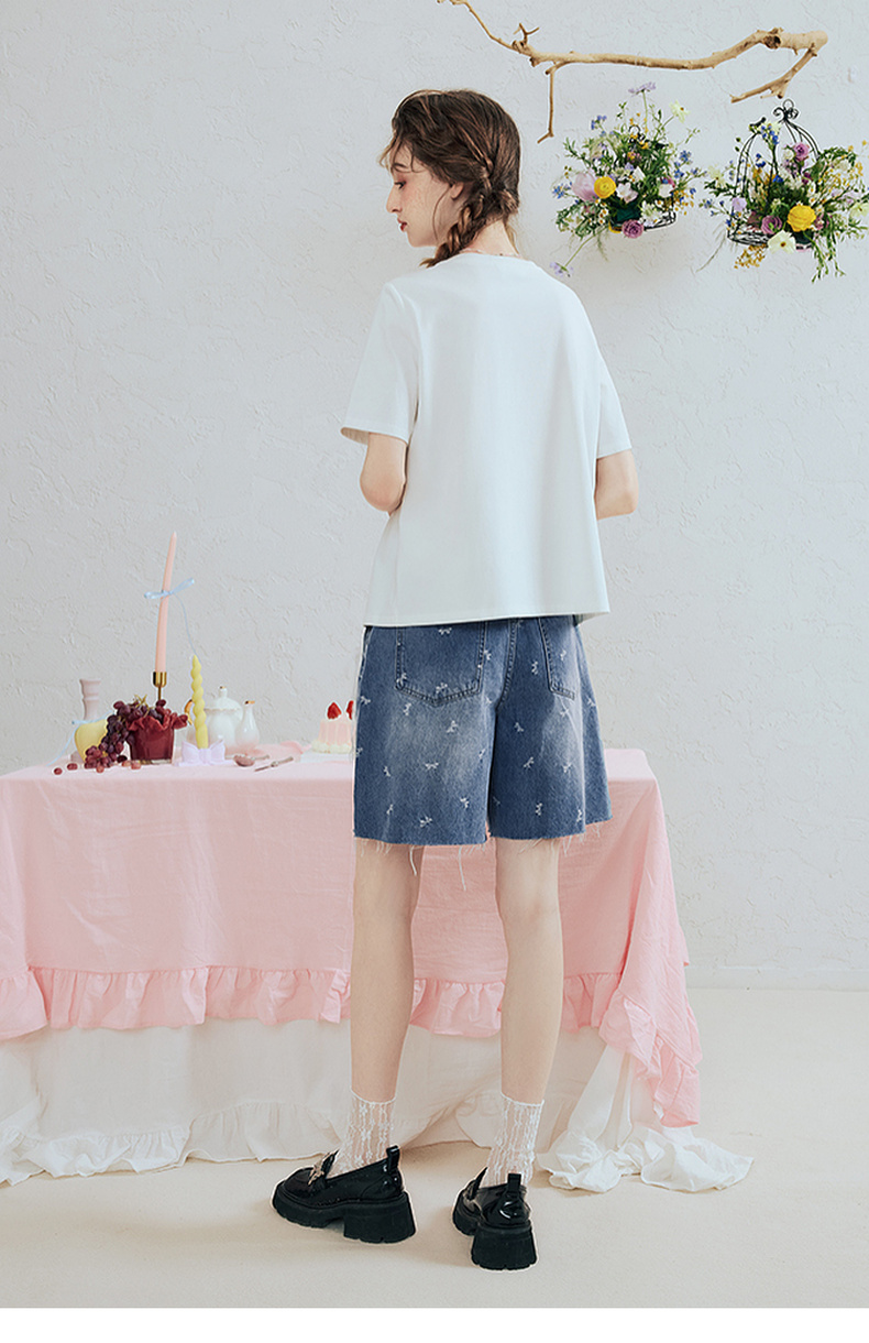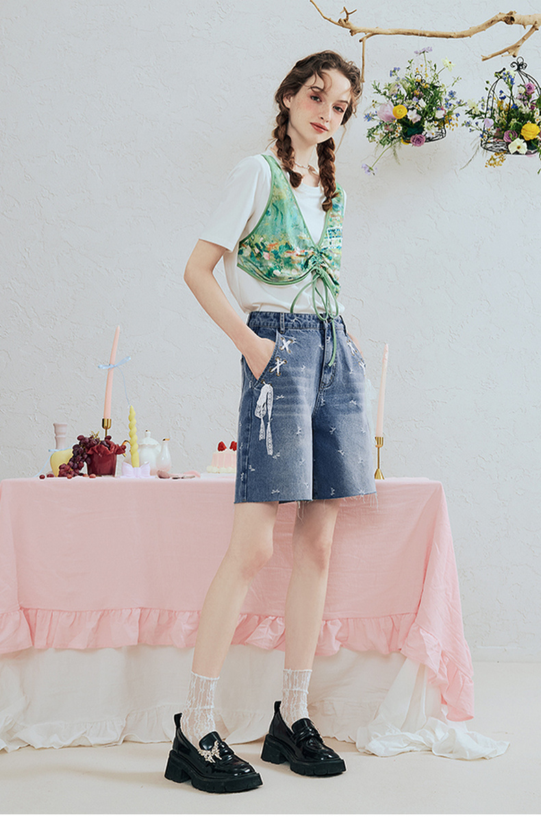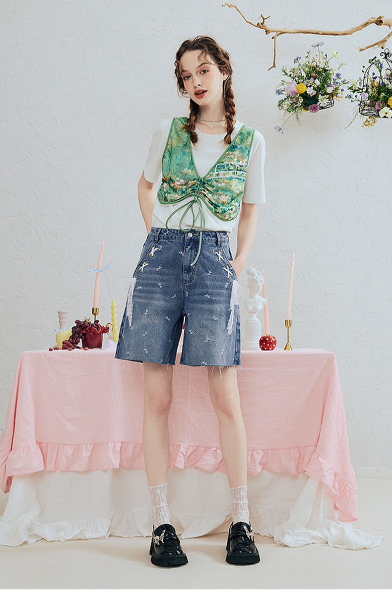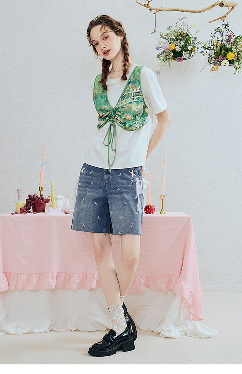两三事 蝶吻清泉 2025夏季新款时尚珠片绣印花布拼接假两件t恤女