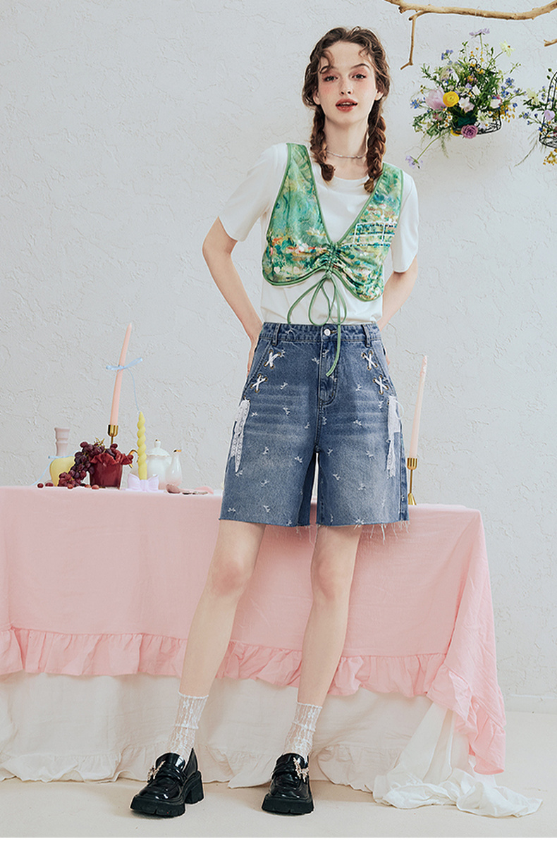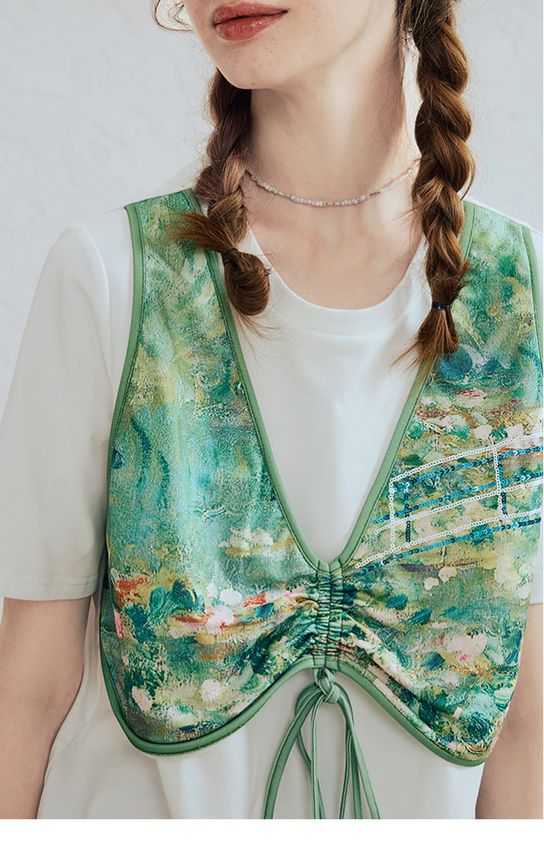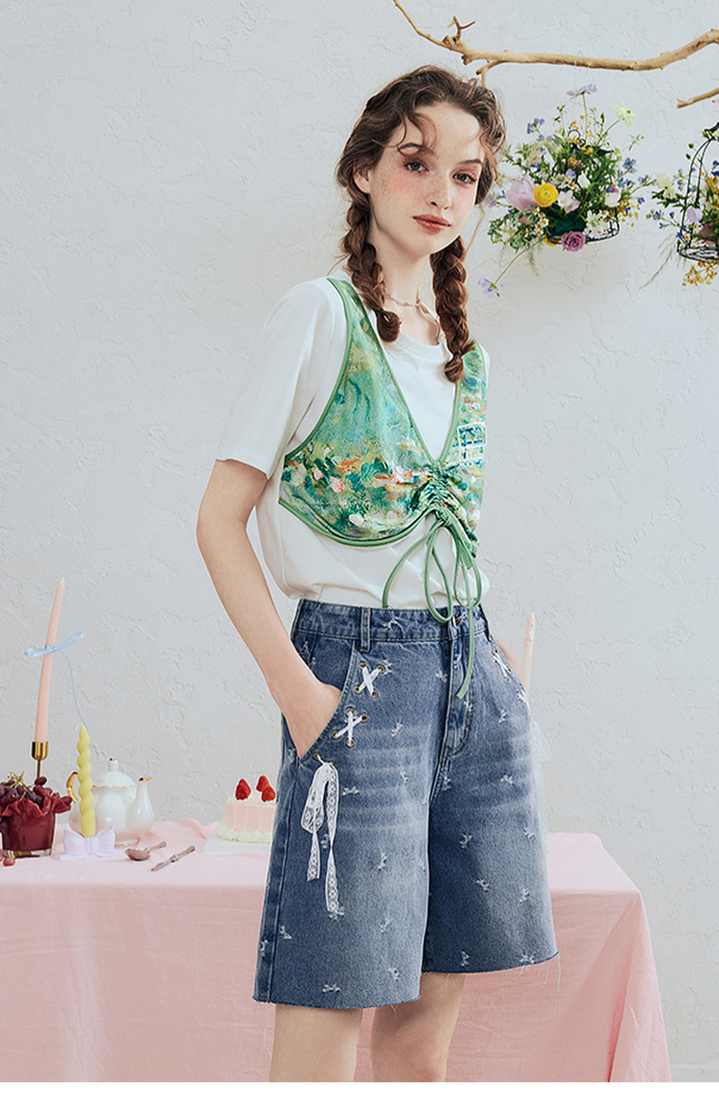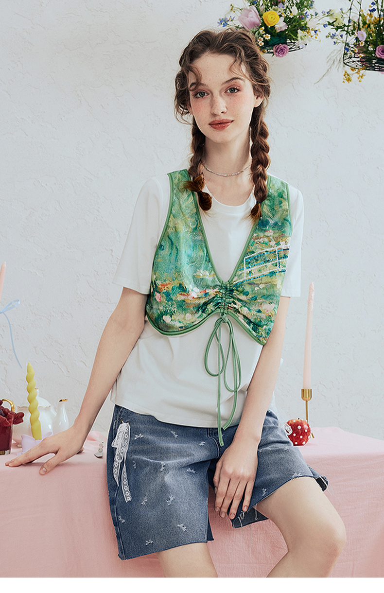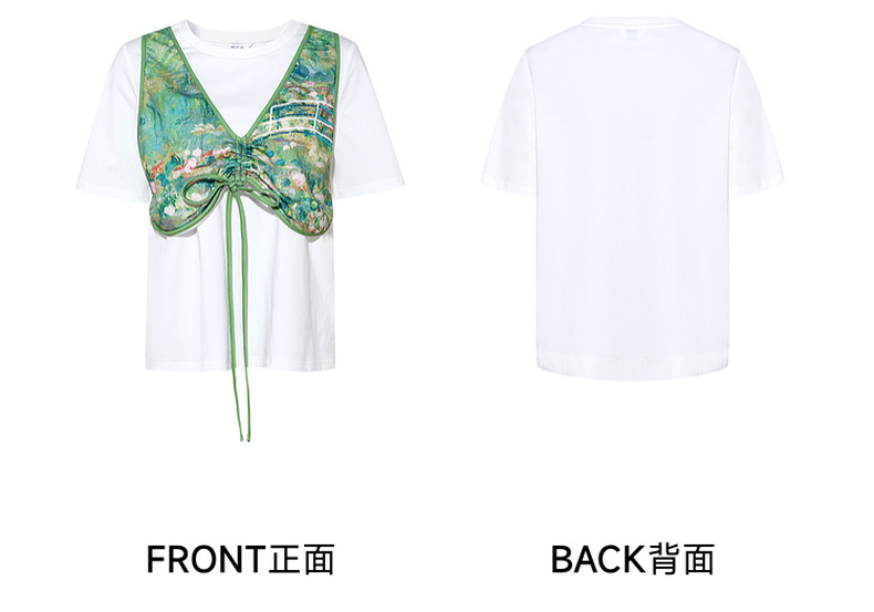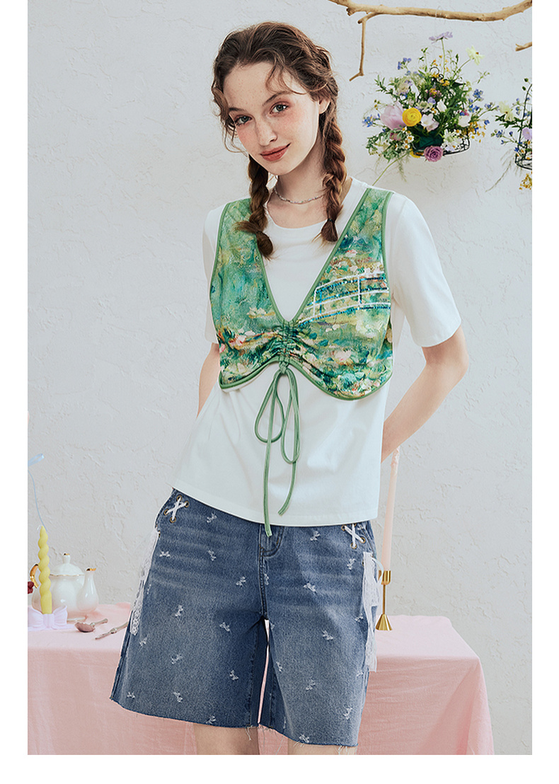 两三事梵高文艺 弦外智音 2025夏季新款彩绳绑带领印花短袖t恤女