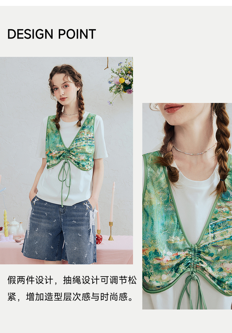 两三事2024夏季新款甜美蕾丝印花拼接假两件t恤女宽松