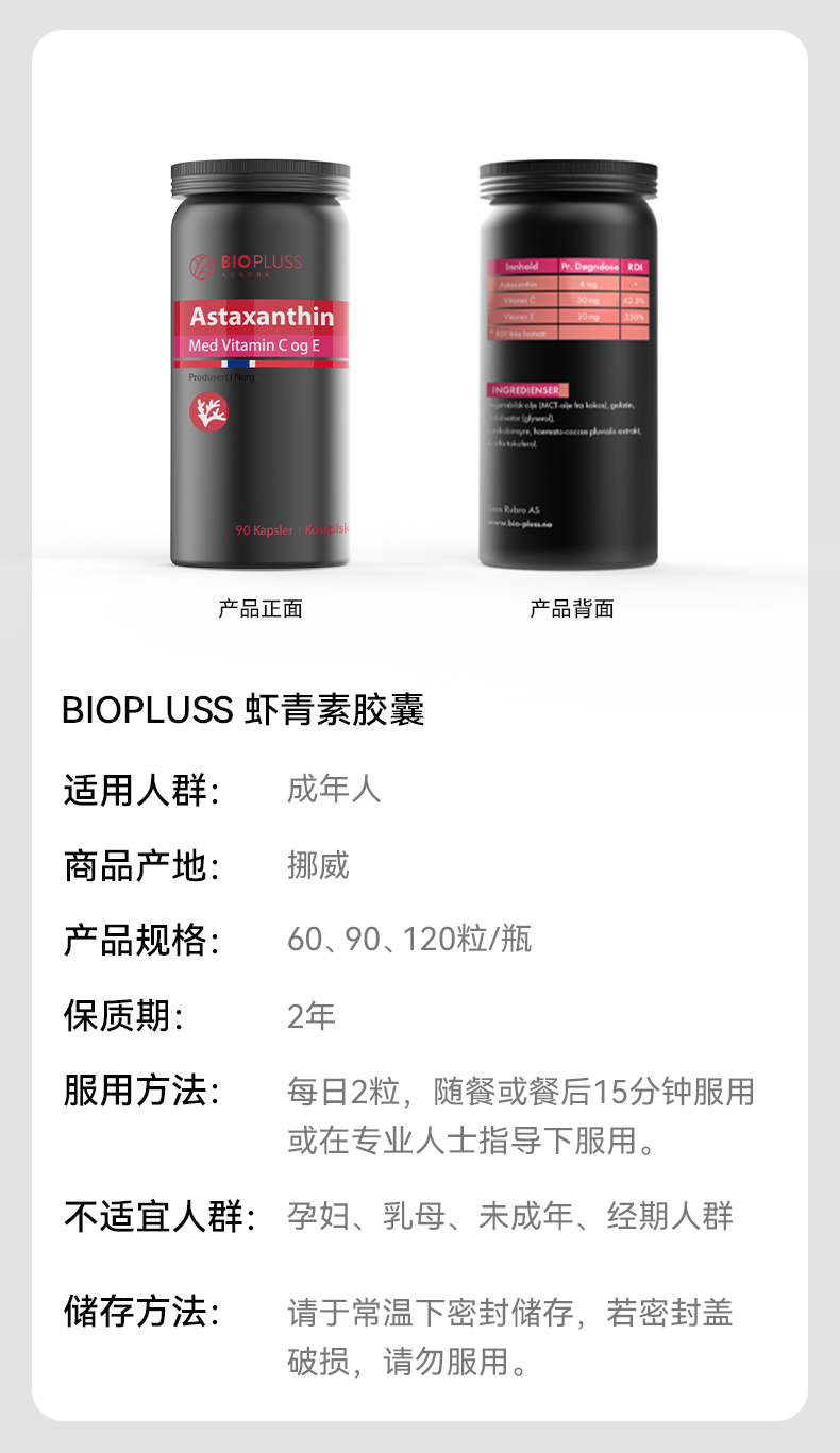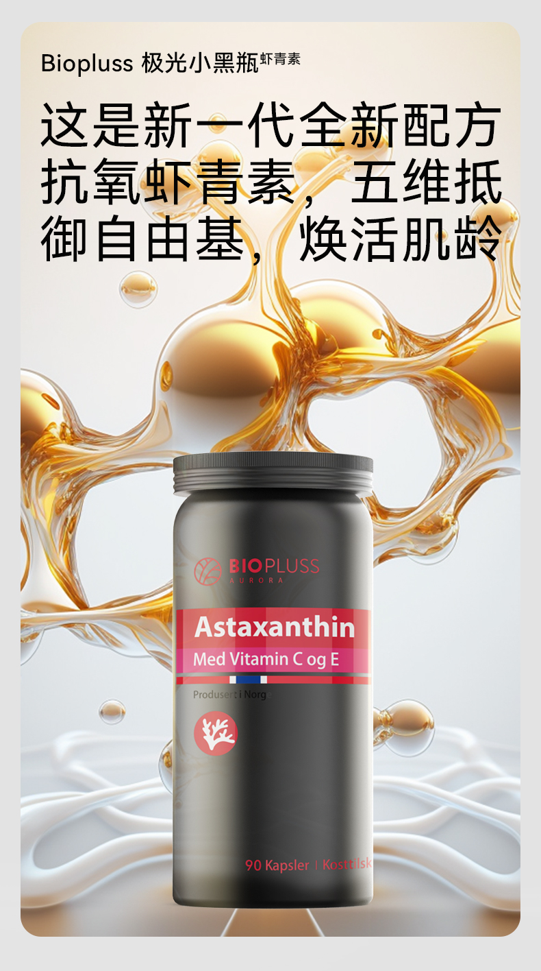 Biopluss挪威进口虾青素精华口服胶囊雨生红球藻90粒/瓶