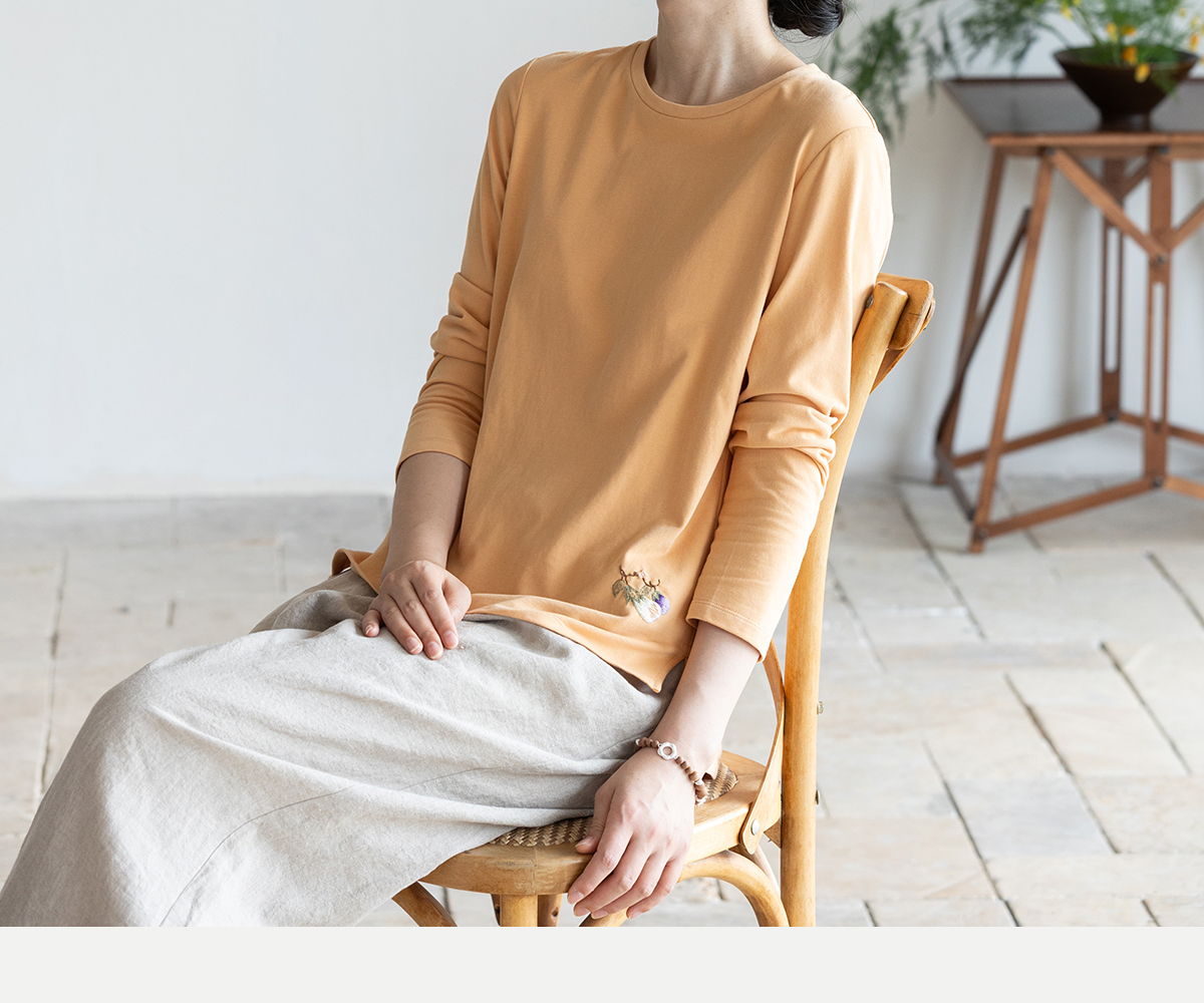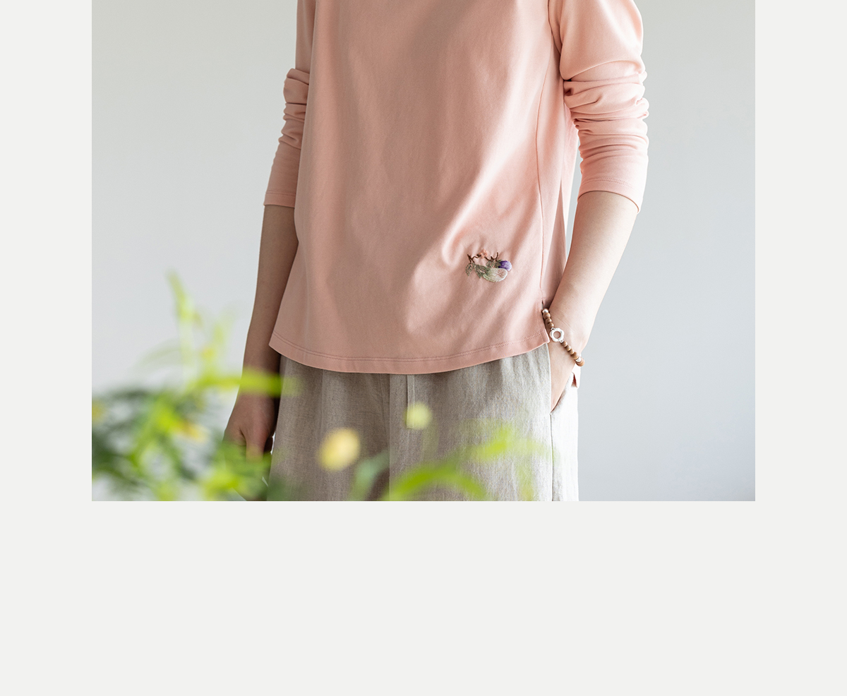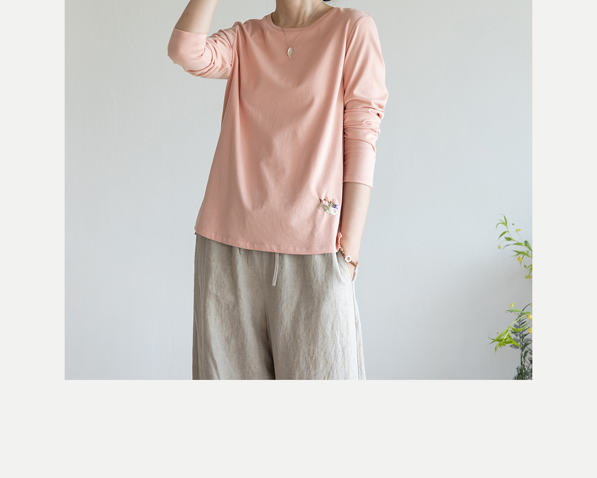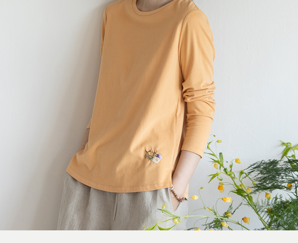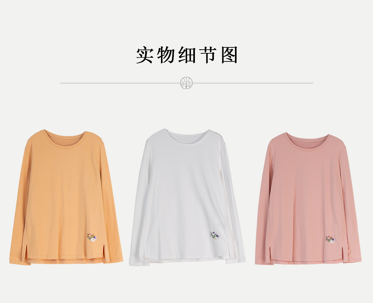 牧衣游原创手工刺绣棉质T恤女秋简约百搭套头圆领长袖上衣 伴星月