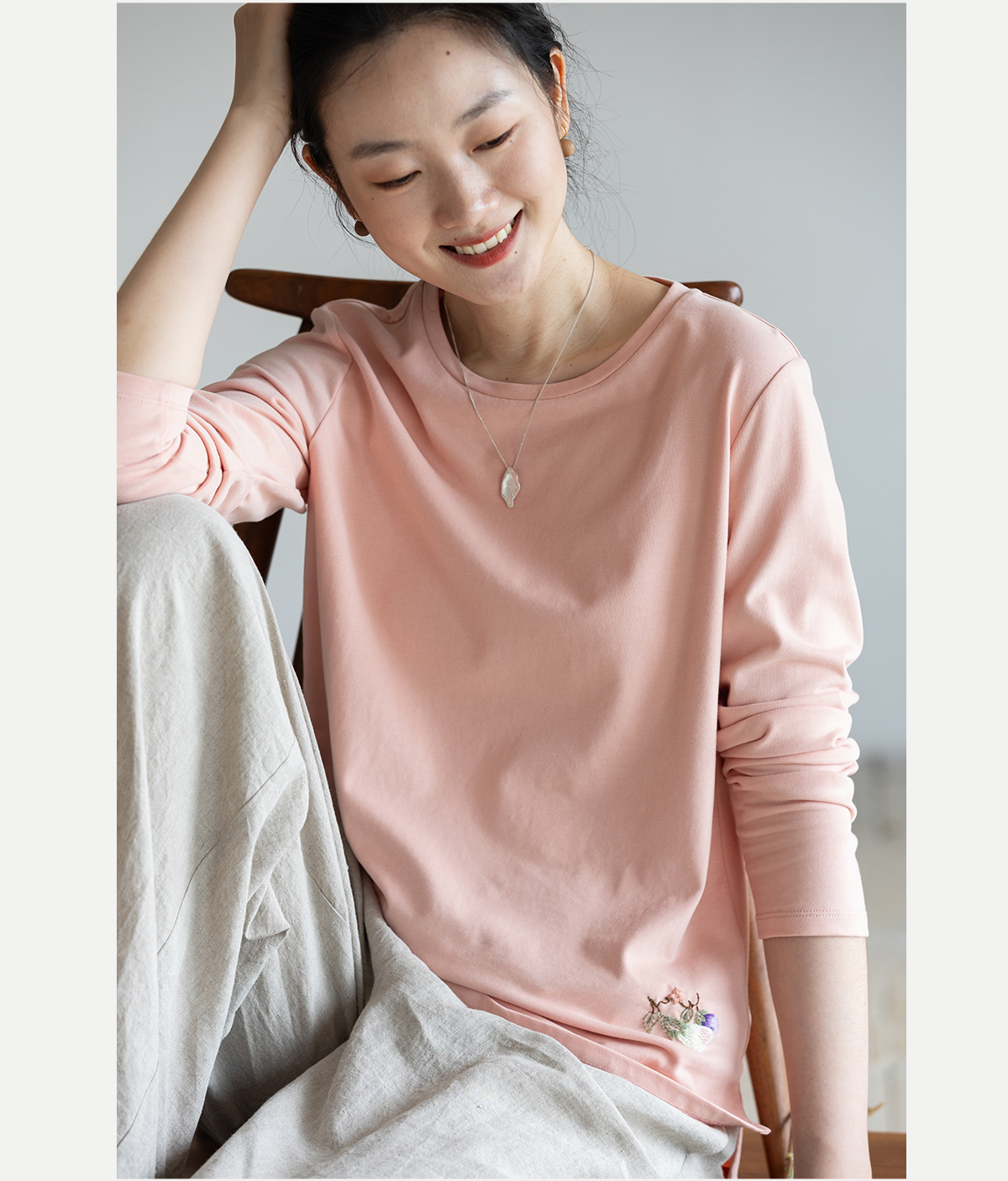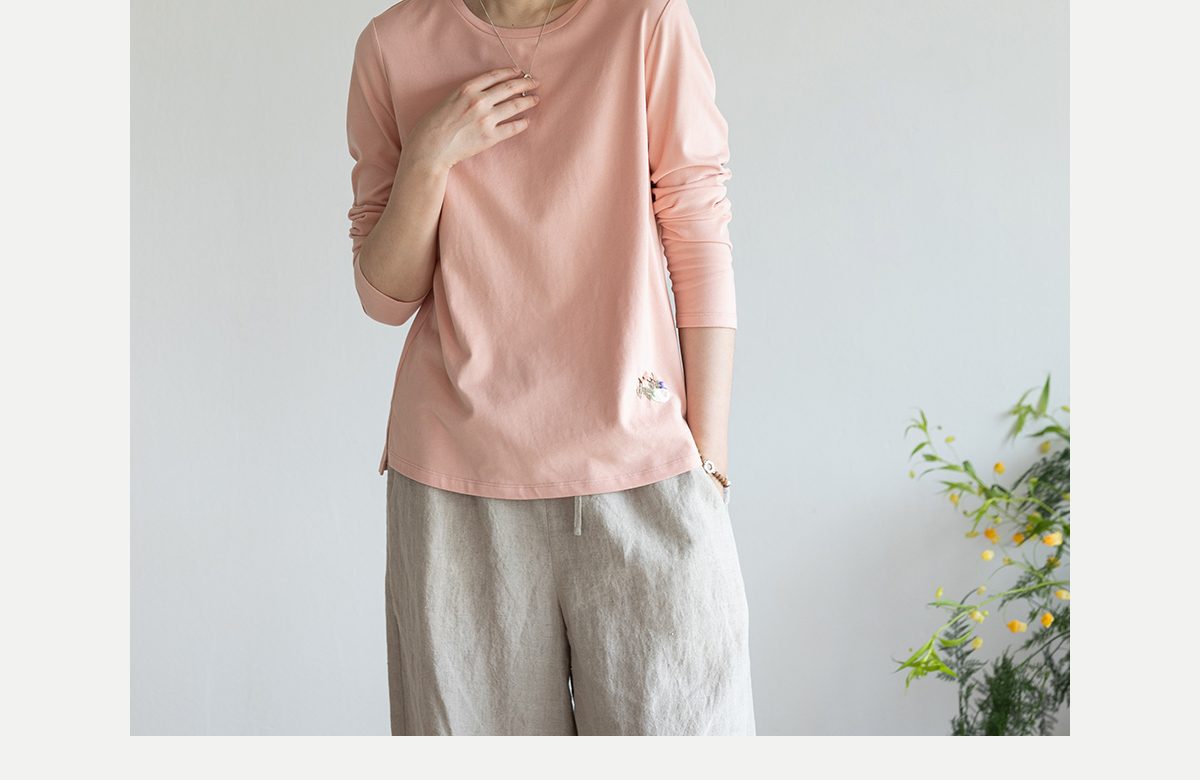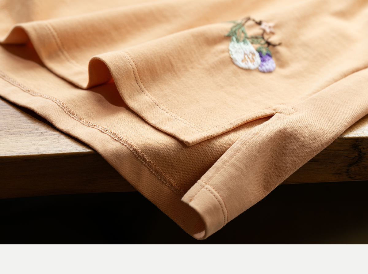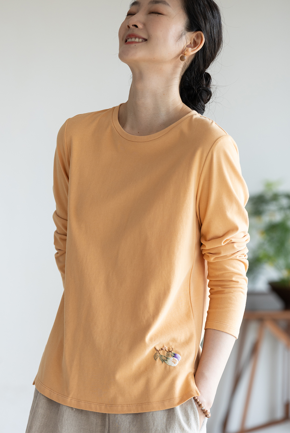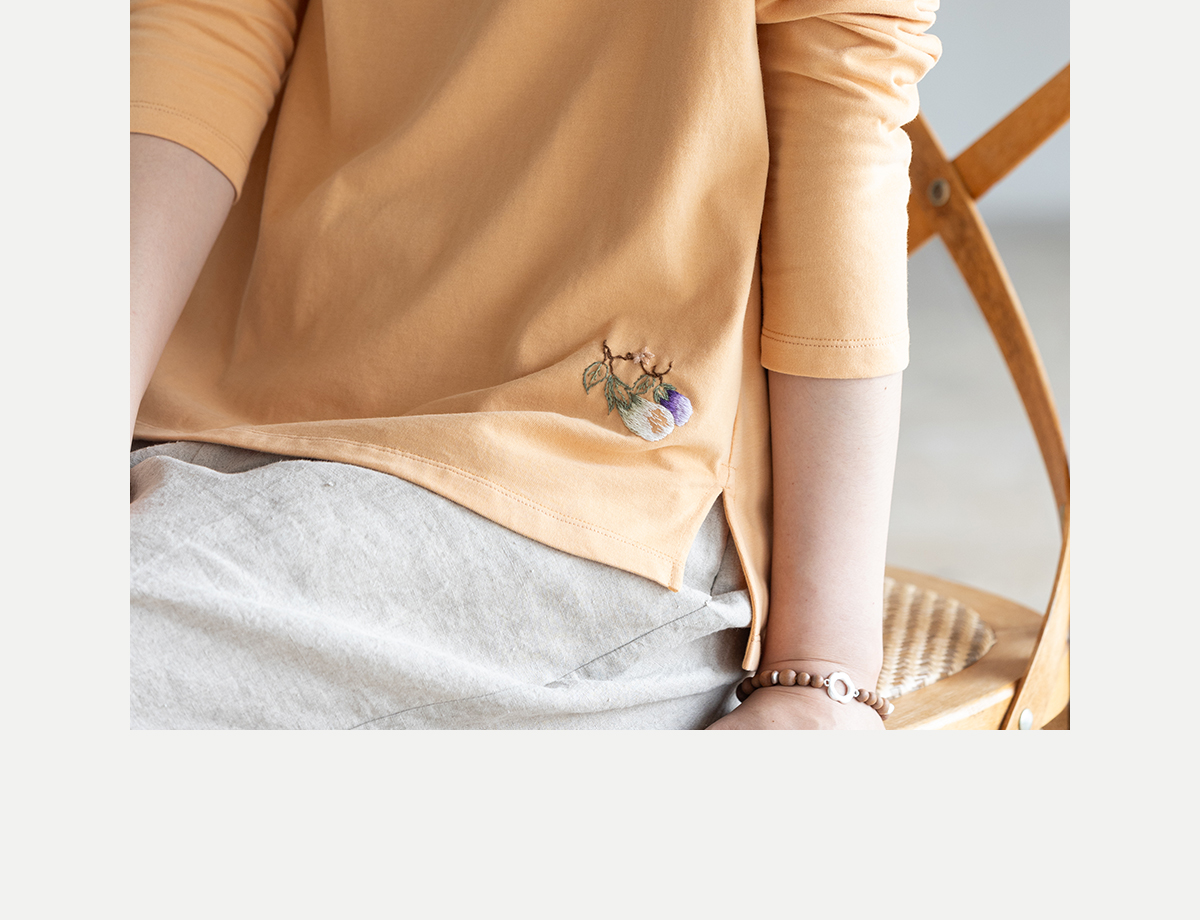 牧衣游原创手工刺绣棉质T恤女秋简约百搭套头圆领长袖上衣 伴星月