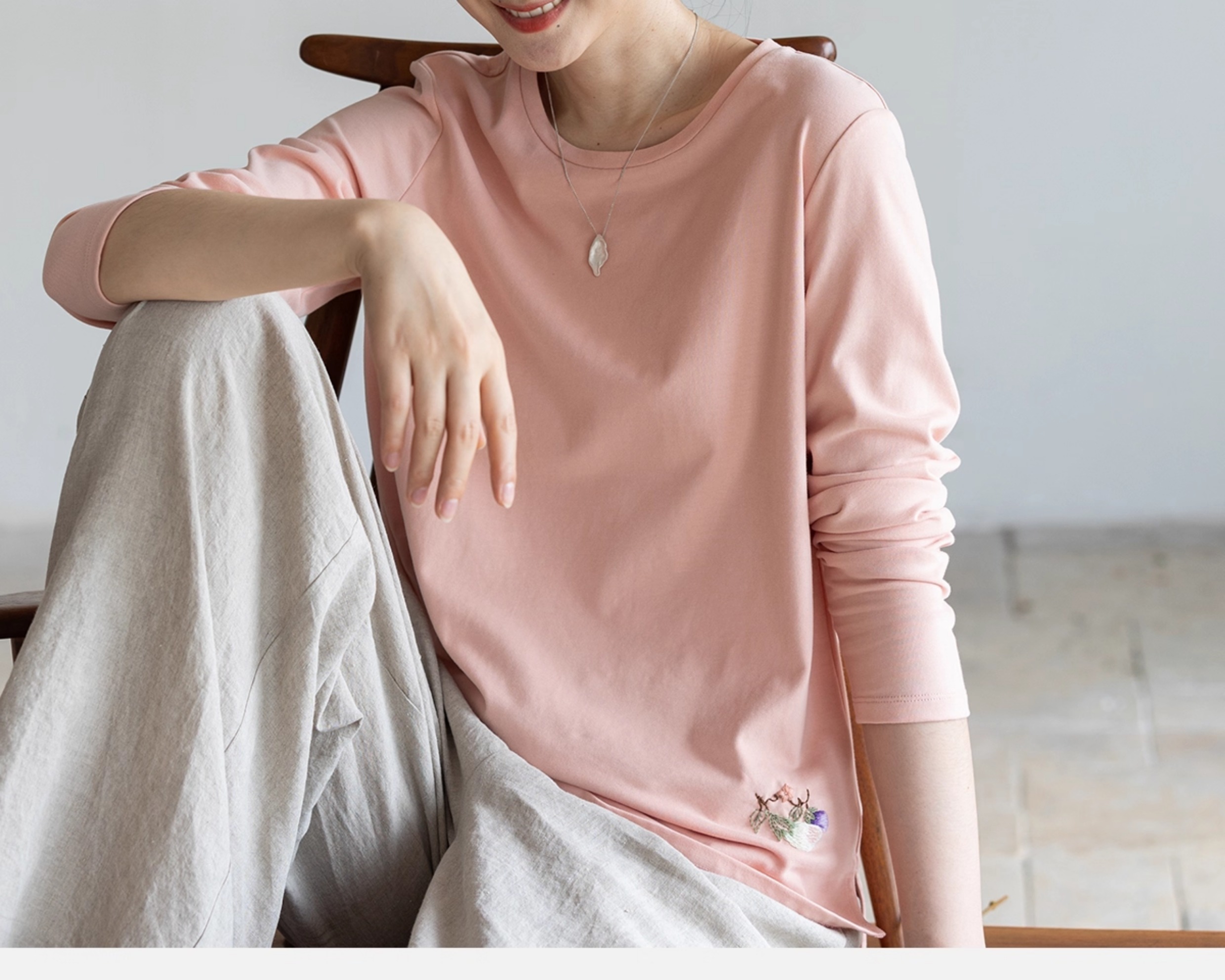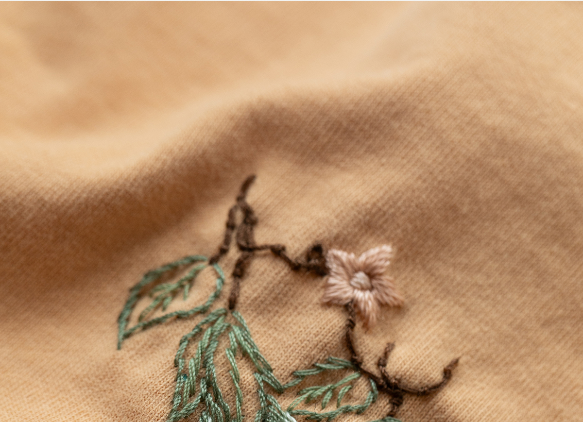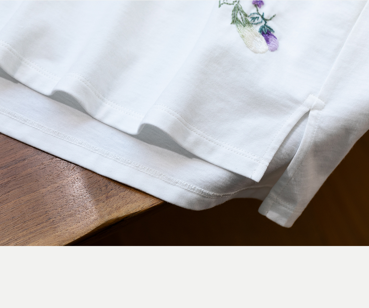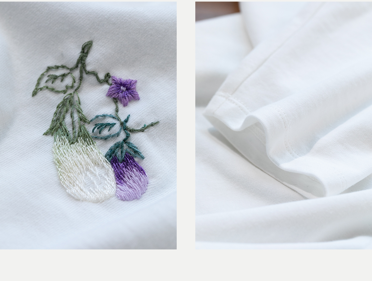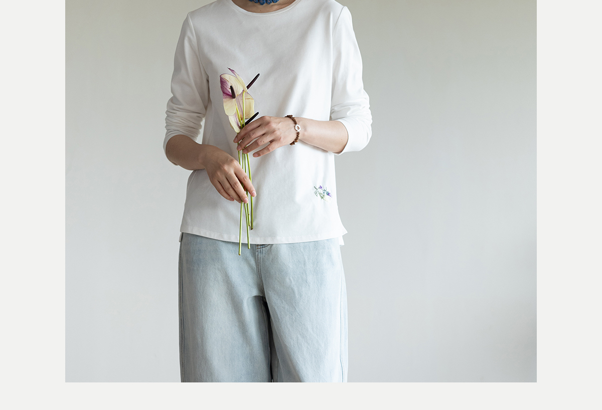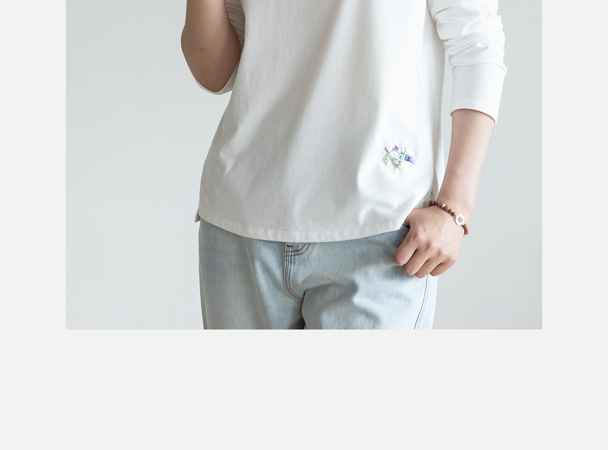 牧衣游原创手工刺绣棉质T恤女秋简约百搭套头圆领长袖上衣 伴星月