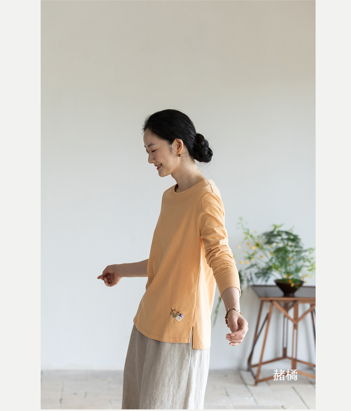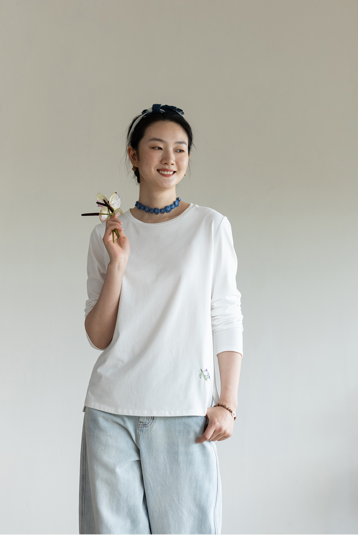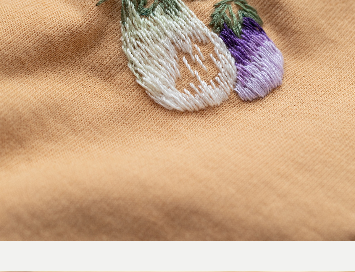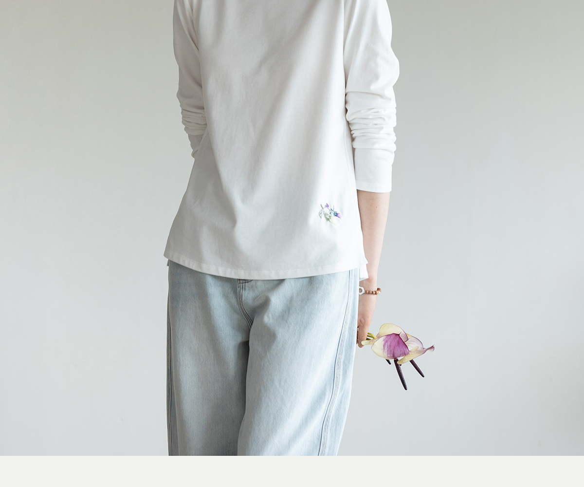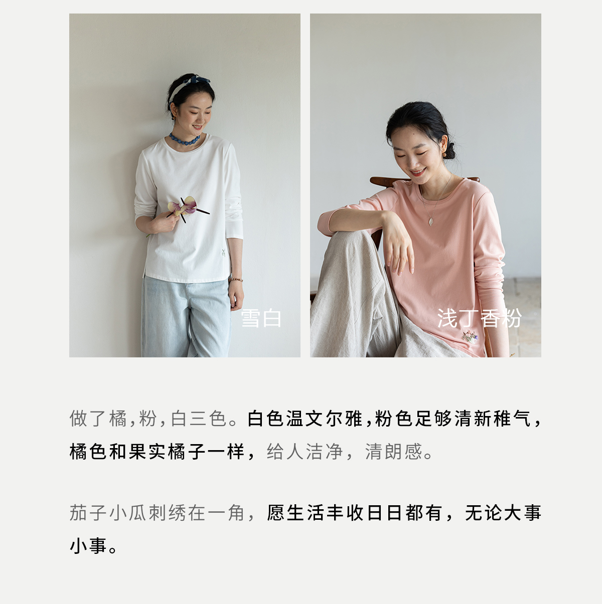 牧衣游原创手工刺绣棉质T恤女秋简约百搭套头圆领长袖上衣 伴星月