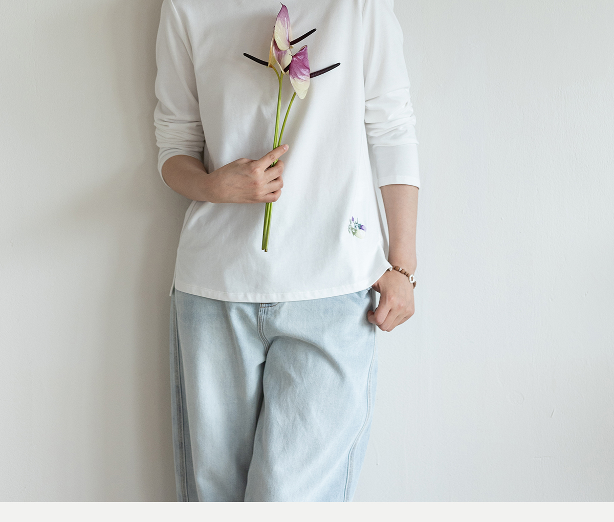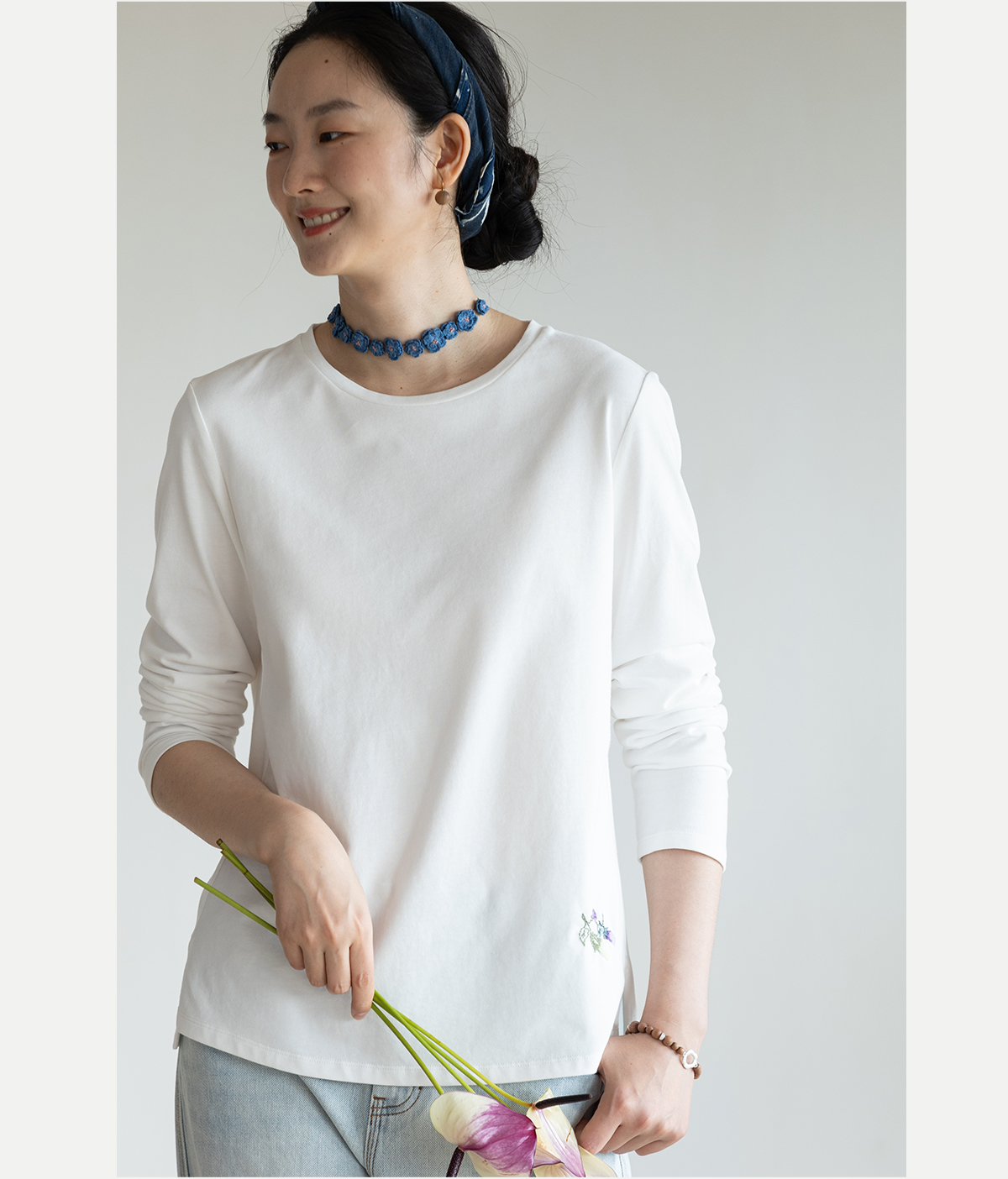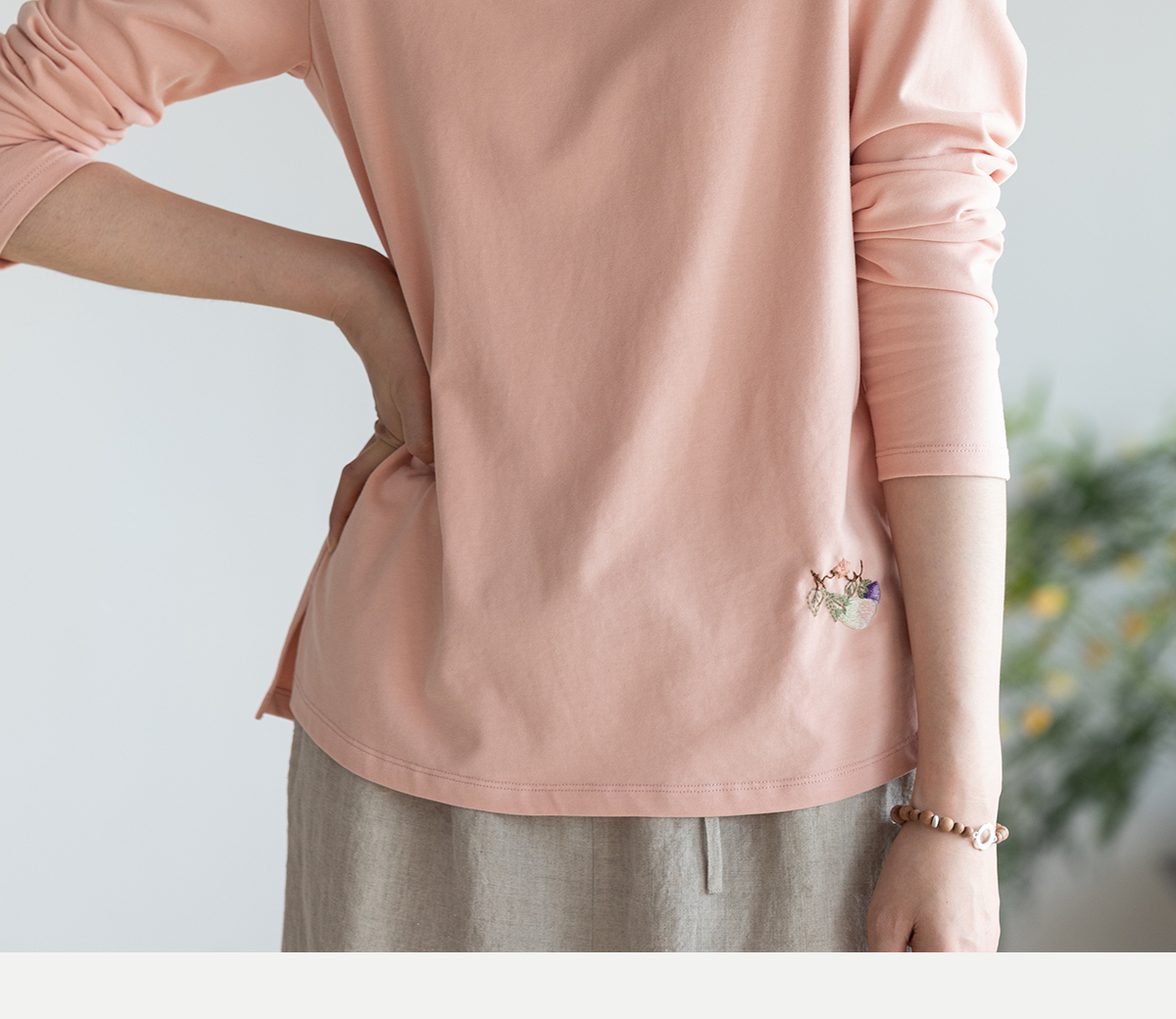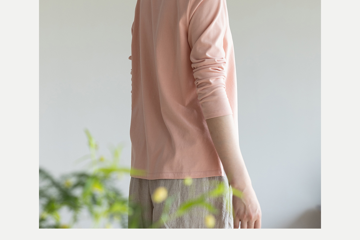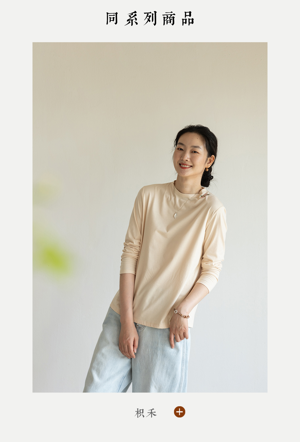 牧衣游原创手工刺绣棉质T恤女秋简约百搭套头圆领长袖上衣 伴星月