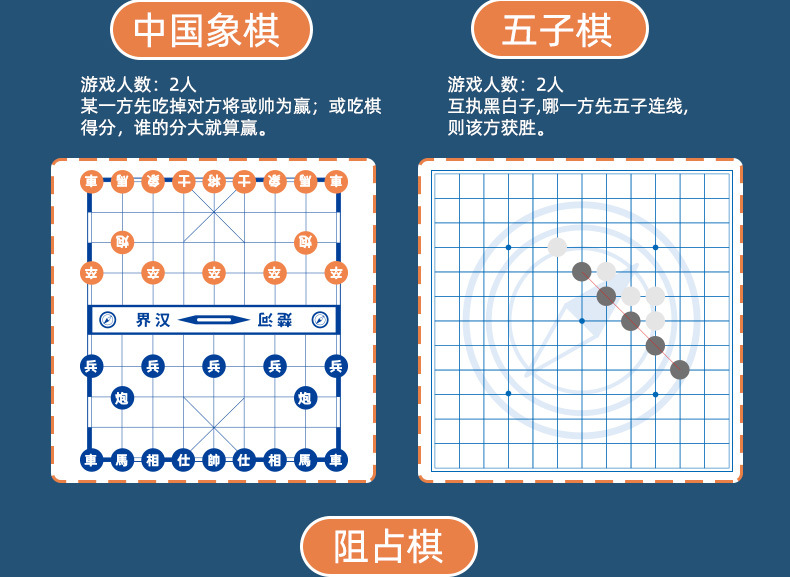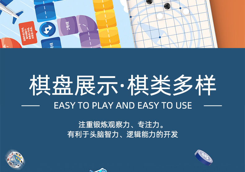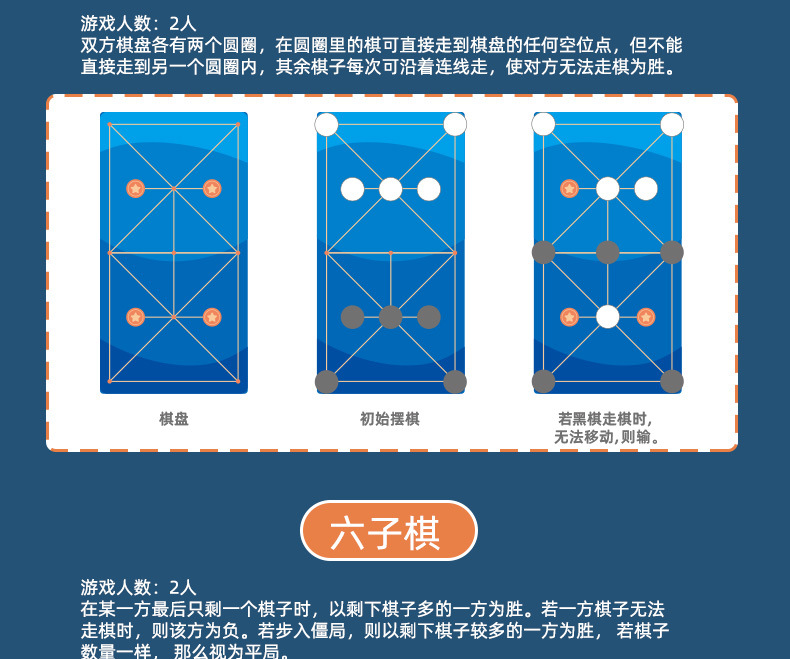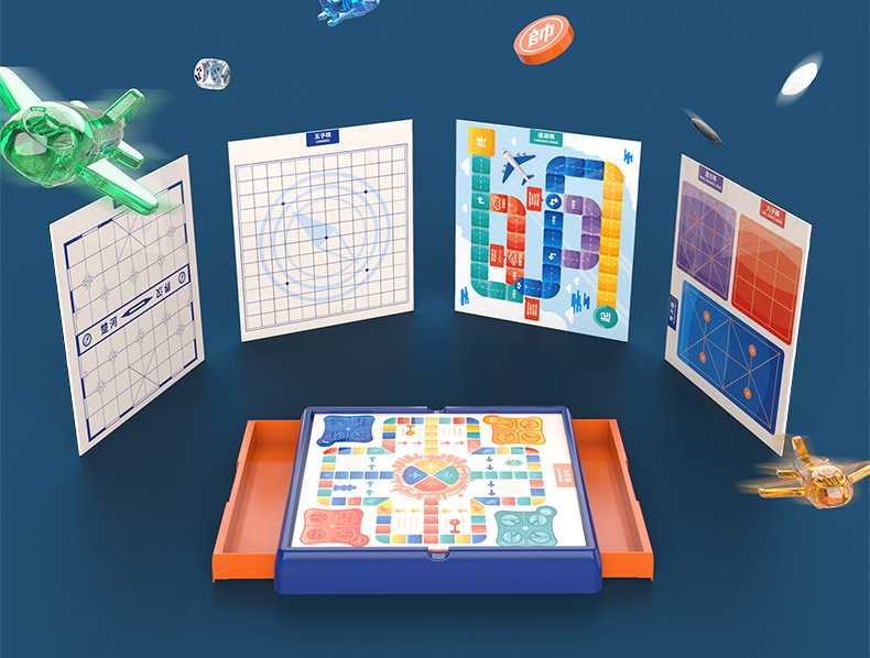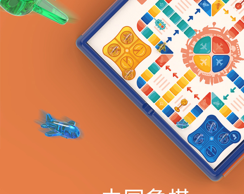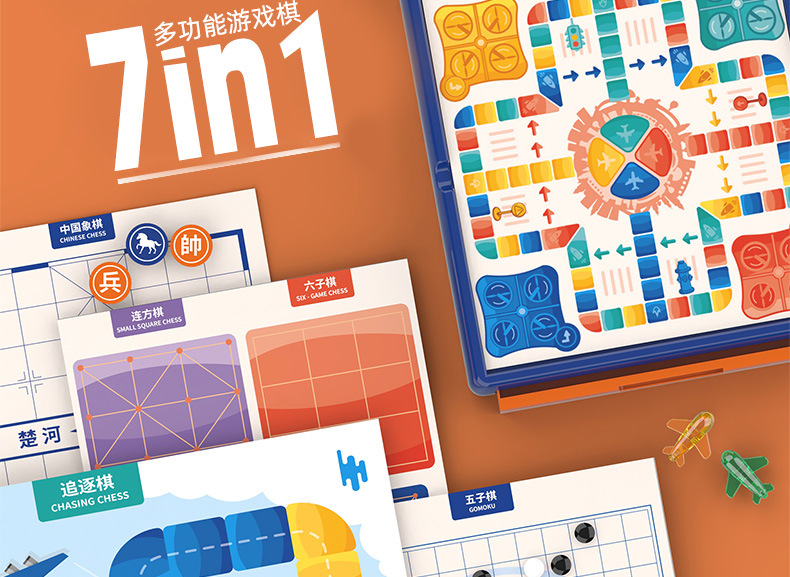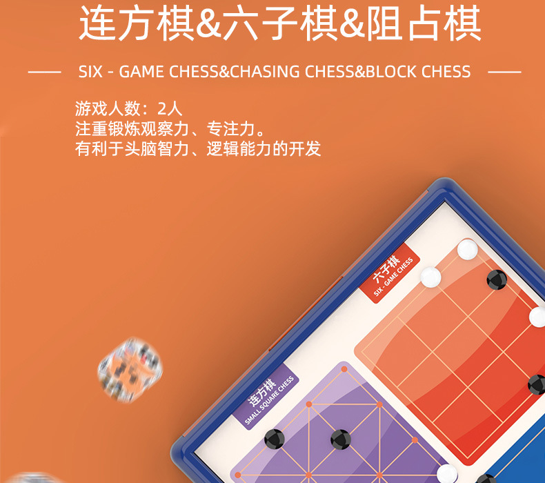 六合一游戏棋的棋子有六个颜色,黄6粒,蓝6粒,红6粒,绿4粒,黑白各26粒