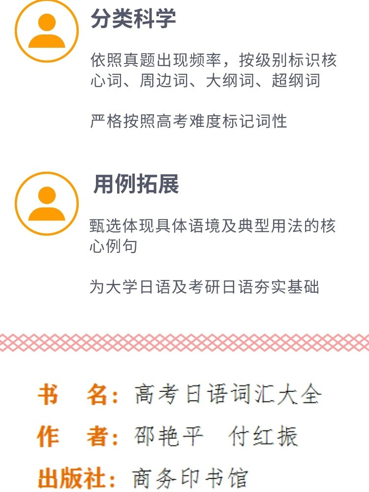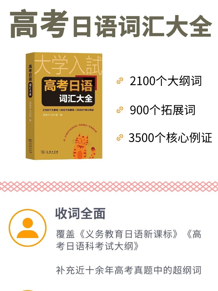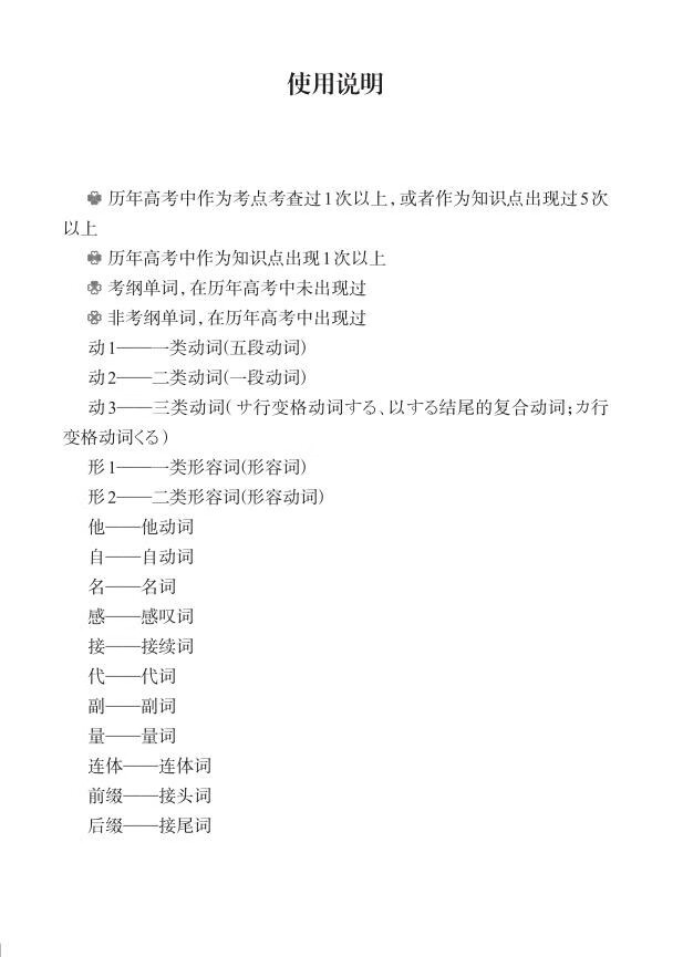 本书以教育部新修订的《义务教育日语课程标准(2022年版)》(包括800个“掌握词汇”和200个“理解词汇”)、《普通高中日语课程标准(2017年版)》(计约1000词)及《2019年普通高等学校招生全国统一考试日语科考试大纲》(计约2000词)为主要依据,参照近10年日语高考真题覆盖的词汇范围,累计收词约3000个。词条按日语五十音序排列。依据真题考试中出现的频次,精心划分为1-4档并分别突出显示。词条下设置书写、词性、释义及常用例句(以真题为蓝本,以核心搭配为主),基本满足考生查阅之需。