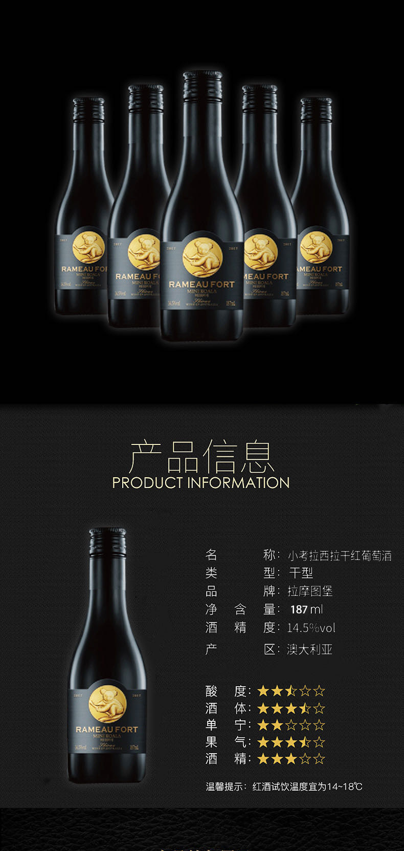 拉摩图堡小考拉西拉干红葡萄酒瓶装 187ml*6瓶/187ml*24瓶 口感圆润 丰满优雅