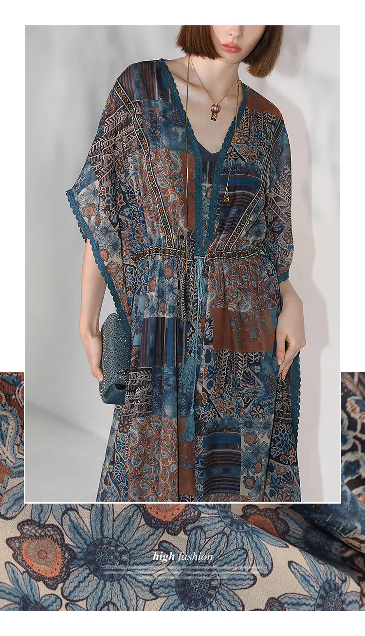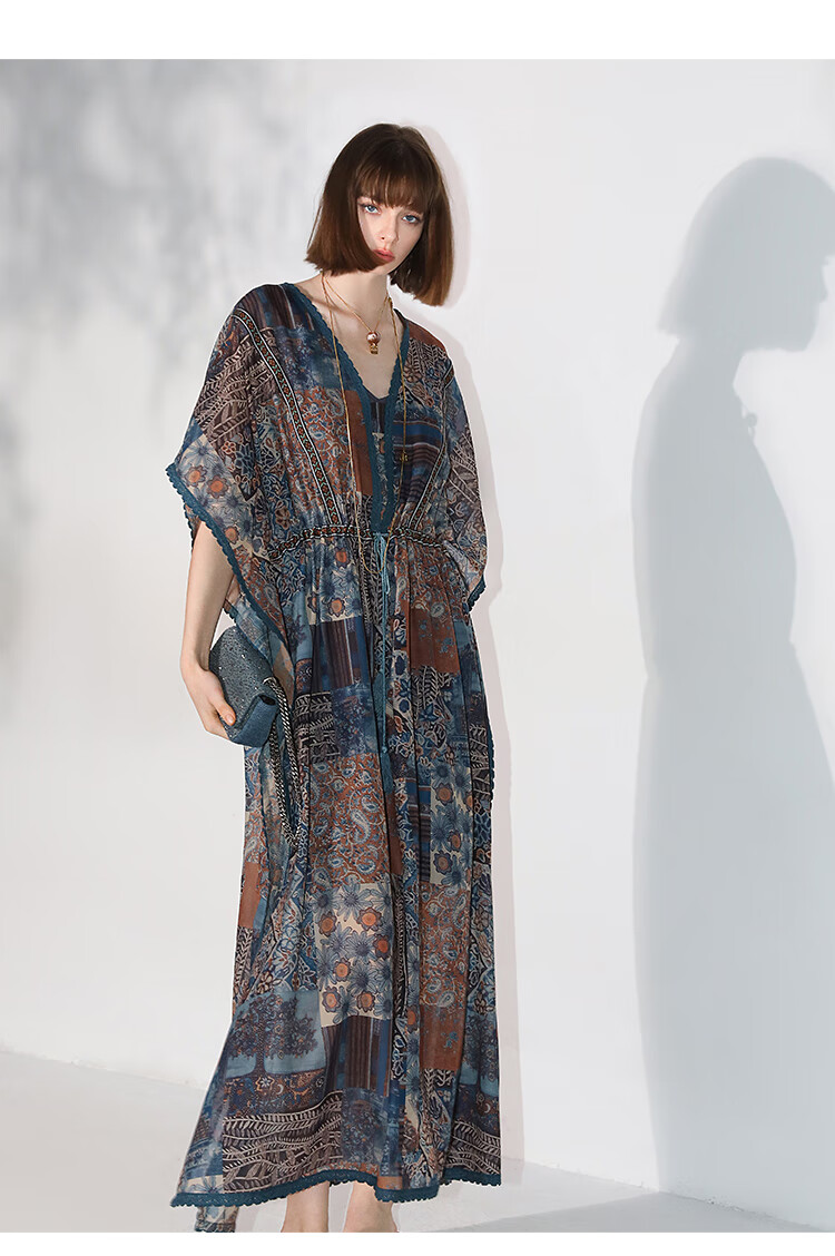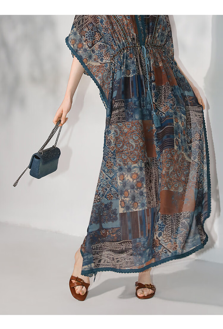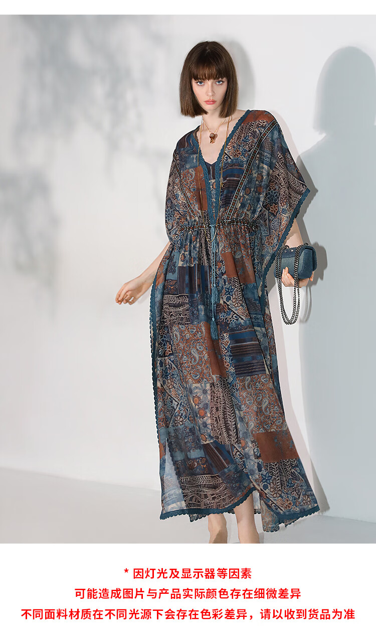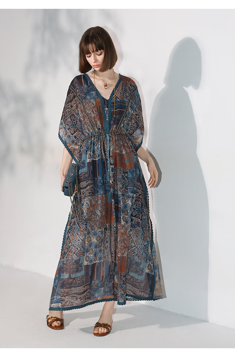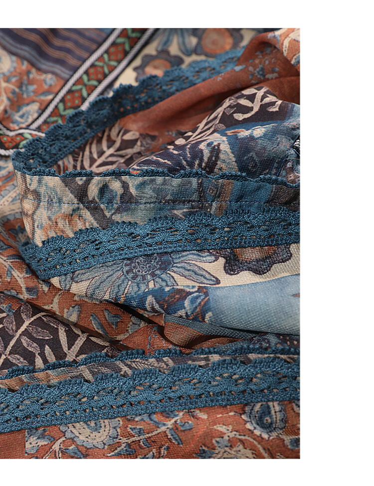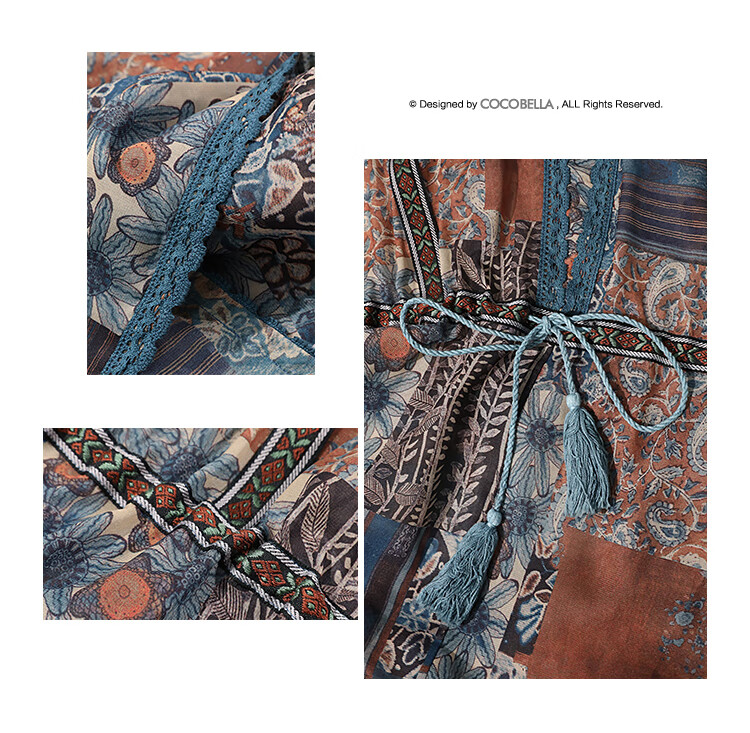 COCOBELLA民族风印花绒雪纺连衣裙7米+蕾丝镶边长裙FR7067