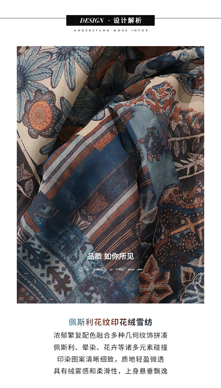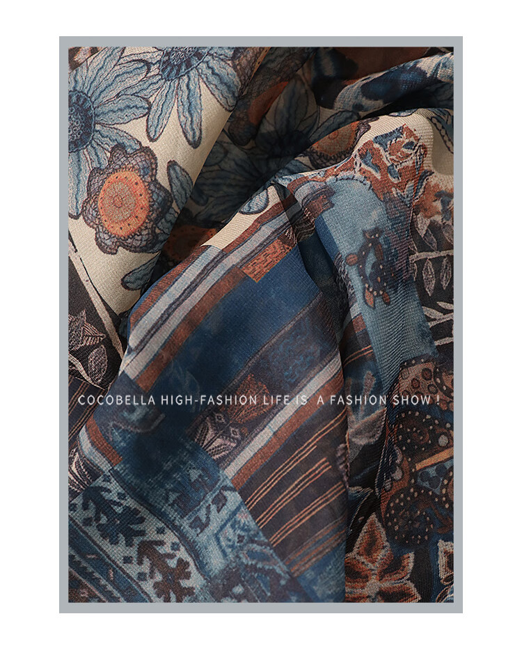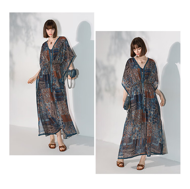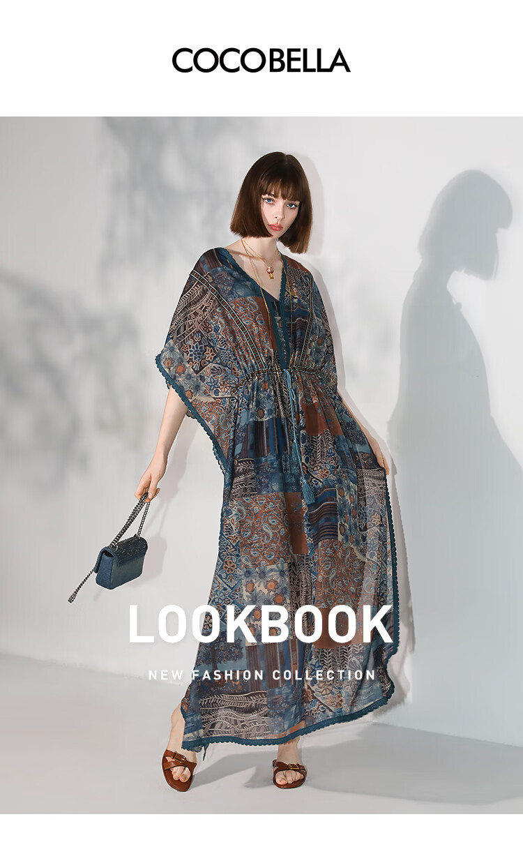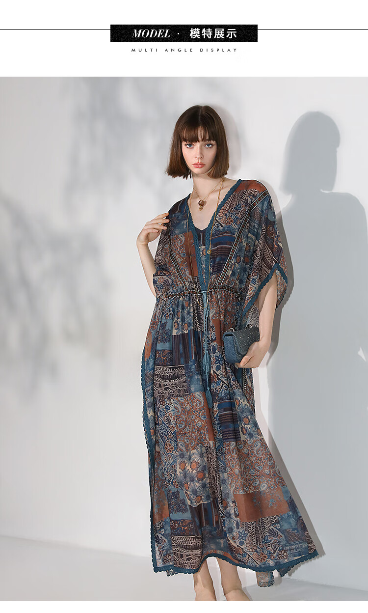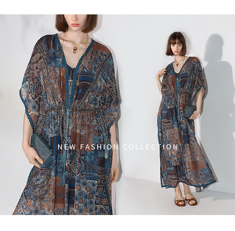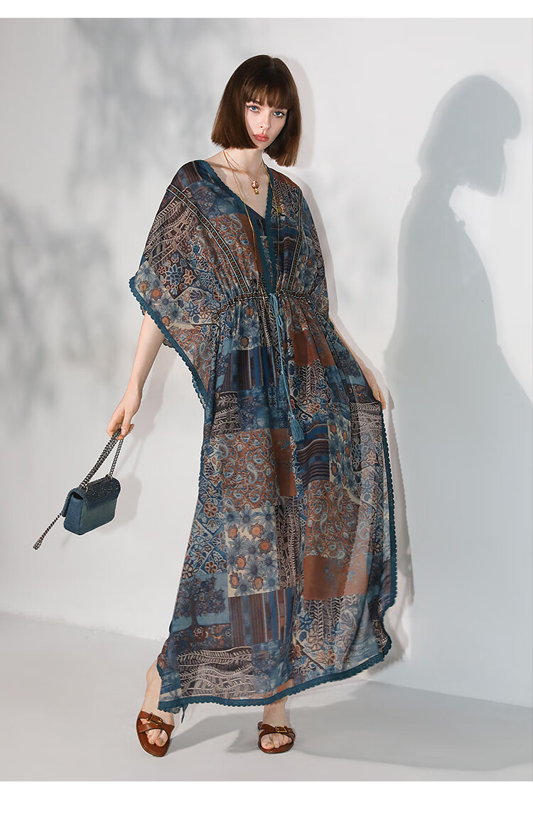 COCOBELLA民族风印花绒雪纺连衣裙7米+蕾丝镶边长裙FR7067