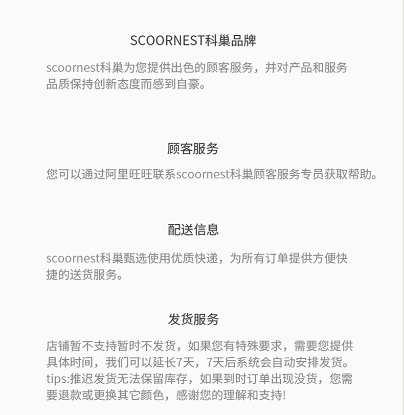 - Scoornest始终秉承给每一位宝宝送去科学的、关心的、创新的成长体验,通过提供商品和服务,使顾客形成守护、发展、巩固这种弥足珍贵的亲情的爱。