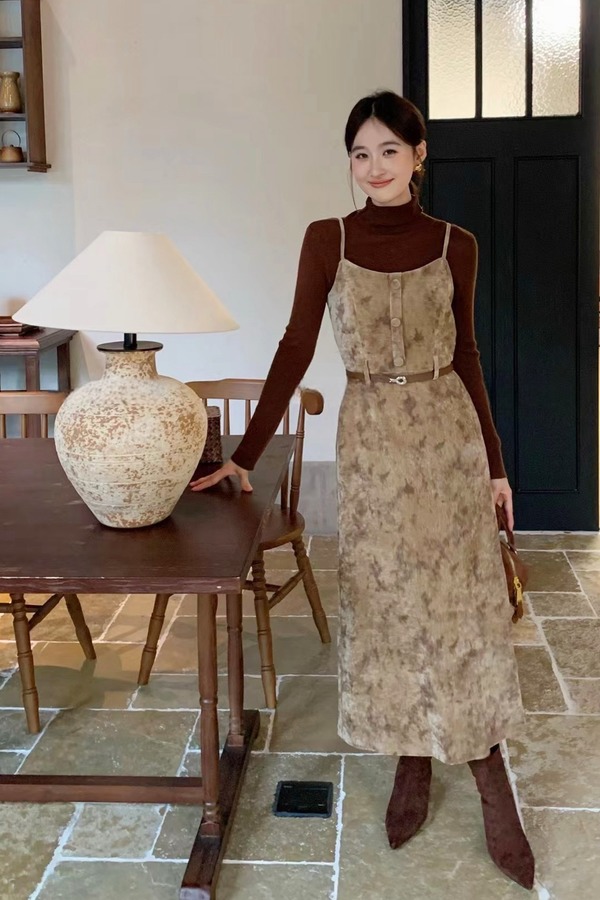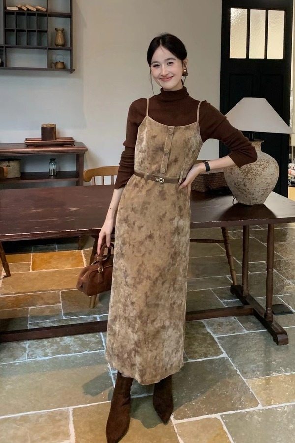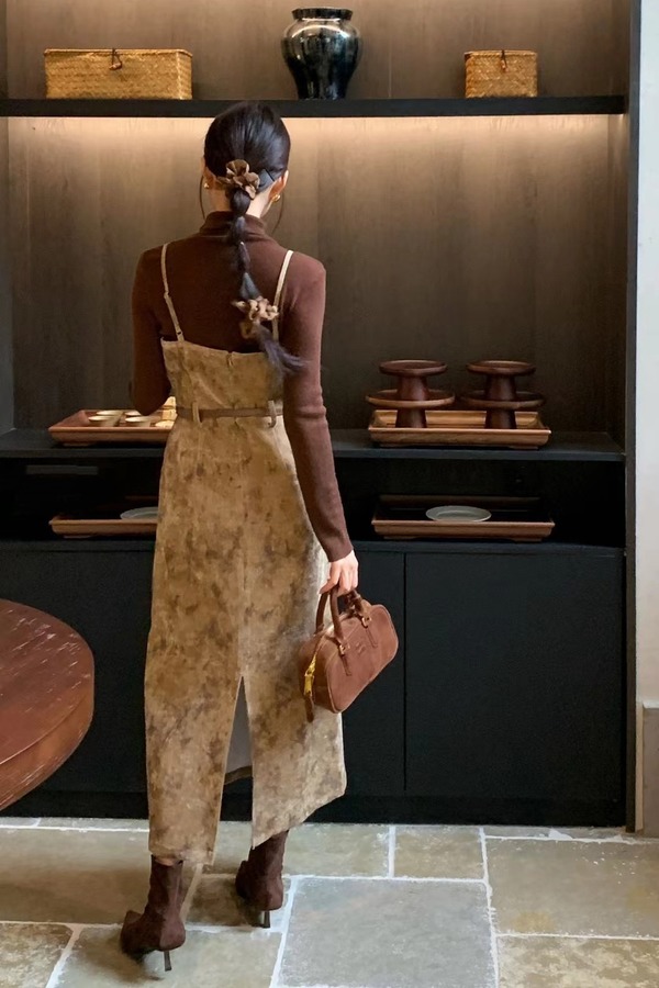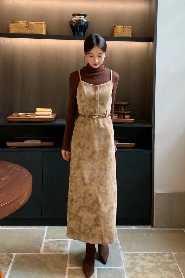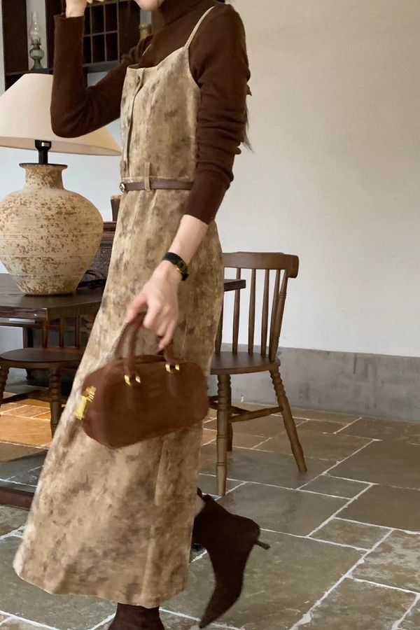 amadella 高级感收腰气质印花丝绒吊带连衣裙 21502