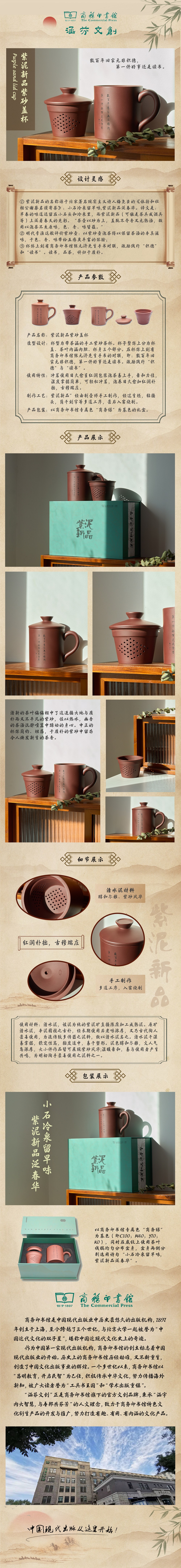 1.灵感来源:①紫泥新品的名称由来,北宋著名现实主义诗人梅尧臣的《依韵和杜相公谢蔡君谟寄茶》:小石冷泉留早味,紫泥新品泛春华。译文是:早春的味道还留在小石头和冷泉里,而紫泥新品(可能是茶具或酒具等)上泛着春天的光彩。“茶壶以砂为上,盖既不夺香又无熟汤,故用以泡茶不失原味,色、香、味皆蕴。”②、明代李渔这般评价紫砂壶:以紫砂壶泡茶得以保留茶汤的本真滋味,于色、香、味带给五感更丰富的体验;③、杯体上刻有商务印书馆张元济先生手书对联,激励践行“积德”和“读书”。读书,品茶,终归于质朴。清新的茶叶偏偏相中了这连接大地与质朴而又不平凡的紫砂,佐以热水,幽香的茶汤沉静喧嚣中躁动的身心。中正的杯体简约、坦荡,于质朴的紫砂中留存令人焕发新生的茶香。