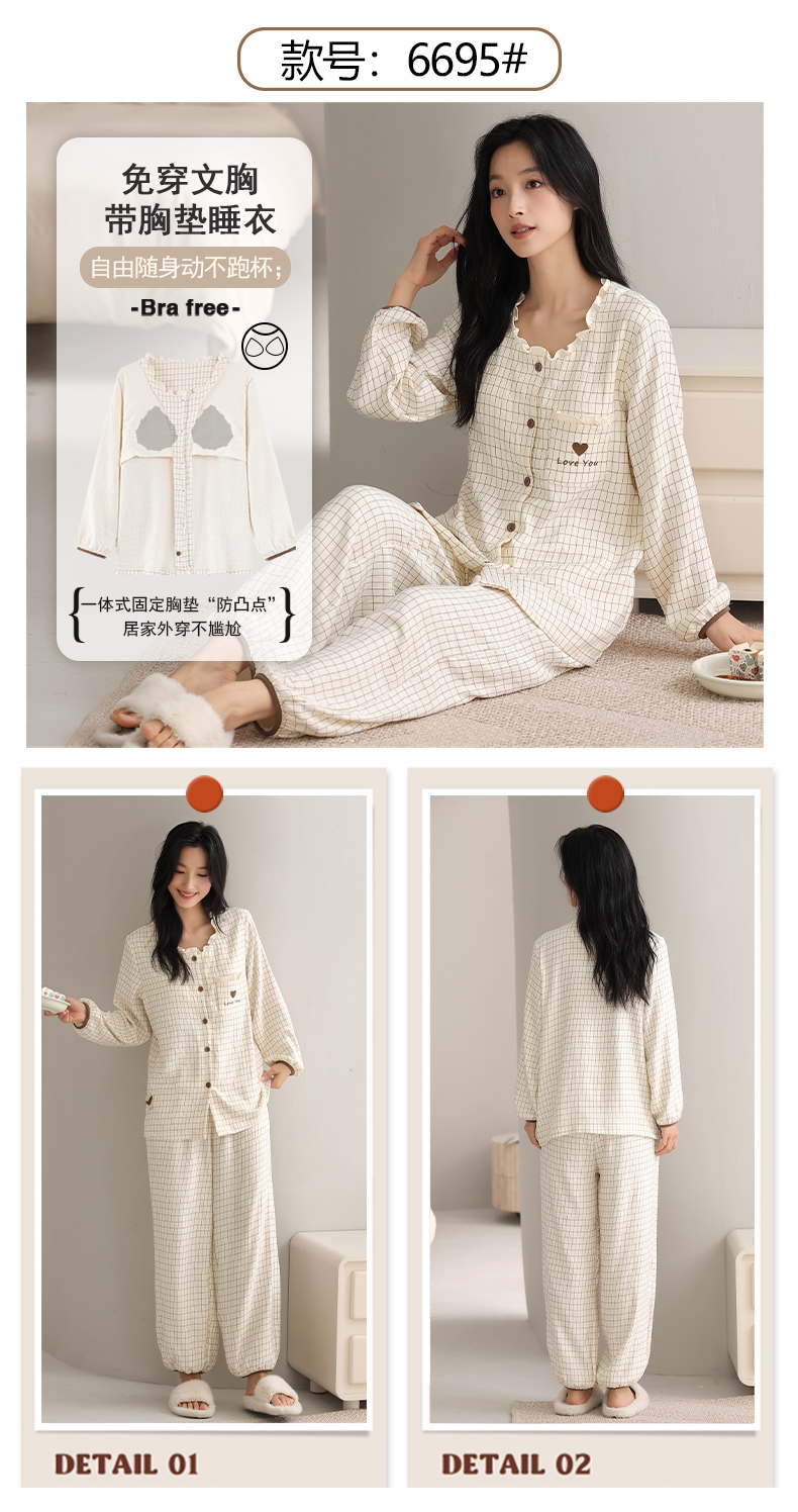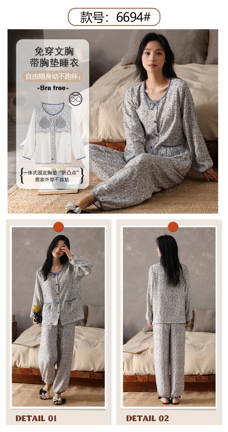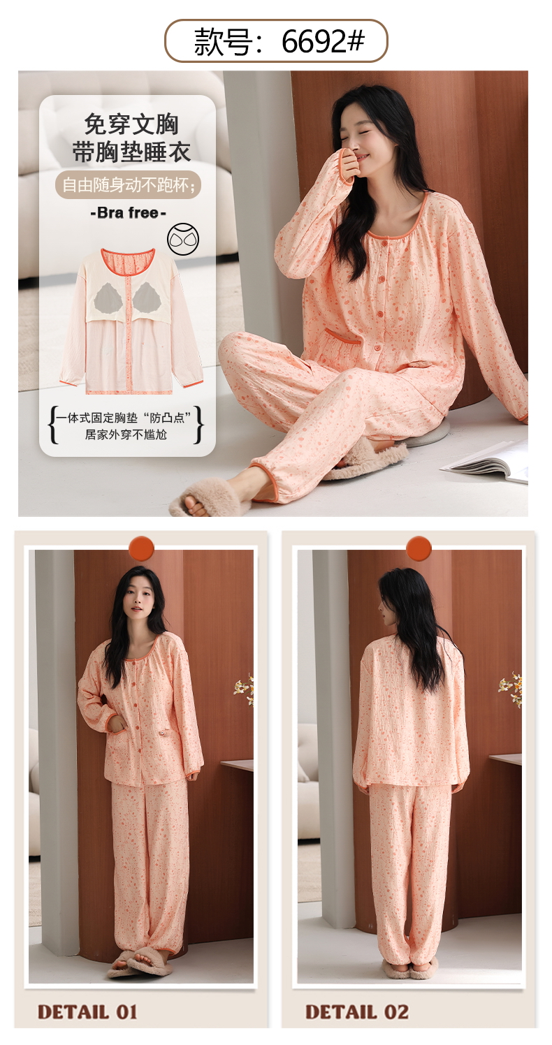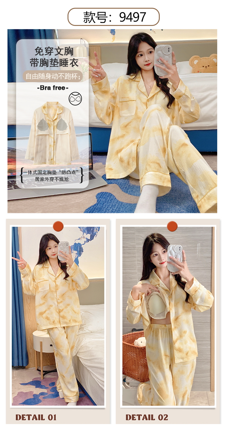 自然醒月汐(带胸垫)女士家居服云朵棉长袖长裤开衫睡衣QH