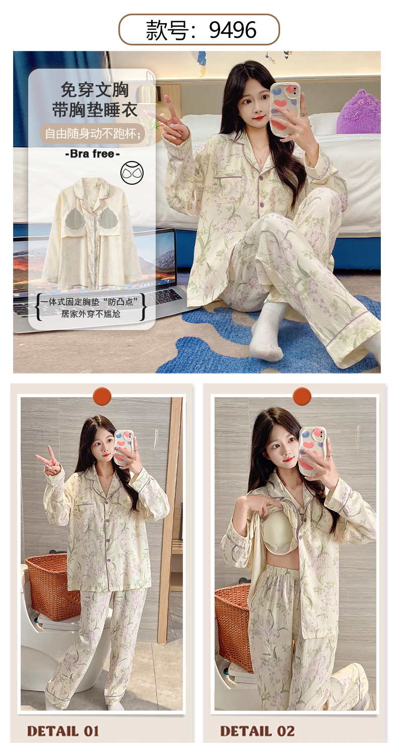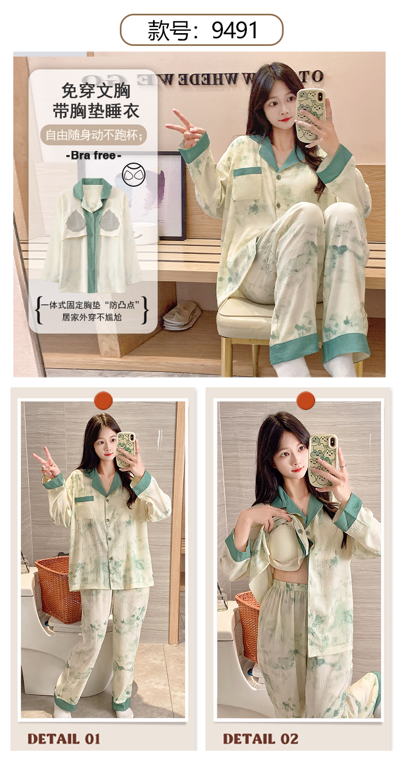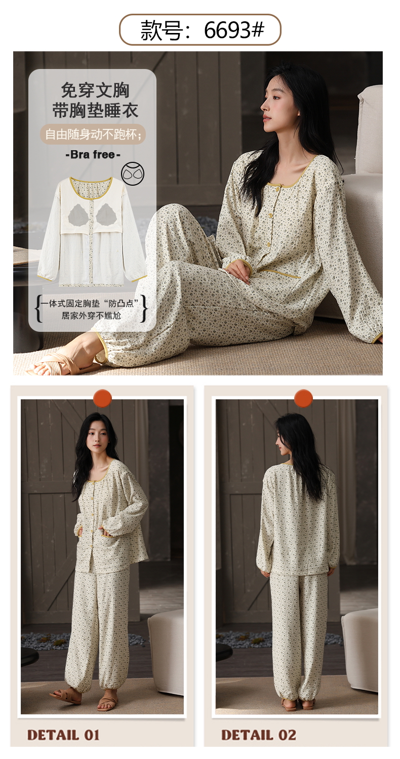 自然醒月汐(带胸垫)女士家居服云朵棉长袖长裤开衫睡衣QH