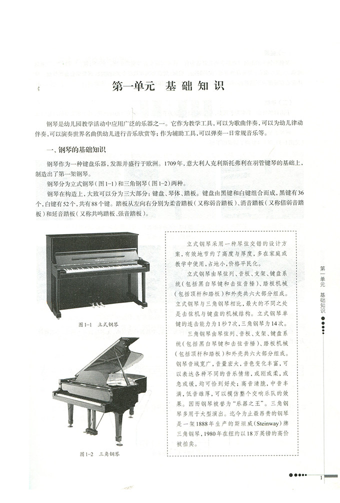 本书适用于高职高专学前教育专业技能课,分为上下两册,上册侧重钢琴基础,内容为练习曲、乐曲、世界名曲,曲目选排紧密结合儿歌伴奏和幼儿园常规音乐;下册侧重伴奏、弹唱及幼儿园音乐,素材选择与幼儿园实际教学紧密联系,并增加常规音乐、背景音乐、旋律创编内容。