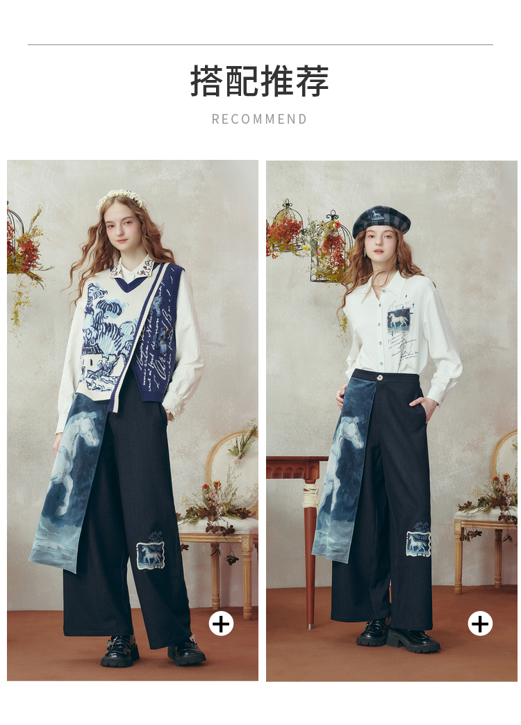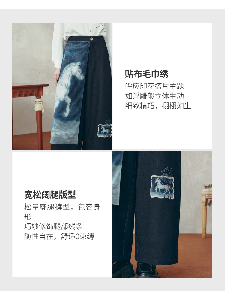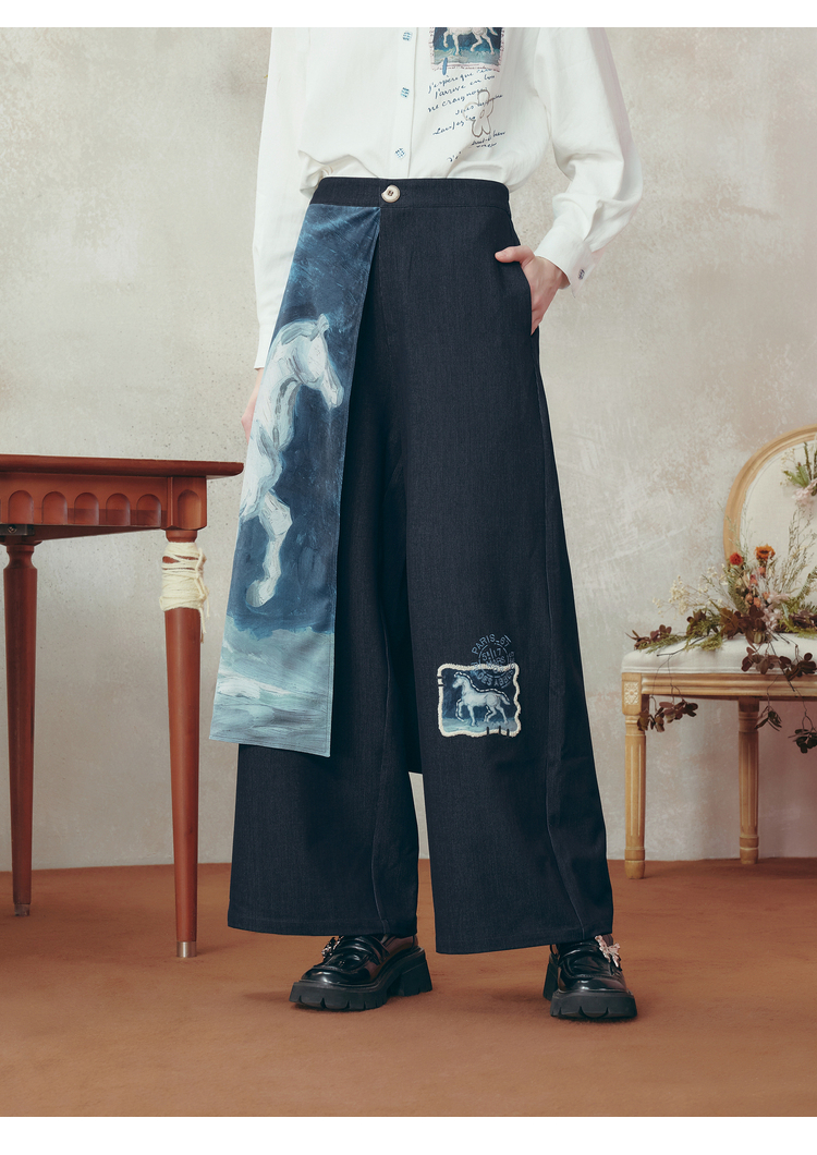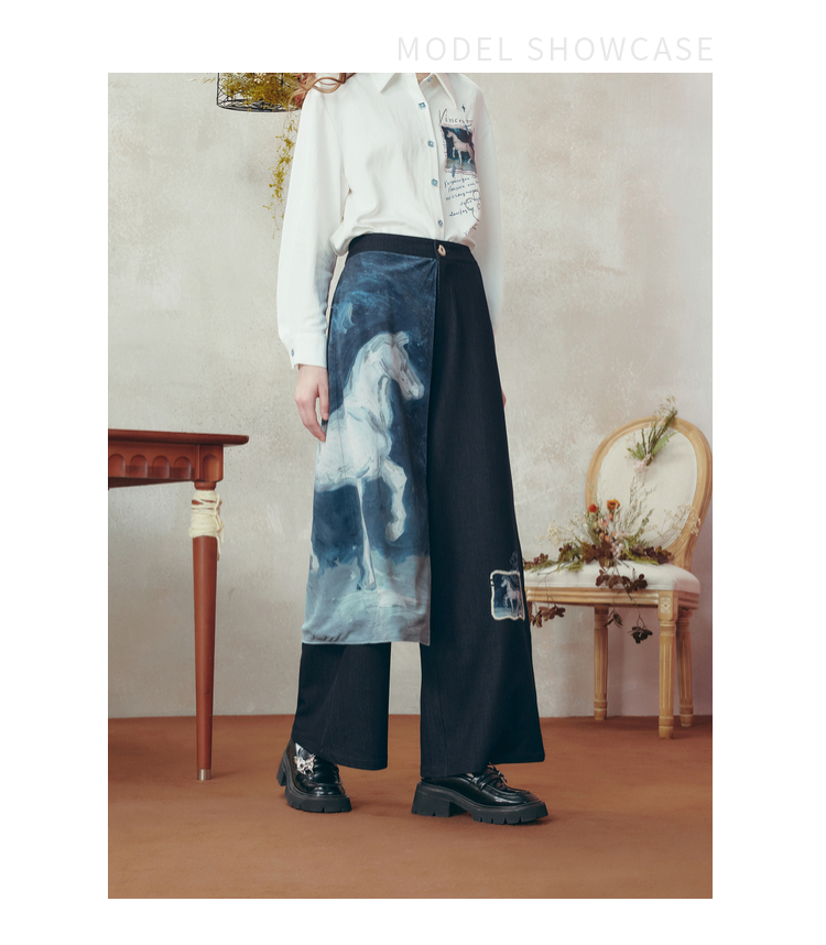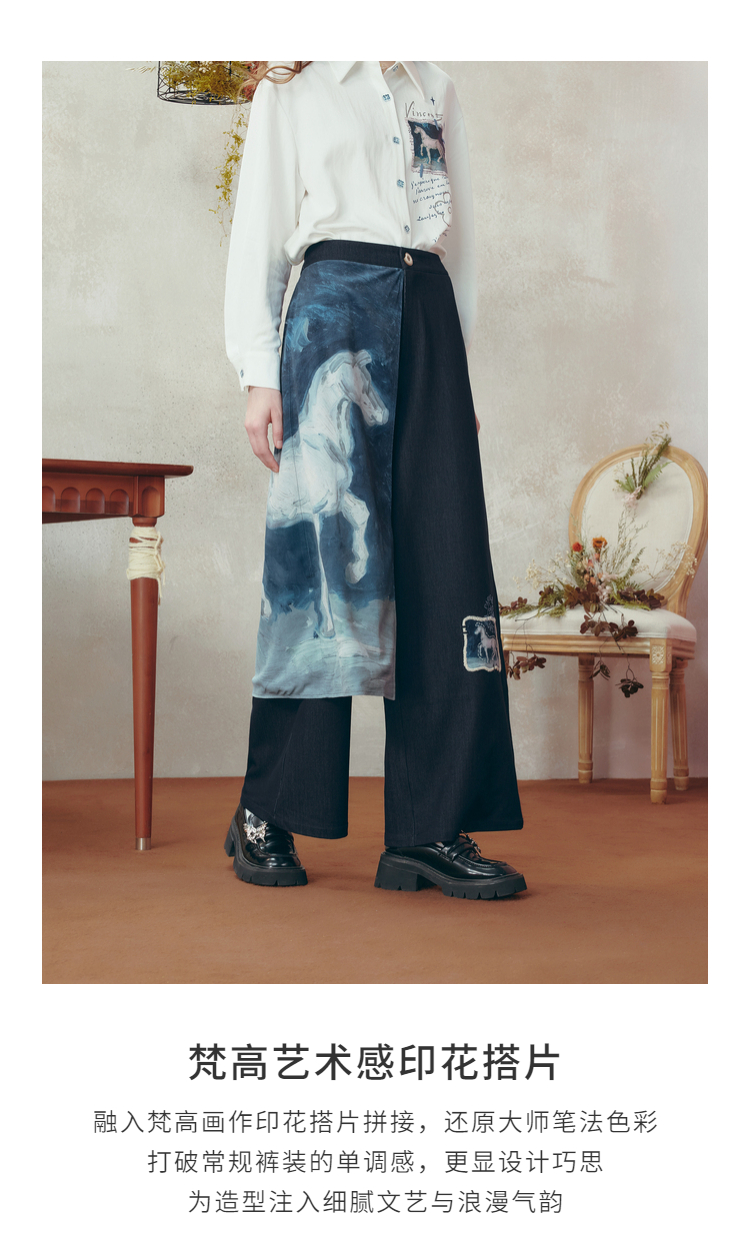 两三事梵高文艺梦境巡游2025冬季新款印花拼接假两件阔腿休闲裤女
