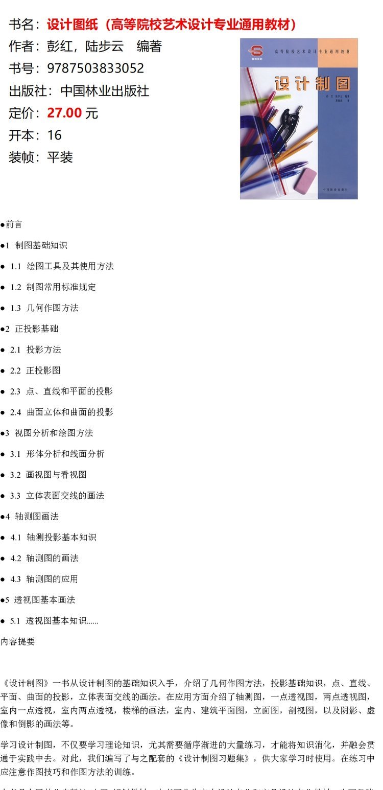 设计制图 彭红 陆步云 3305高等院校艺术设计专业通用教材 基础知识入手几何作图方法投影基础知识点直线平面曲面的投影 中国林业