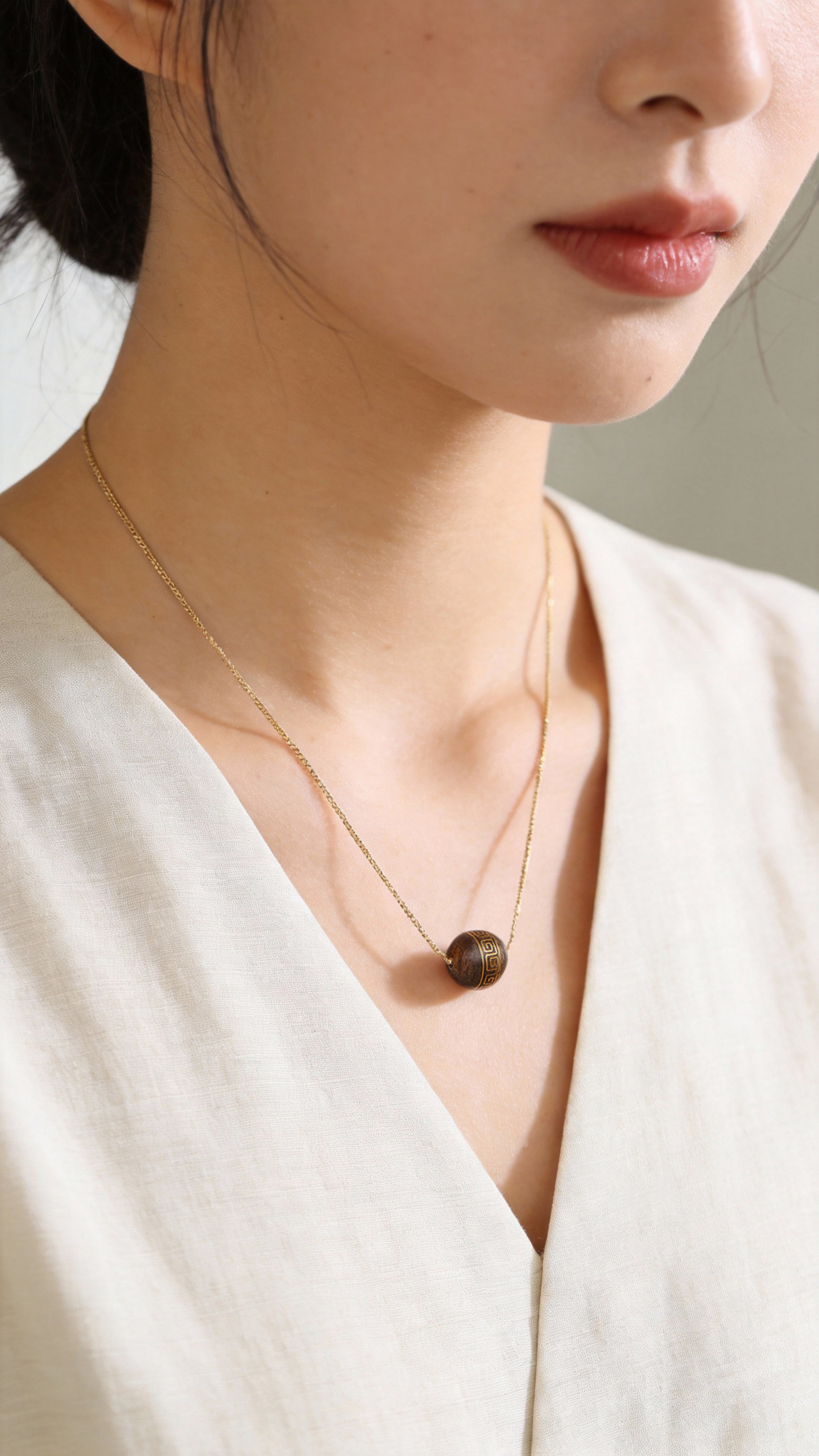 以文莱沉香的天然圆珠为底,错金部分选用中式回纹纹样(传统 “连绵不绝” 的意象),既保留了东方文化的底蕴,又用极简的单株形态适配现代穿搭,是 “传统纹样的轻量化表达。