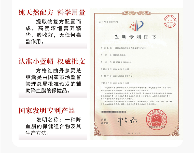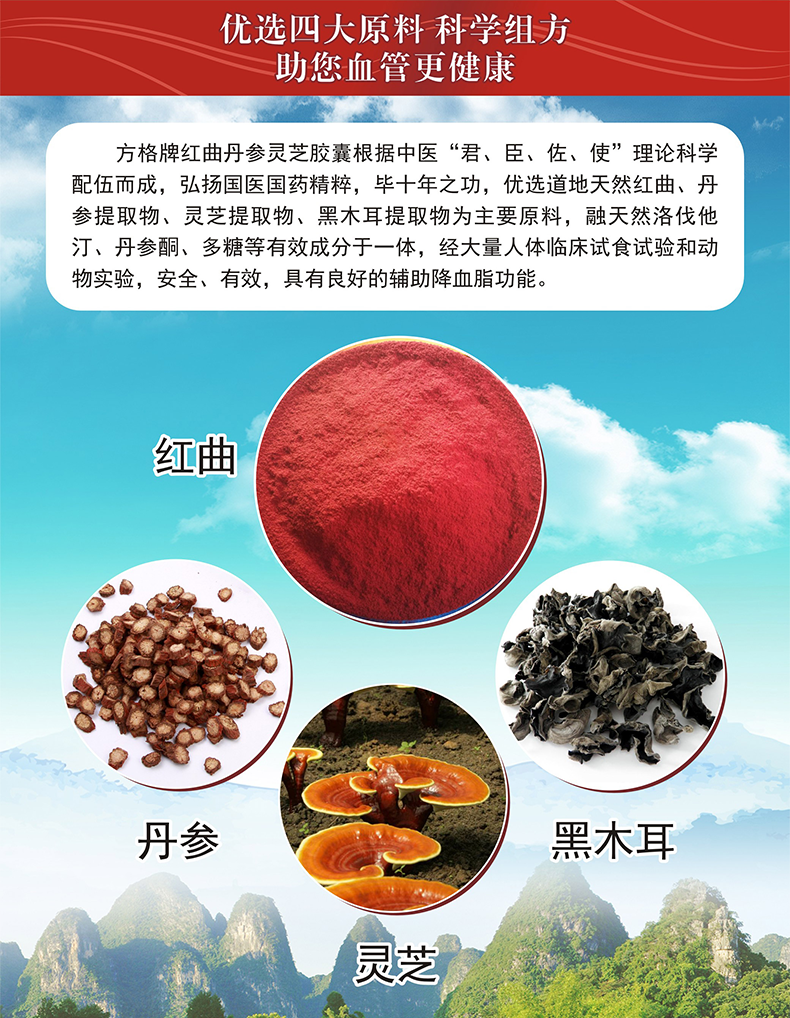 方格 辅助降血脂 红曲丹参灵芝胶囊 400mg*60粒*3瓶