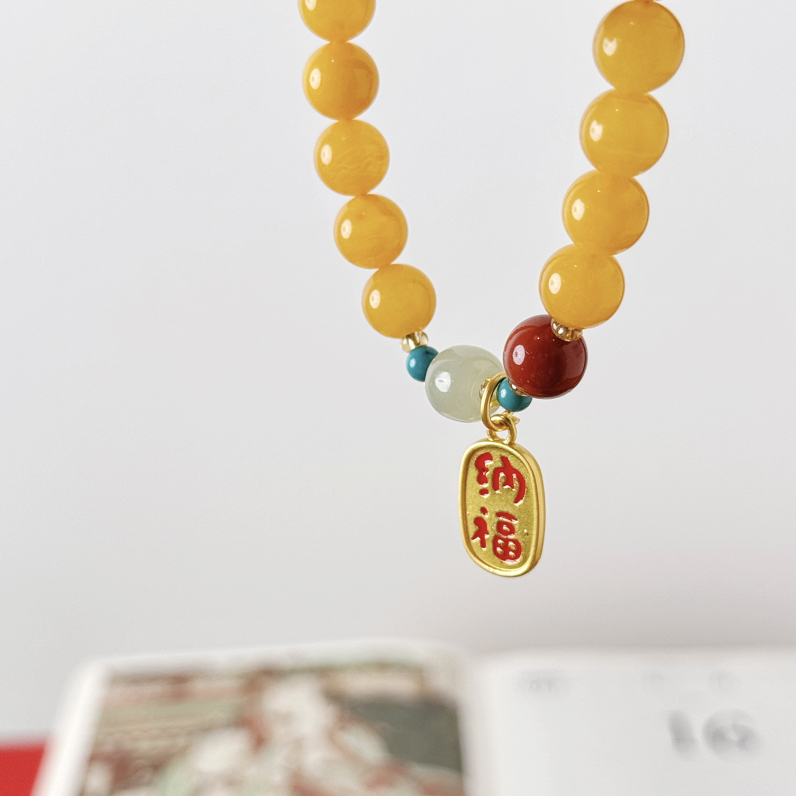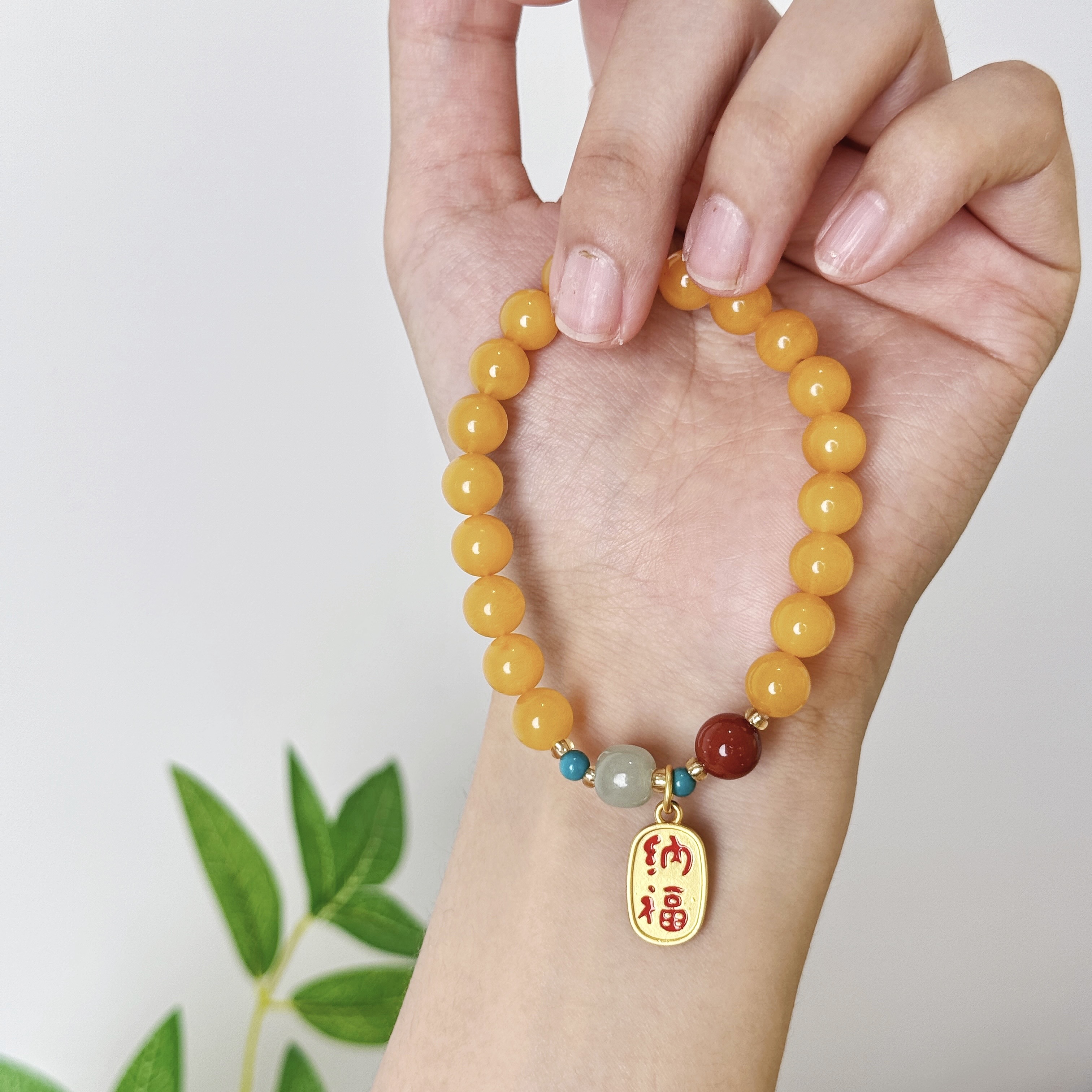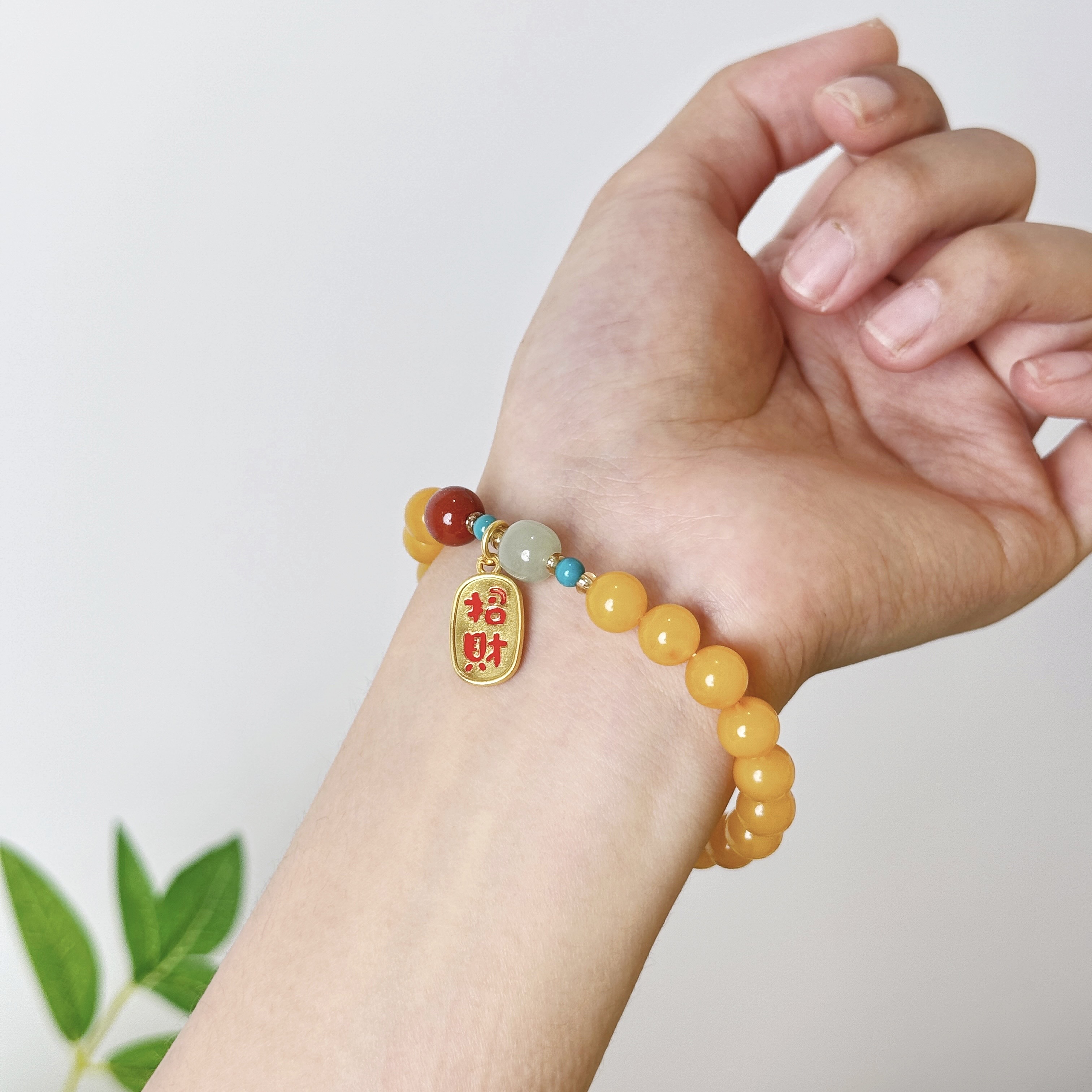 【敦煌晏宁·鸡油黄蜜蜡手串】敦煌福泽小众鸡油黄蜜蜡 单圈红玛瑙招财手串 复古新中式文艺