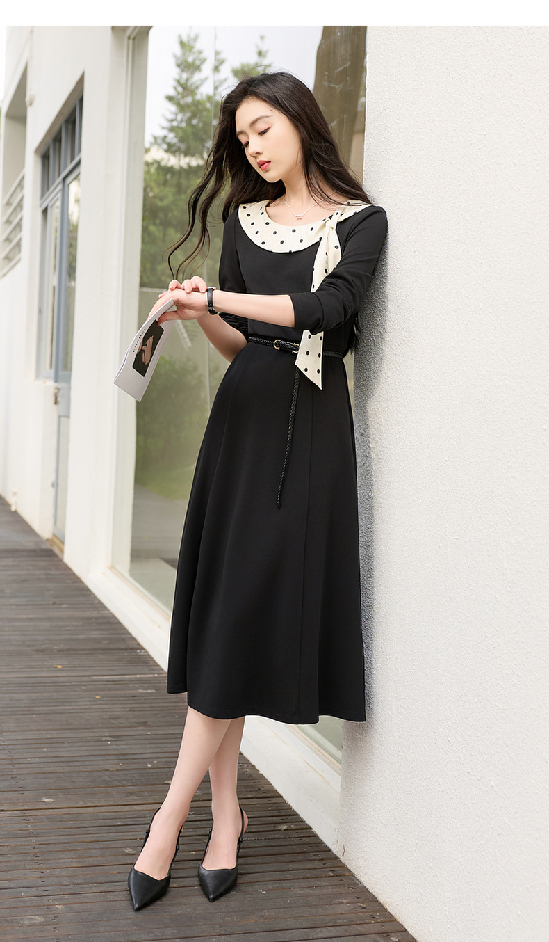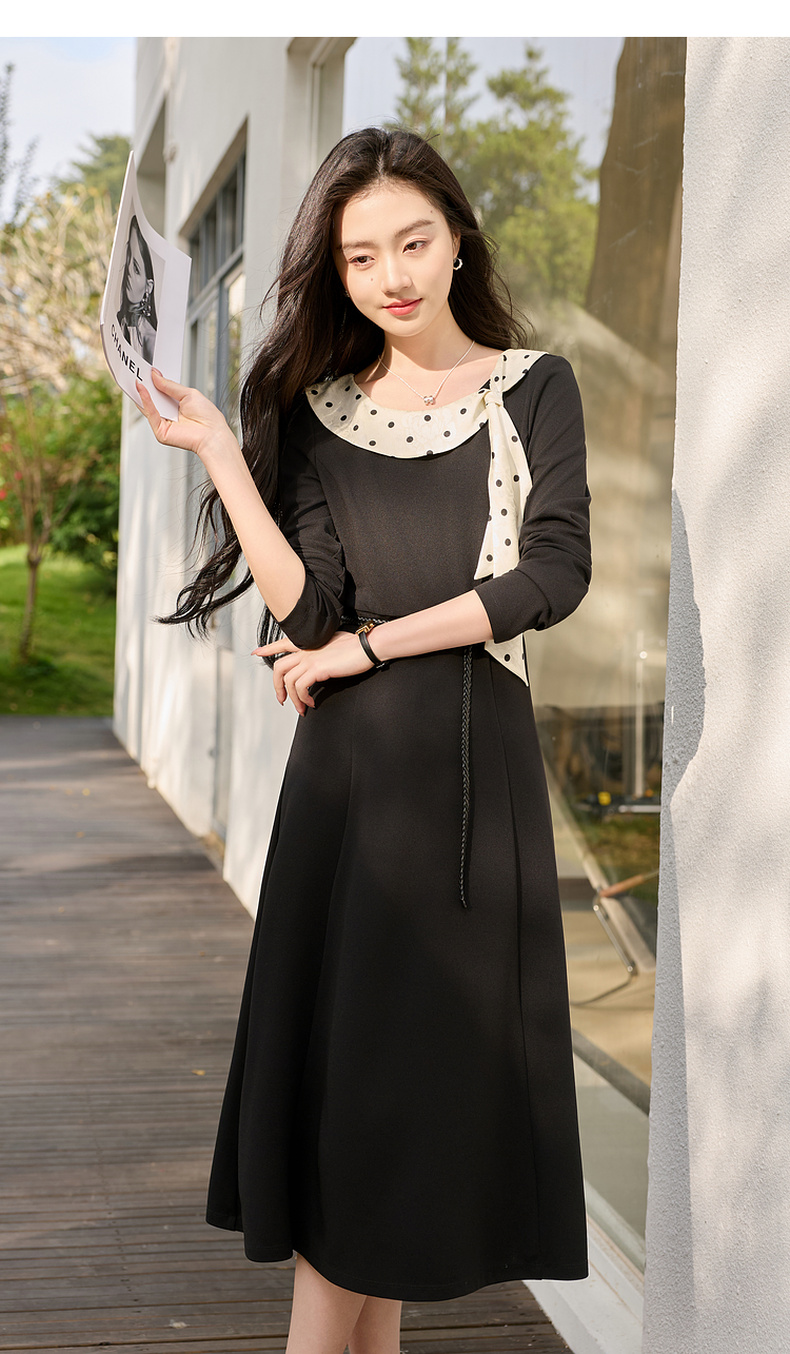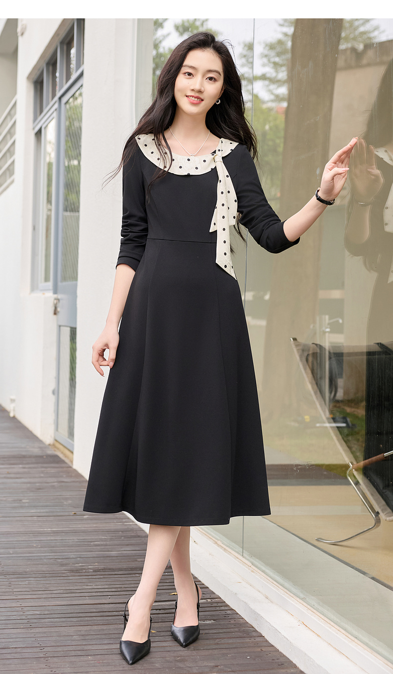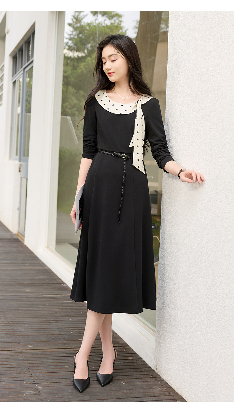 三彩2026春季新款法式连衣裙波点拼接长袖A字裙长裙优雅气质S