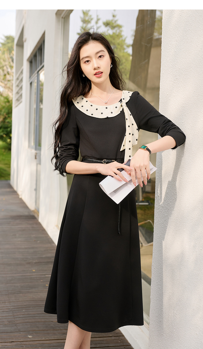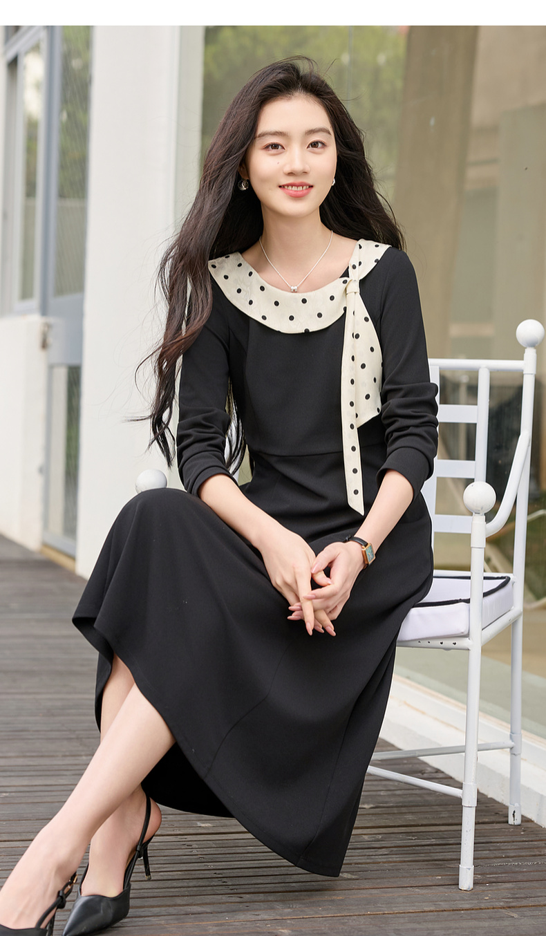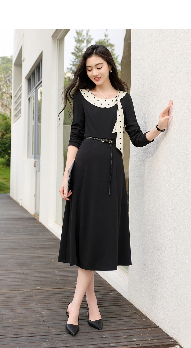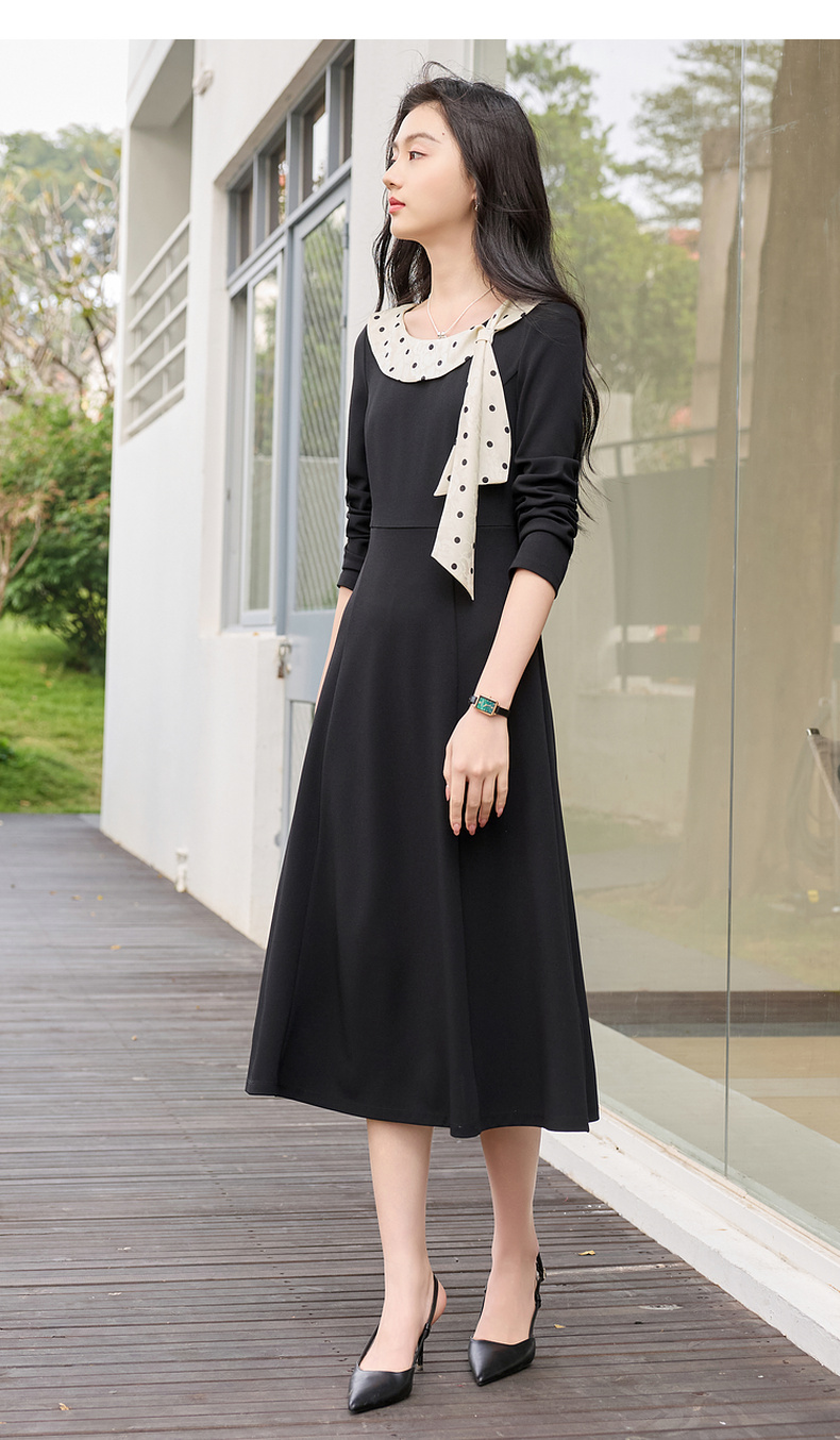 三彩2026春季新款法式连衣裙波点拼接长袖A字裙长裙优雅气质S