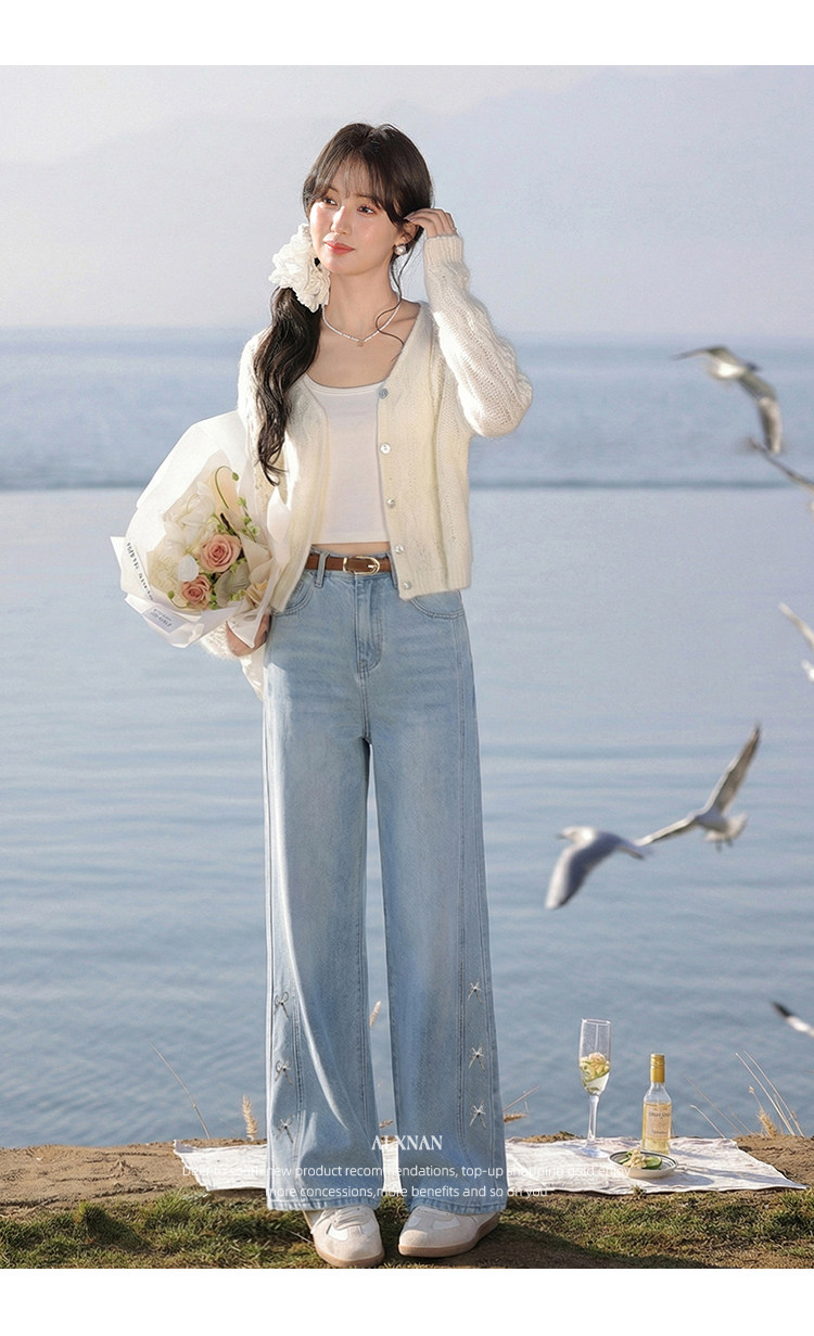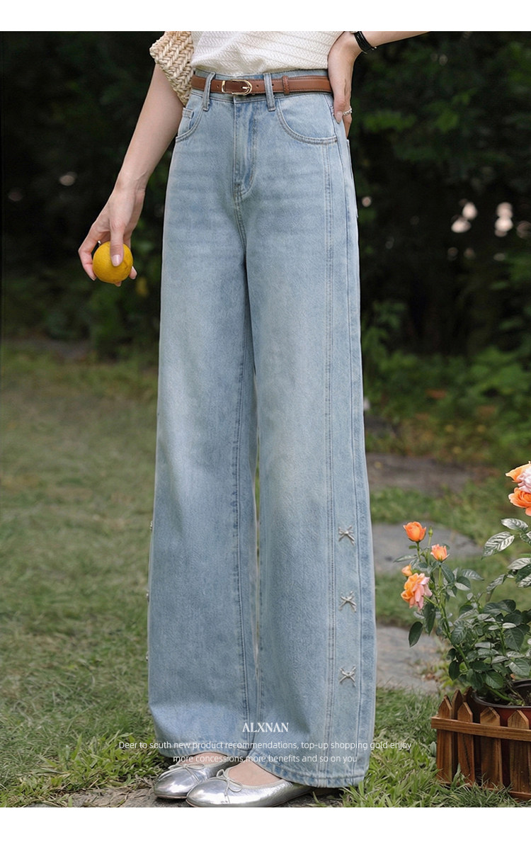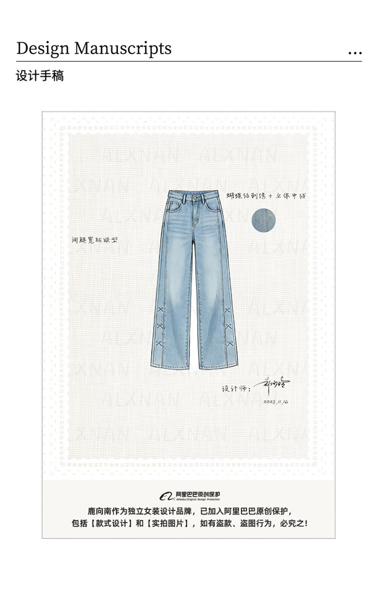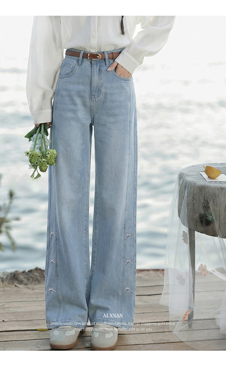 鹿向南「春日序章」蓝色直筒牛仔裤女春季蝴蝶结绣花显瘦高腰长裤