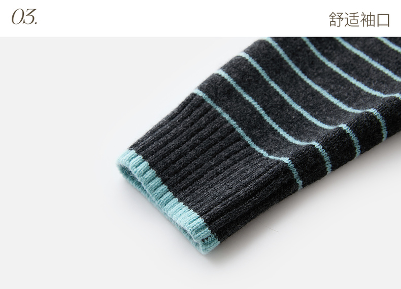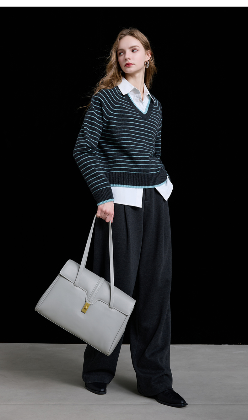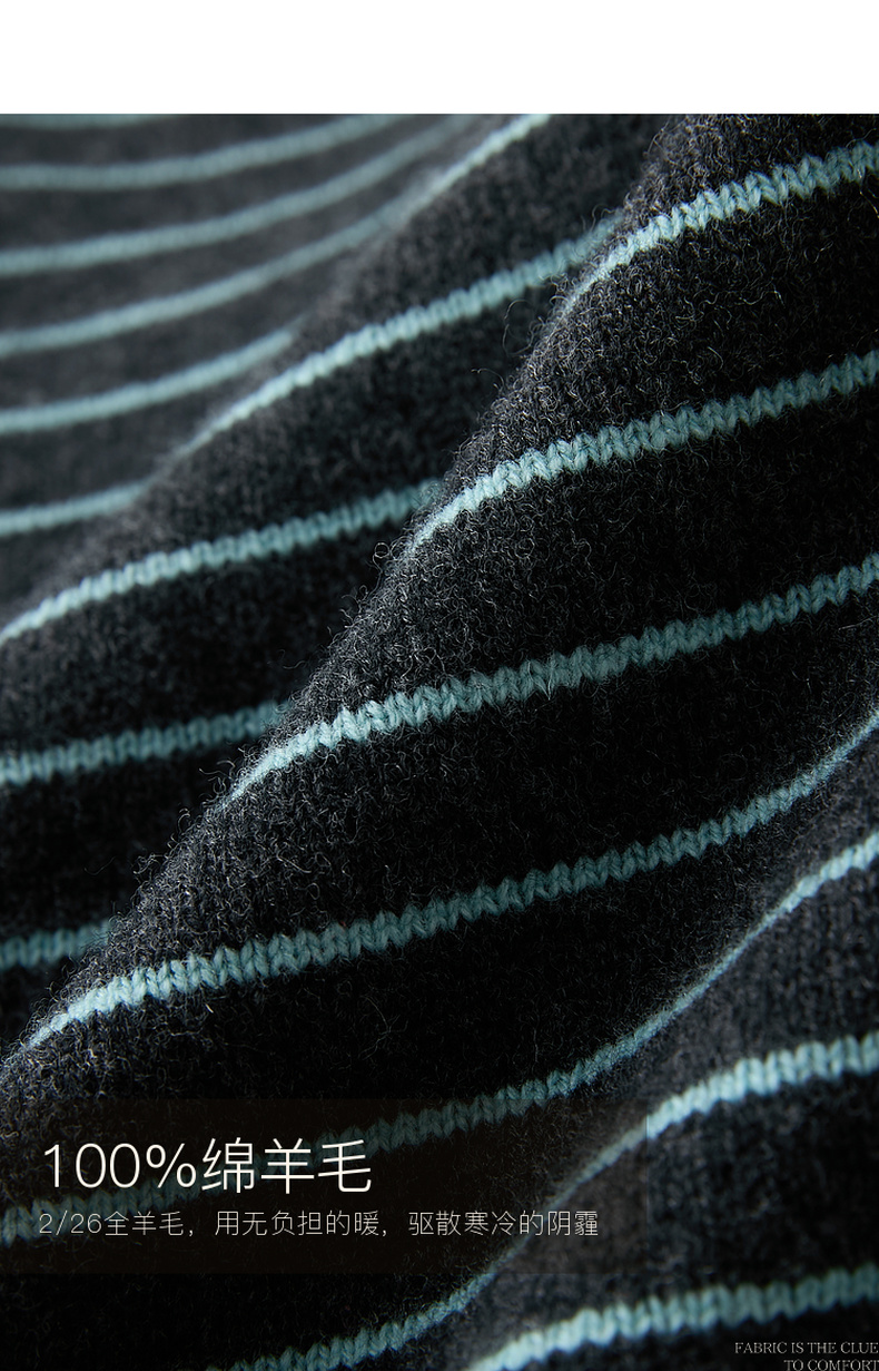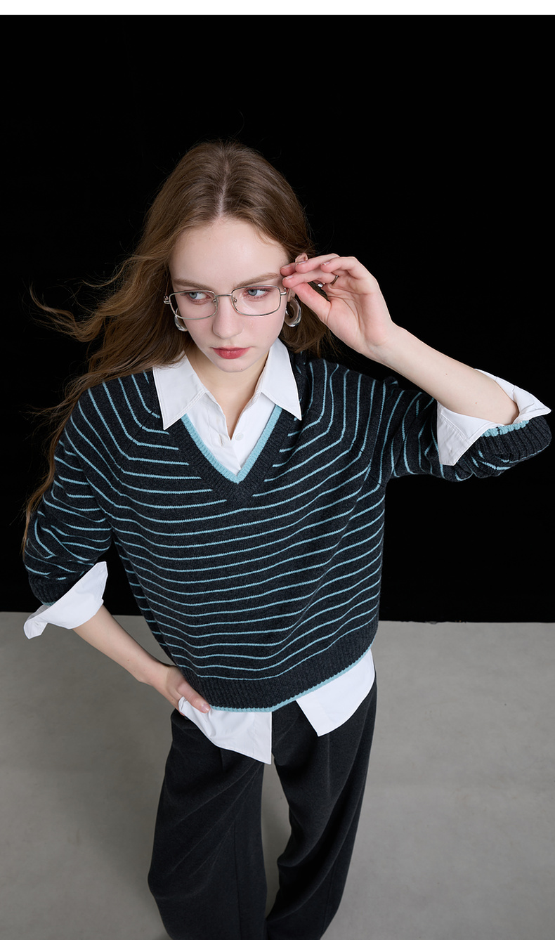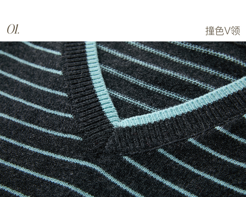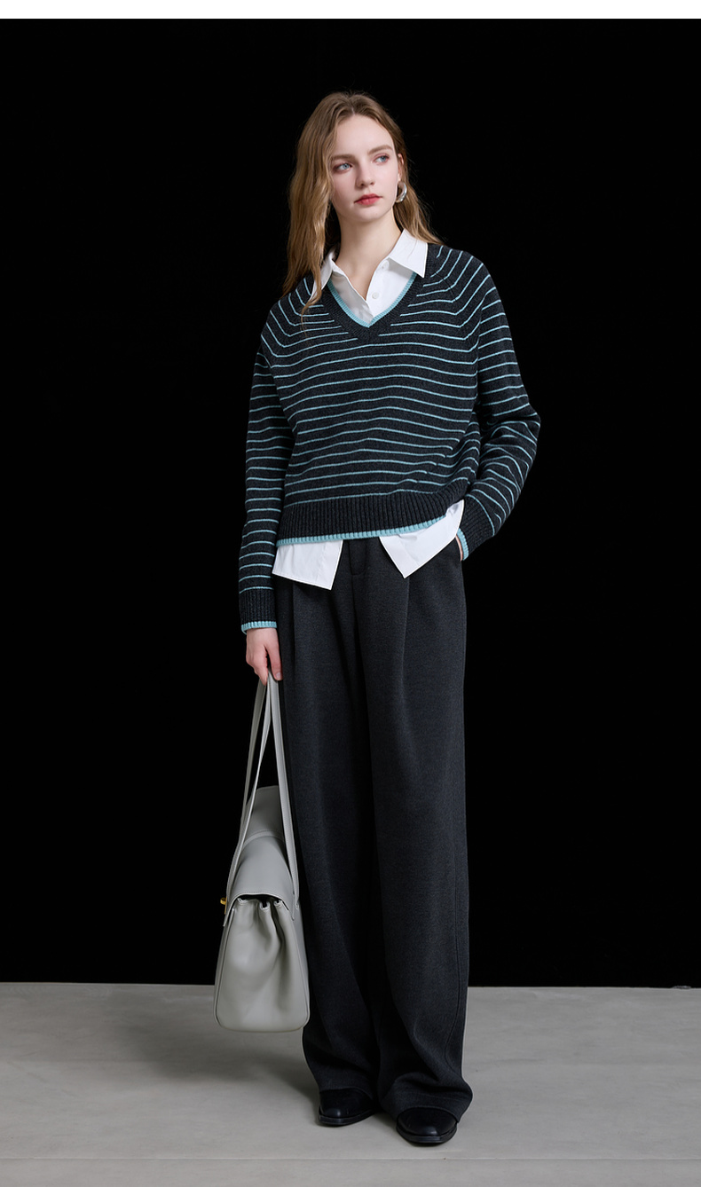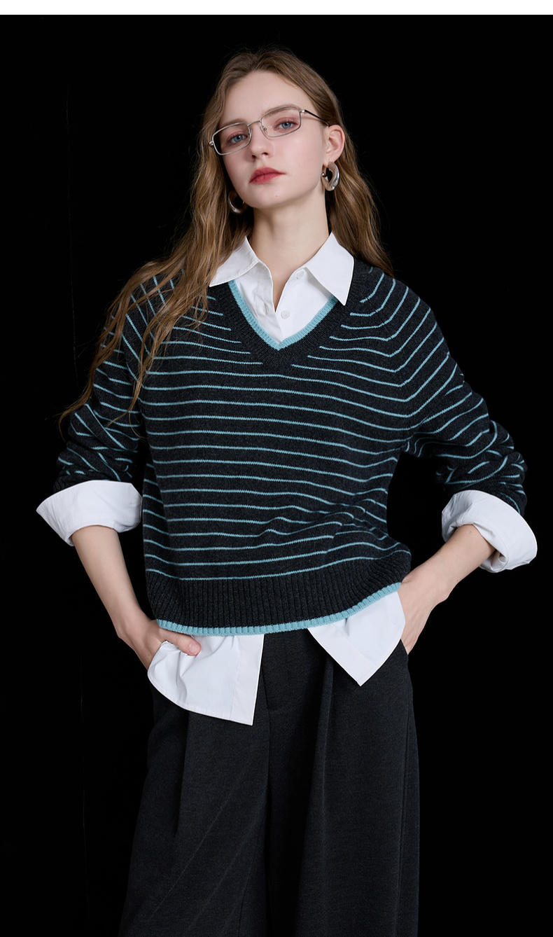 【100绵羊毛】三彩2025冬季新款V领条纹针织衫长袖套头宽松M