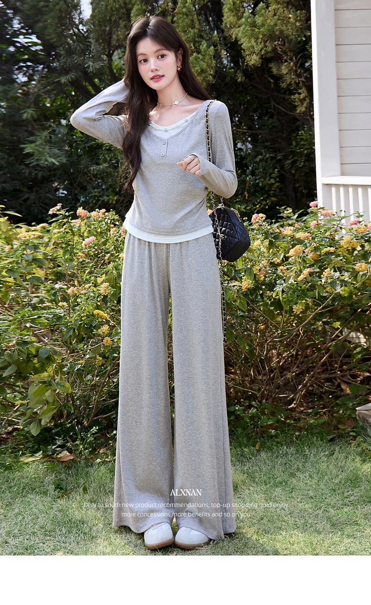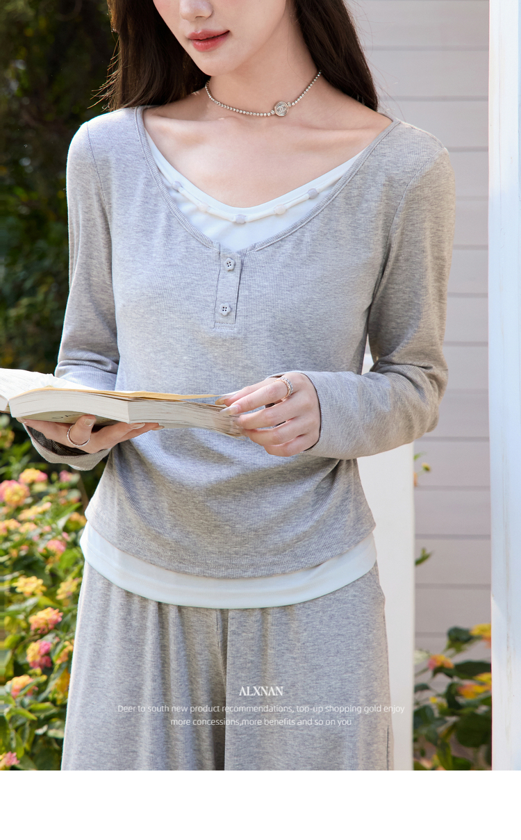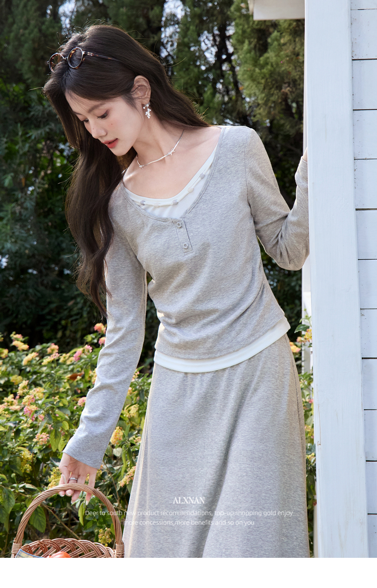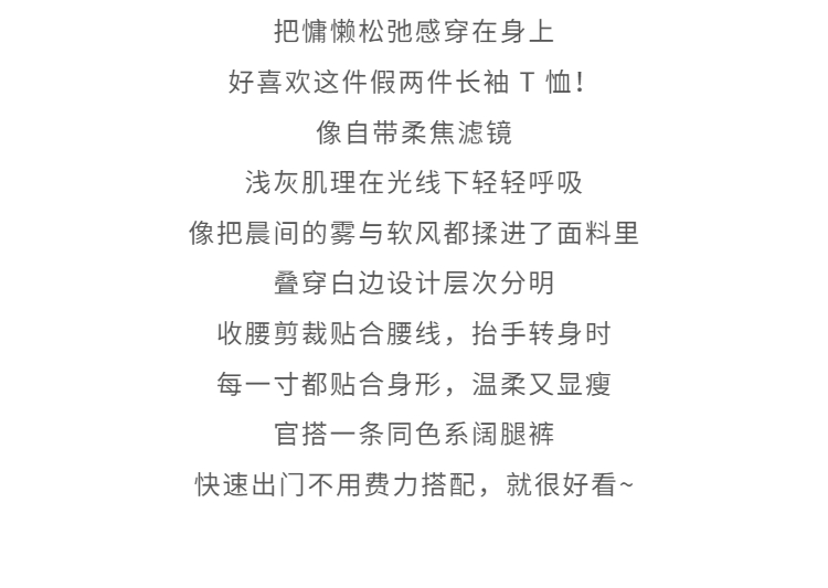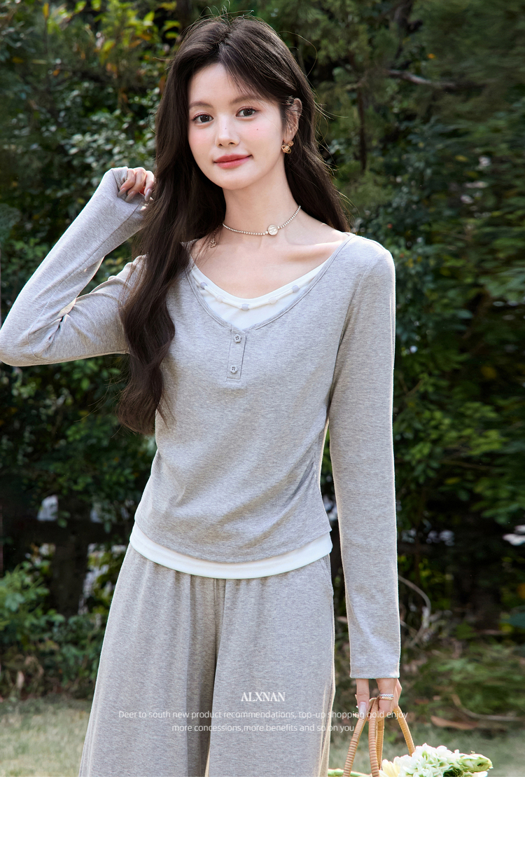 鹿向南「轻歌曼舞」灰色假两件休闲正肩长袖t恤女春新款短款上衣