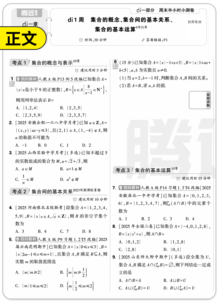 2026新版万唯出品】腾远高中周末半小时小测卷高一上册同步教材周测单元测期中期末试卷语文数学英语物理化学生物万唯中考