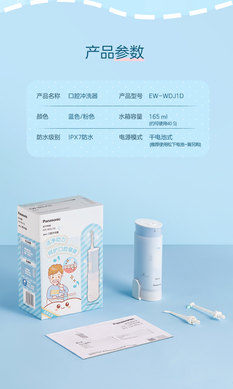 松下(Panasonic)冲牙器 儿童冲牙器(7岁及以上儿童) 伸缩便携冲牙器 干电池款EW-WDJ1DA405蓝色