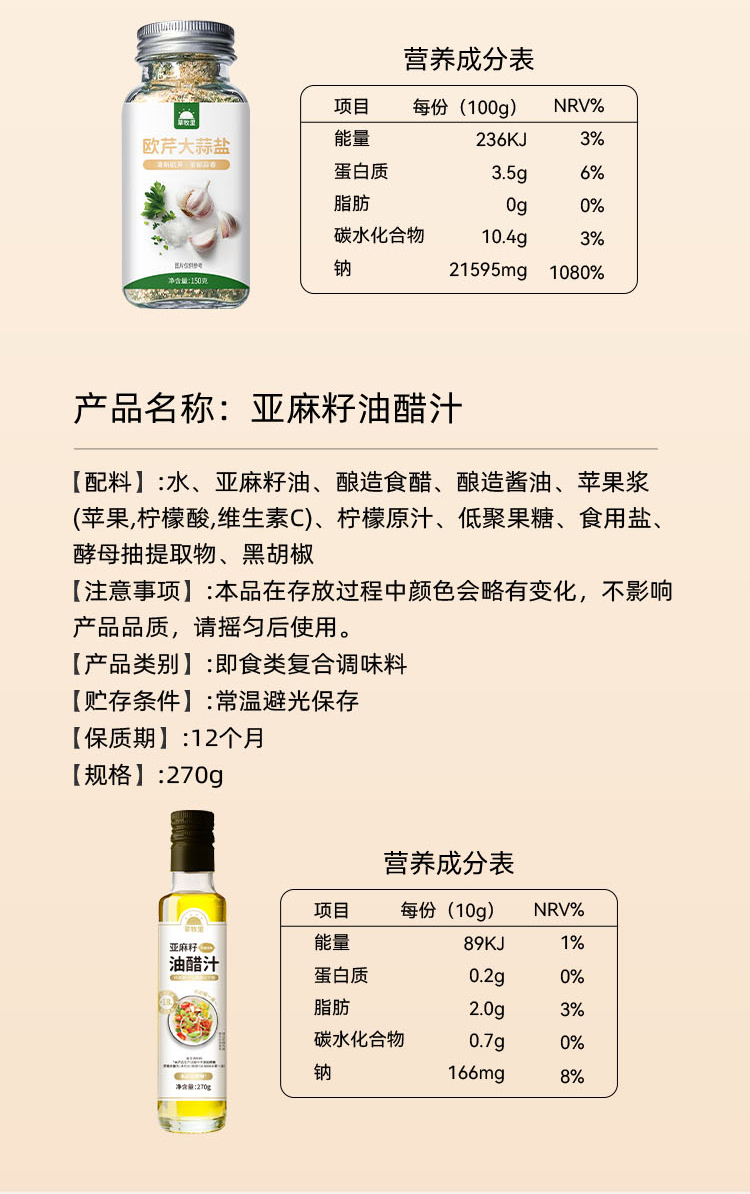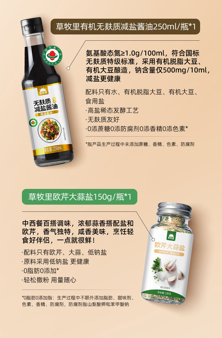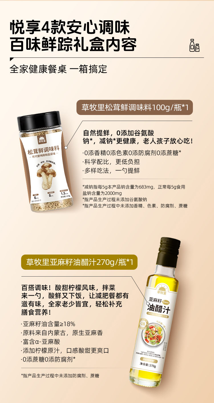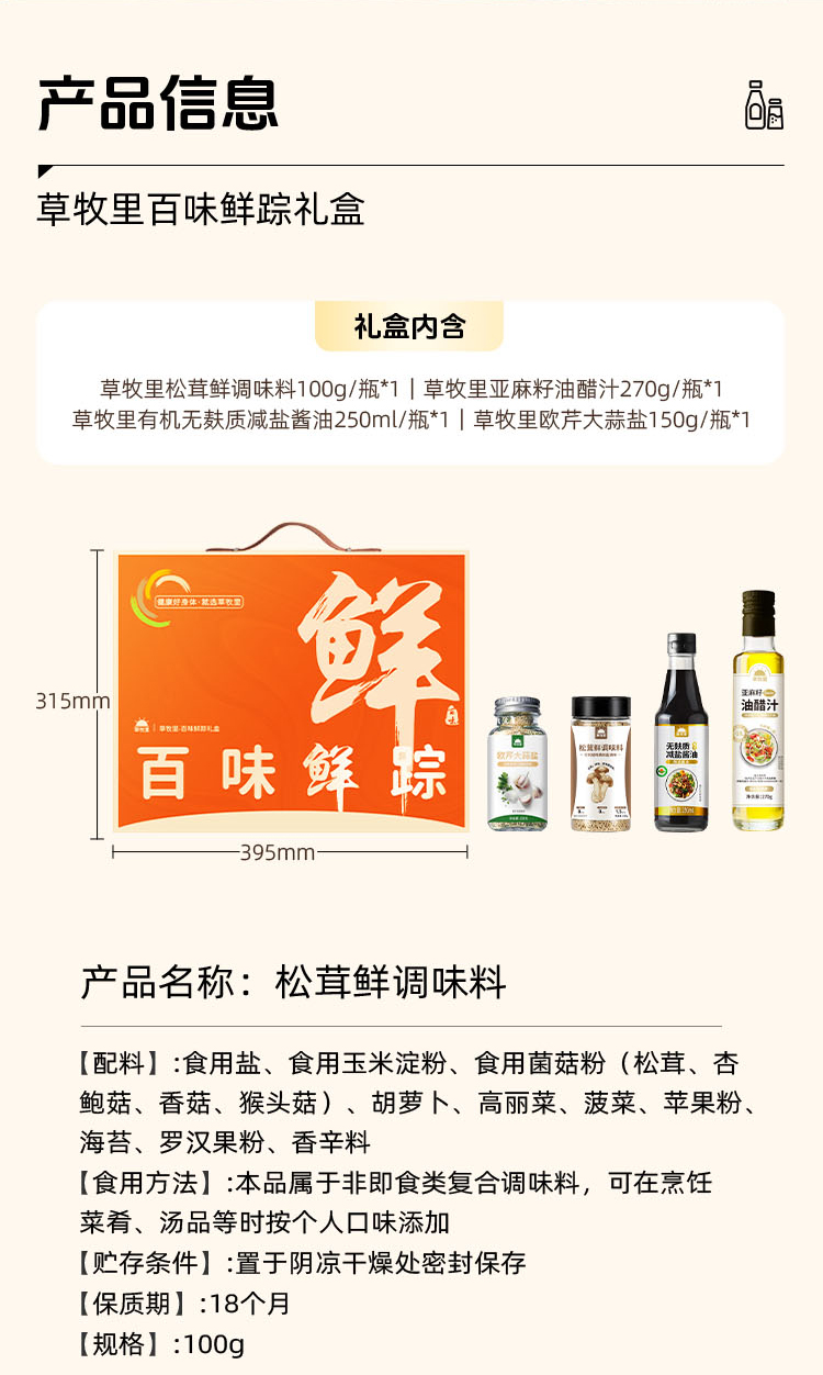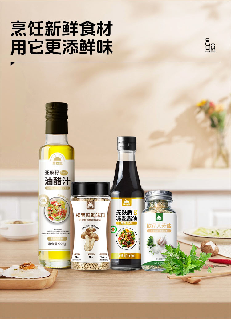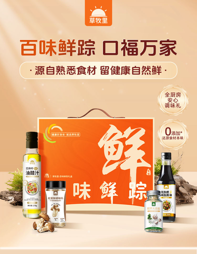 【1000积分+29】草牧里 百味鲜踪礼盒 (亚麻籽油醋汁*1+无麸质酱油*1+松茸鲜调味料*1+欧芹大蒜盐*1)( 油醋汁有效期至 25年12月31日)
