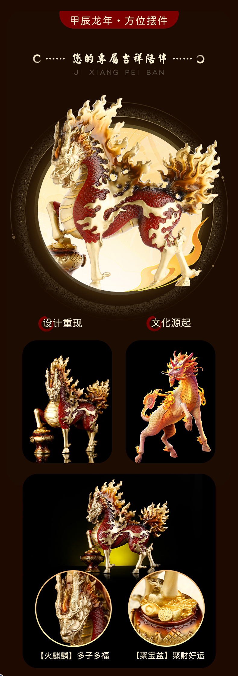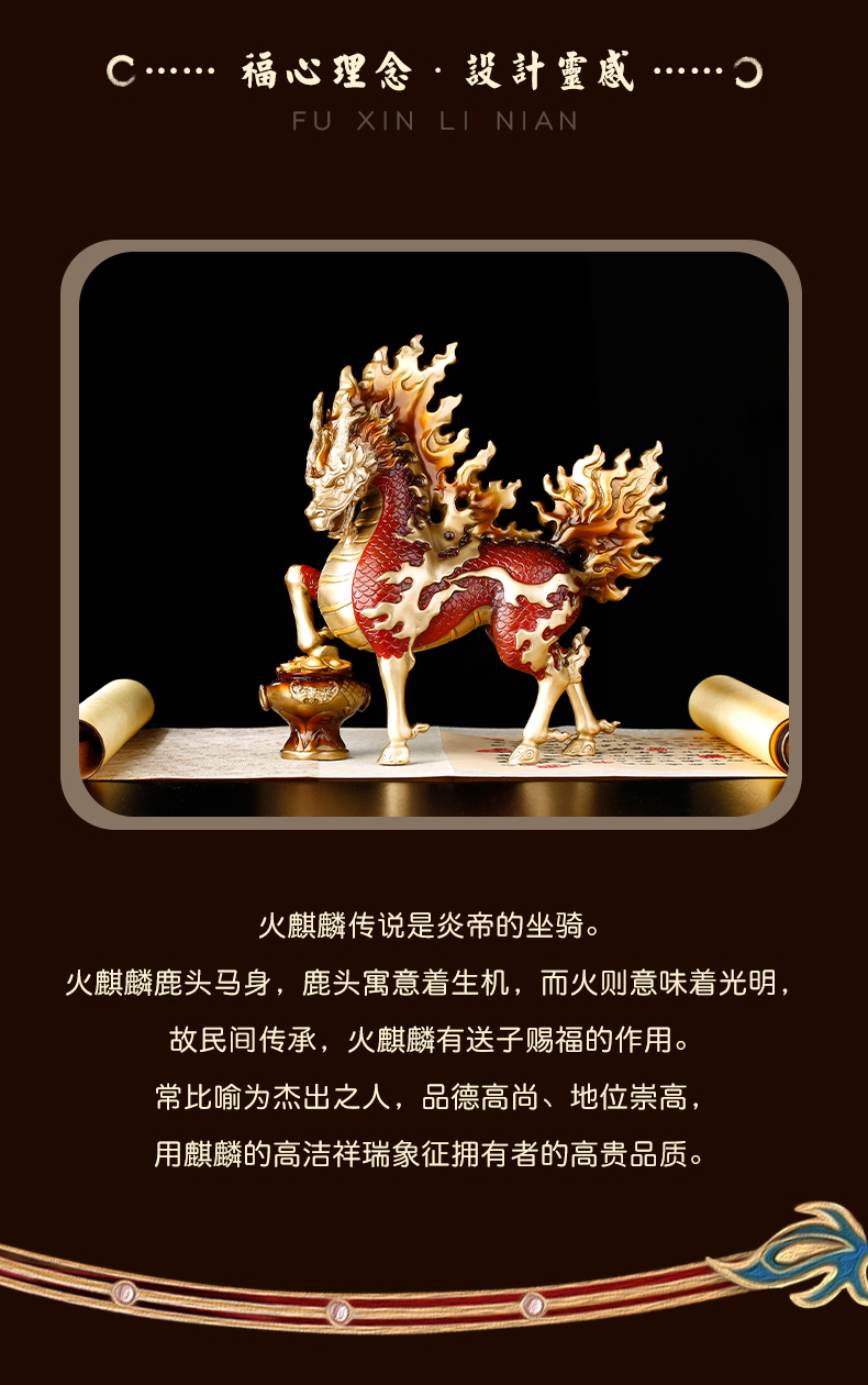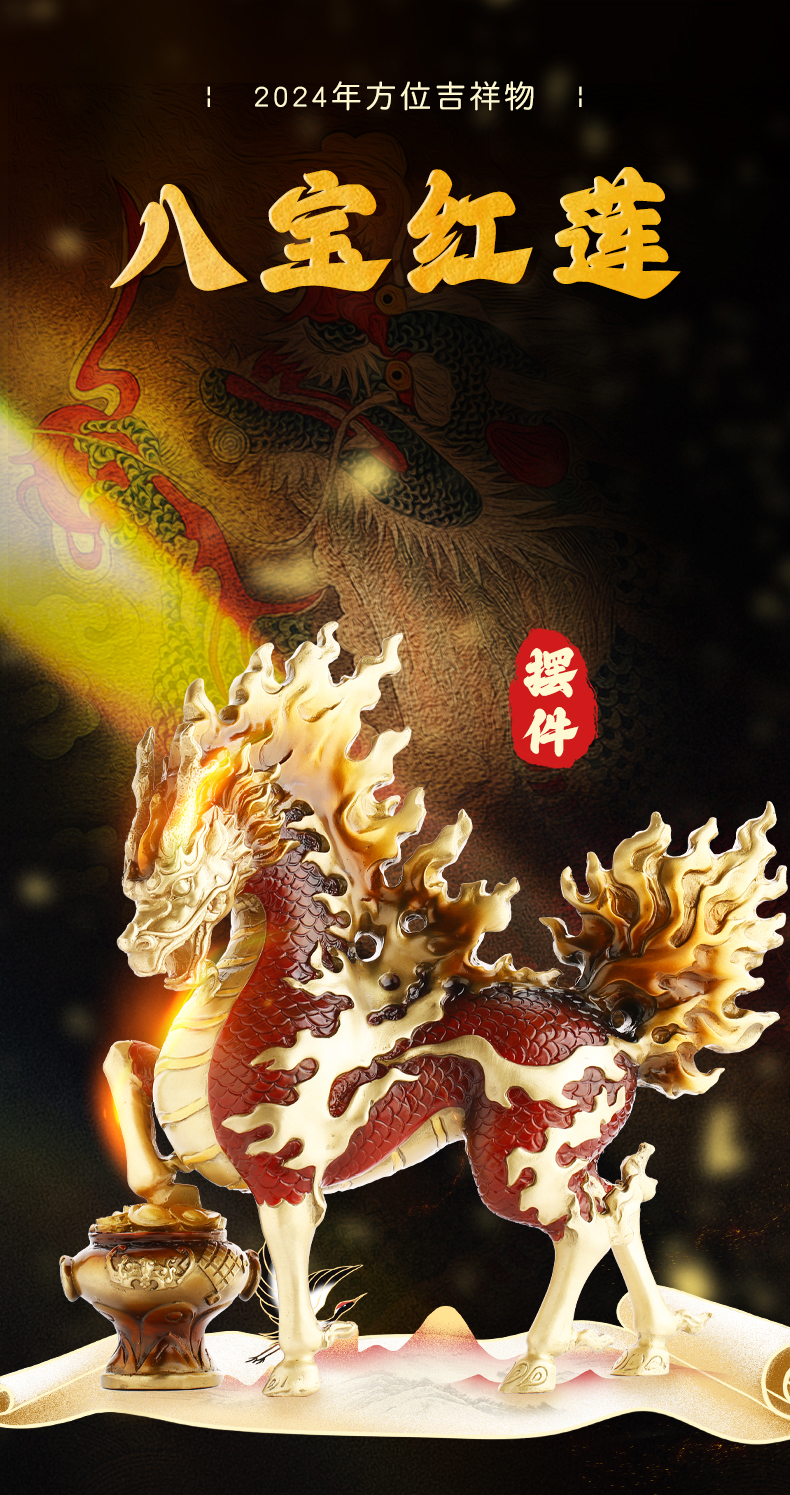 慈元阁2024年方位吉祥物八宝红莲火麒麟摆件家居玄关客厅办公室书房摆设