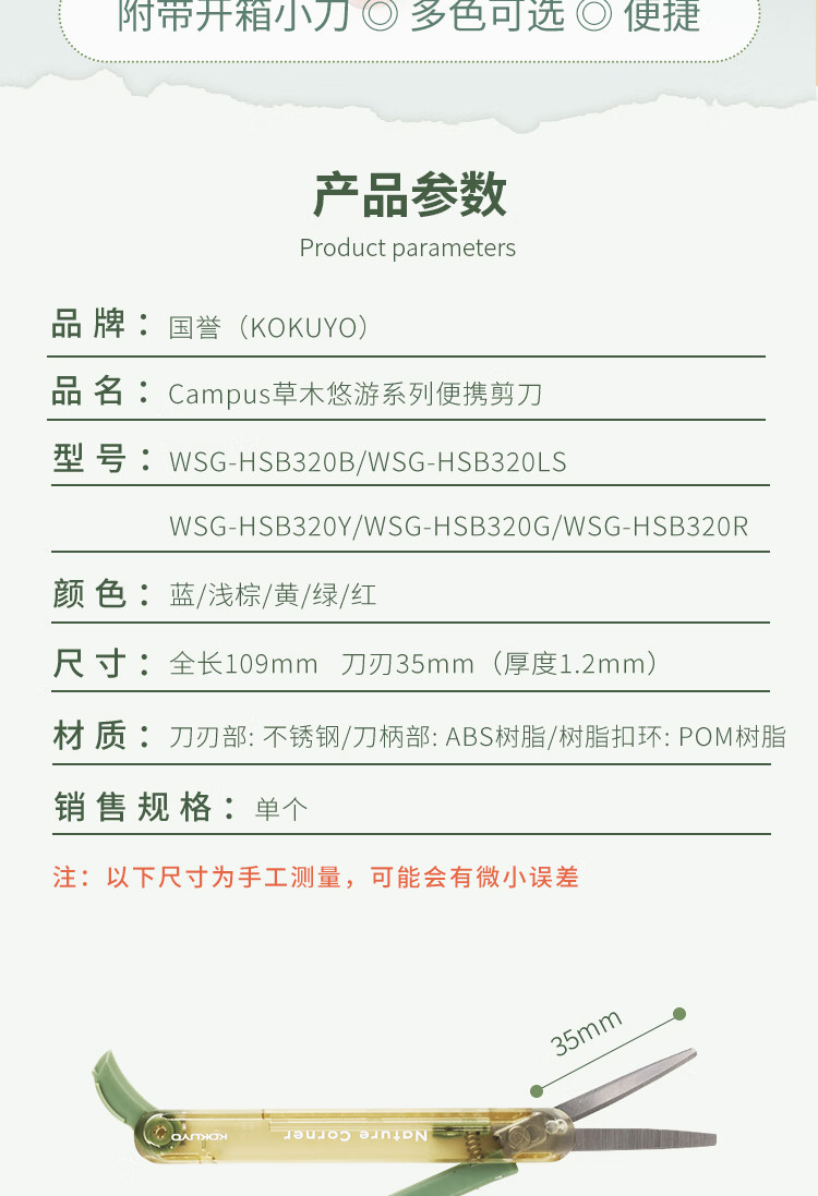 国誉草木悠游 便携剪刀(红) 刃长35mm WSG-HSB320R、WSG-HSB320G、WSG-HSB320B、 WSG-HSB320Y、WSG-HSB320LS