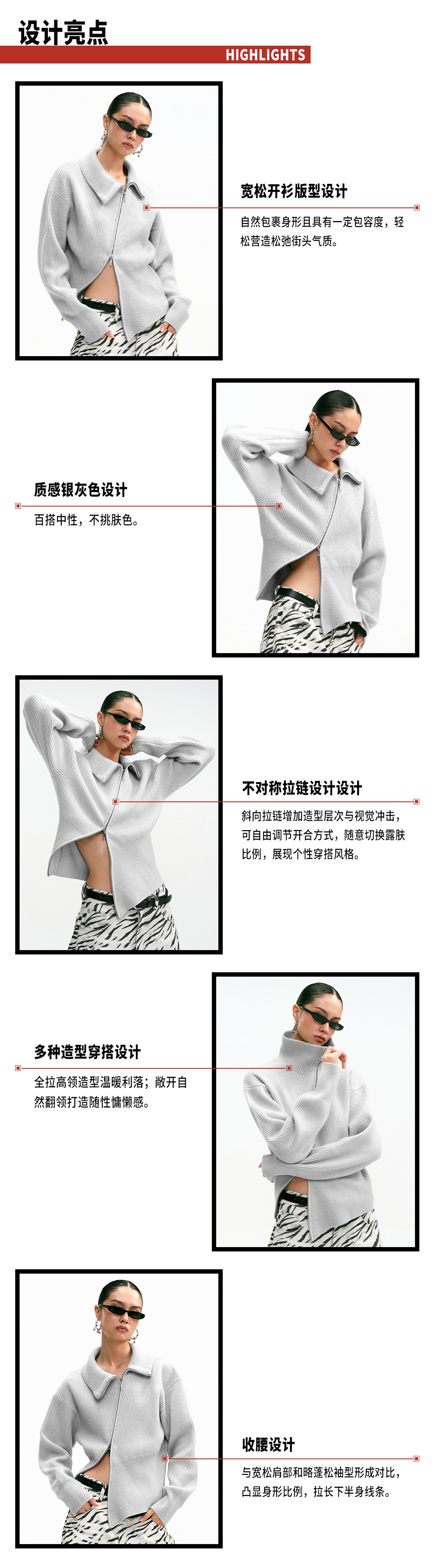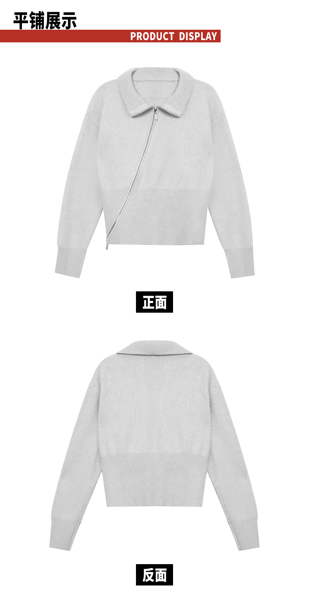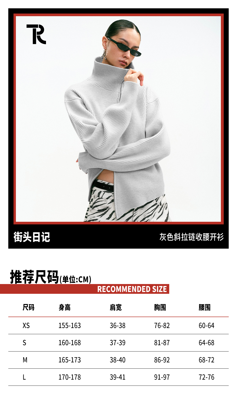 TR她热 街头日记 灰色斜拉链复古显瘦收腰百搭针织开衫外搭