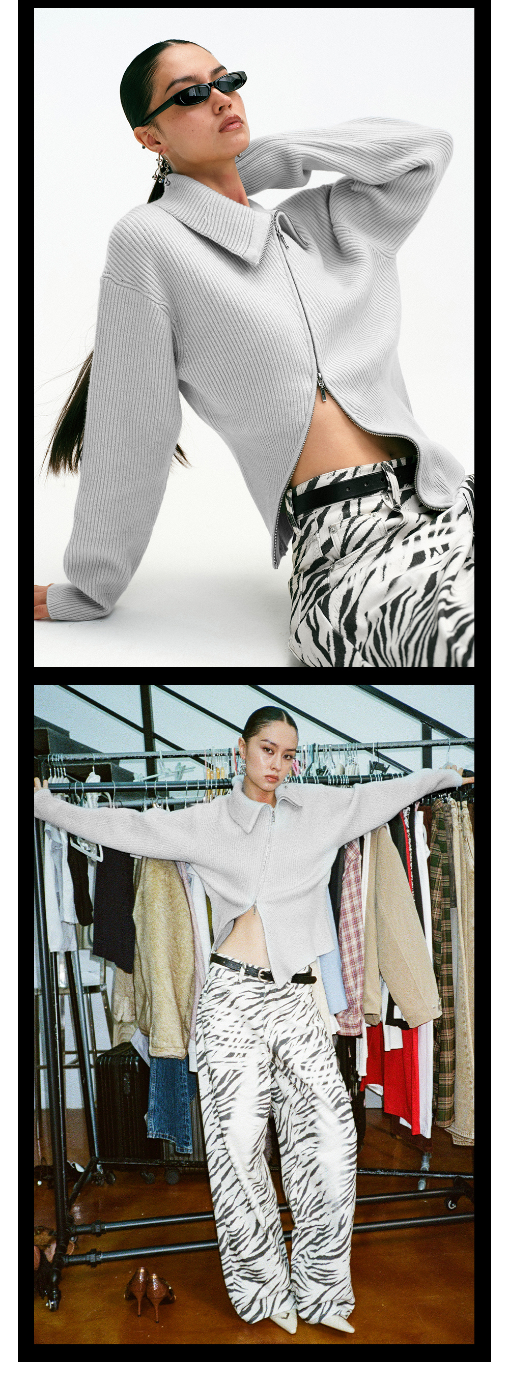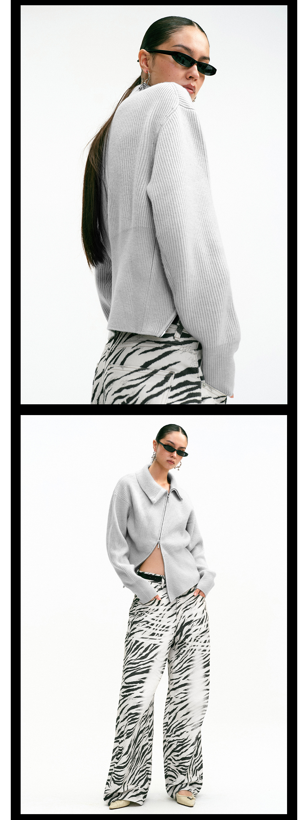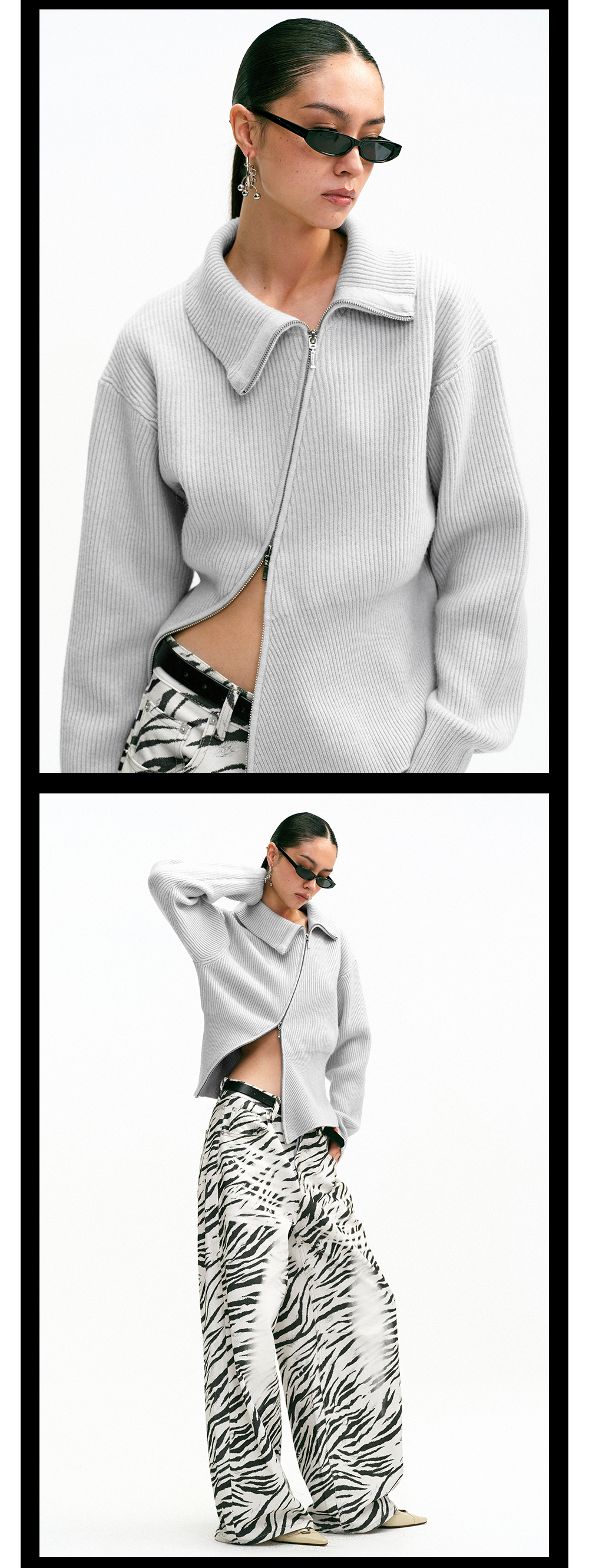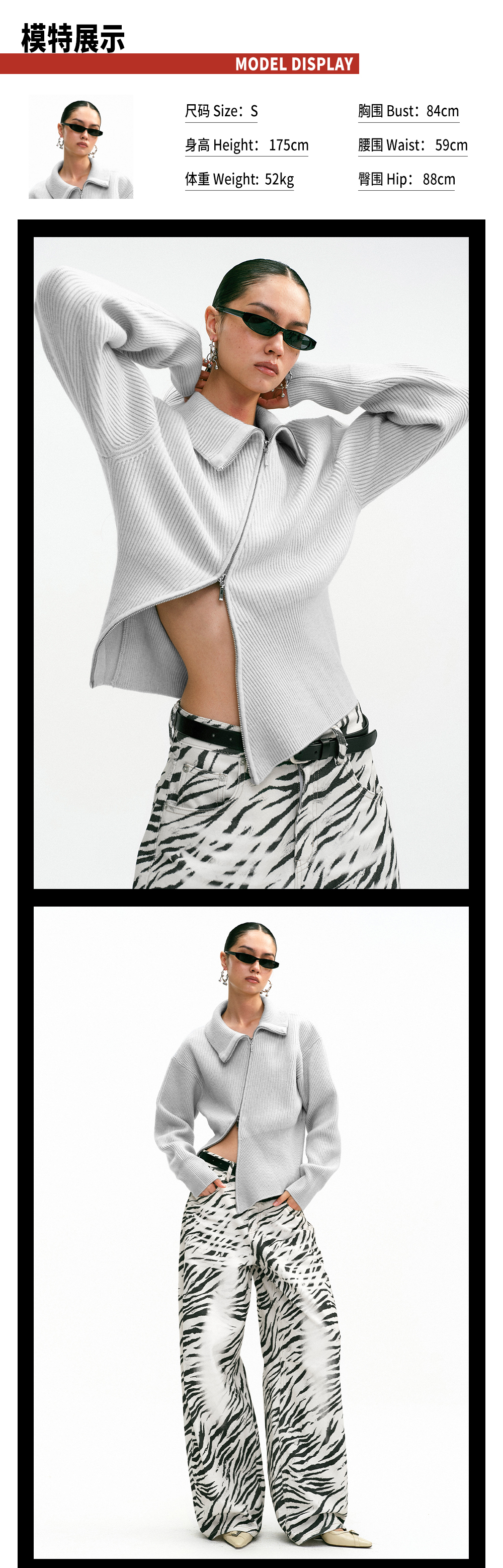 TR她热 街头日记 灰色斜拉链复古显瘦收腰百搭针织开衫外搭