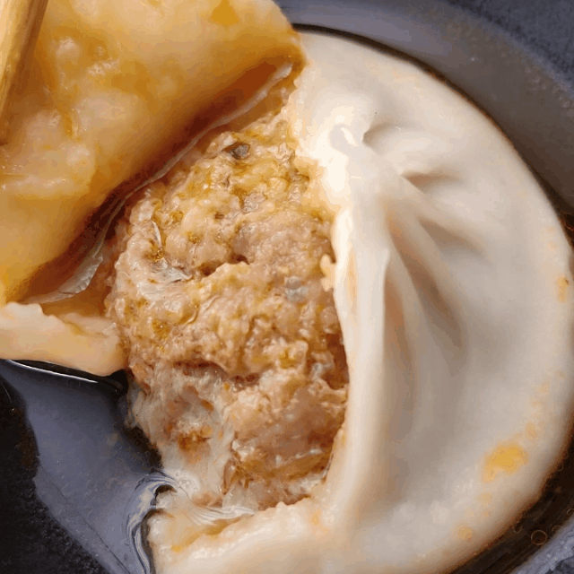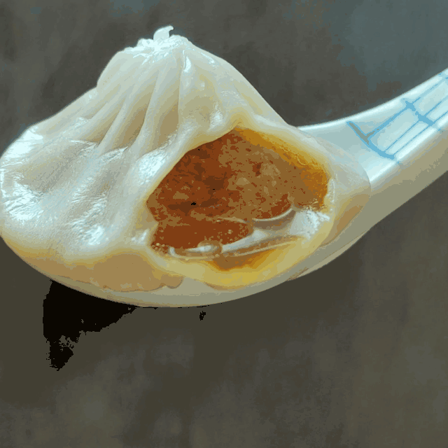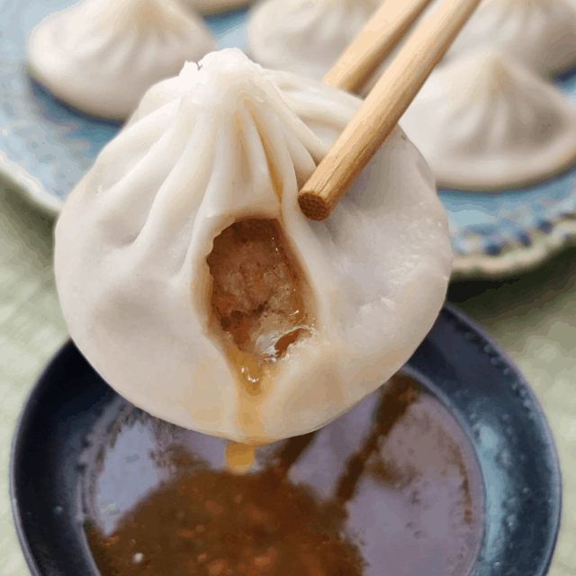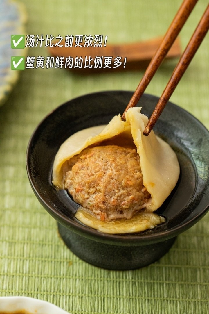 💕小小一口 蟹黄金光乍破,汤汁滚热奔流! 💕吸上一口汤 暖暖又咸鲜,吃起来还有点小甜! 💕符合靖江风味😋 但也不像大多数蟹黄汤包那么甜, 这种味道更适合全国大部分人口味!