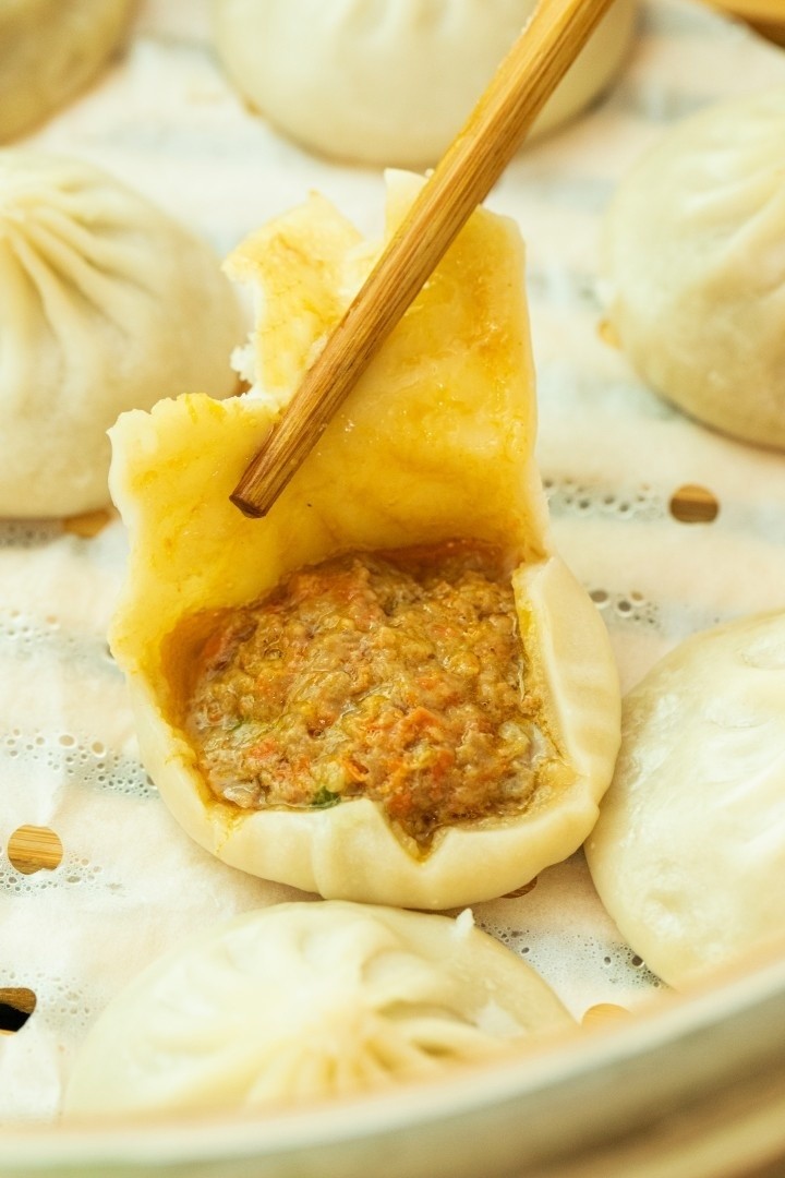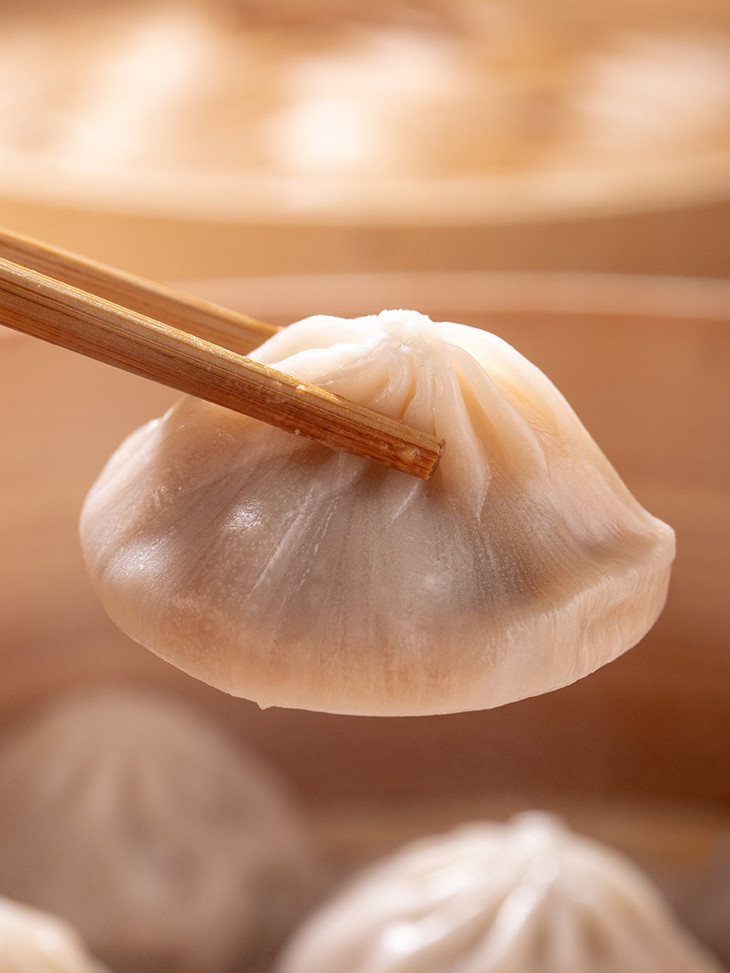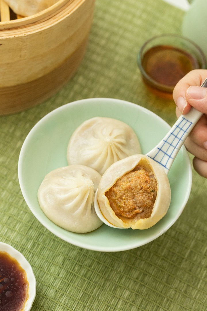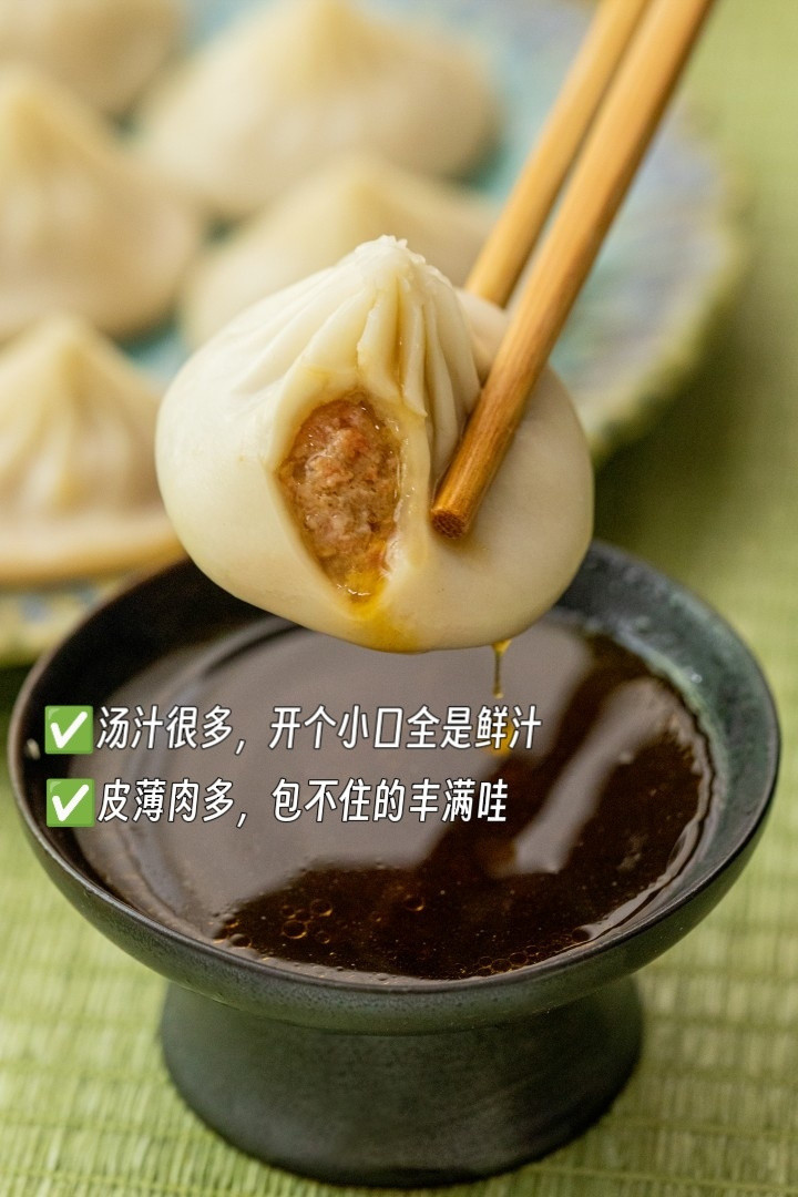 而且在制作工艺上有一套自己的秘方, 让每一口蟹黄汤包都没有腥味。 70%后腿土猪肉瘦肉+30%肥肉, 黄金比例,口感棒棒!
