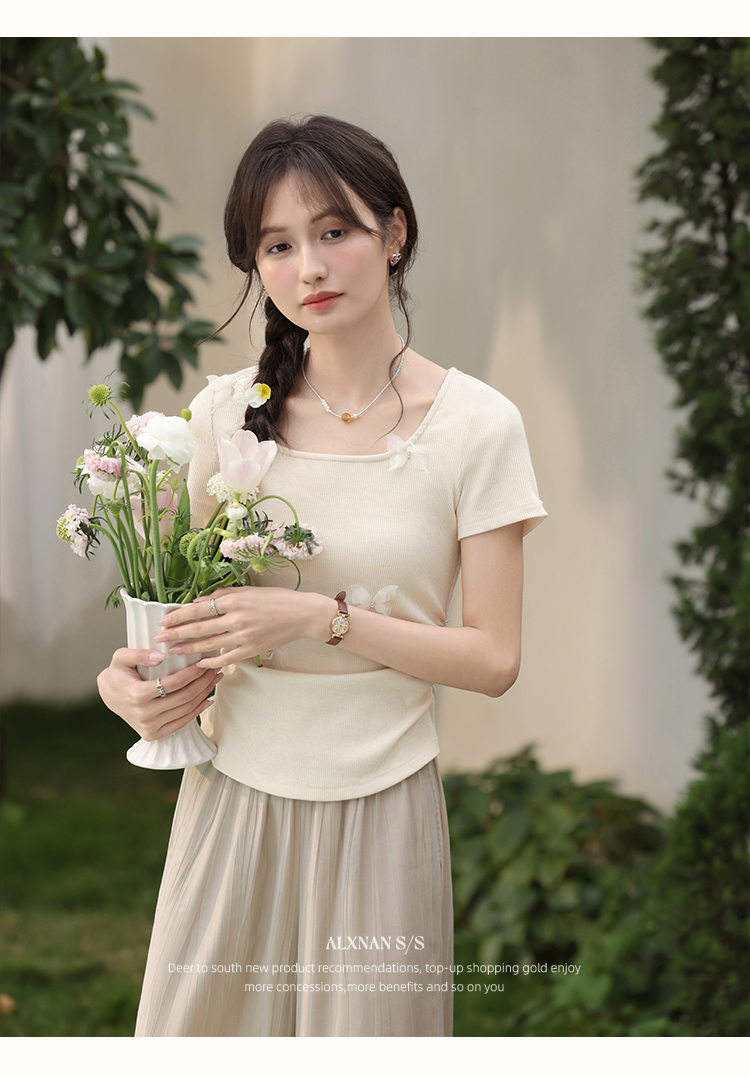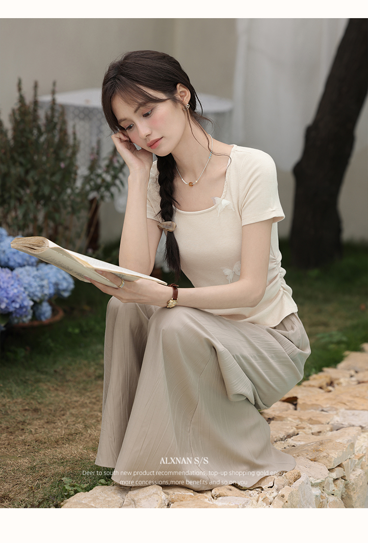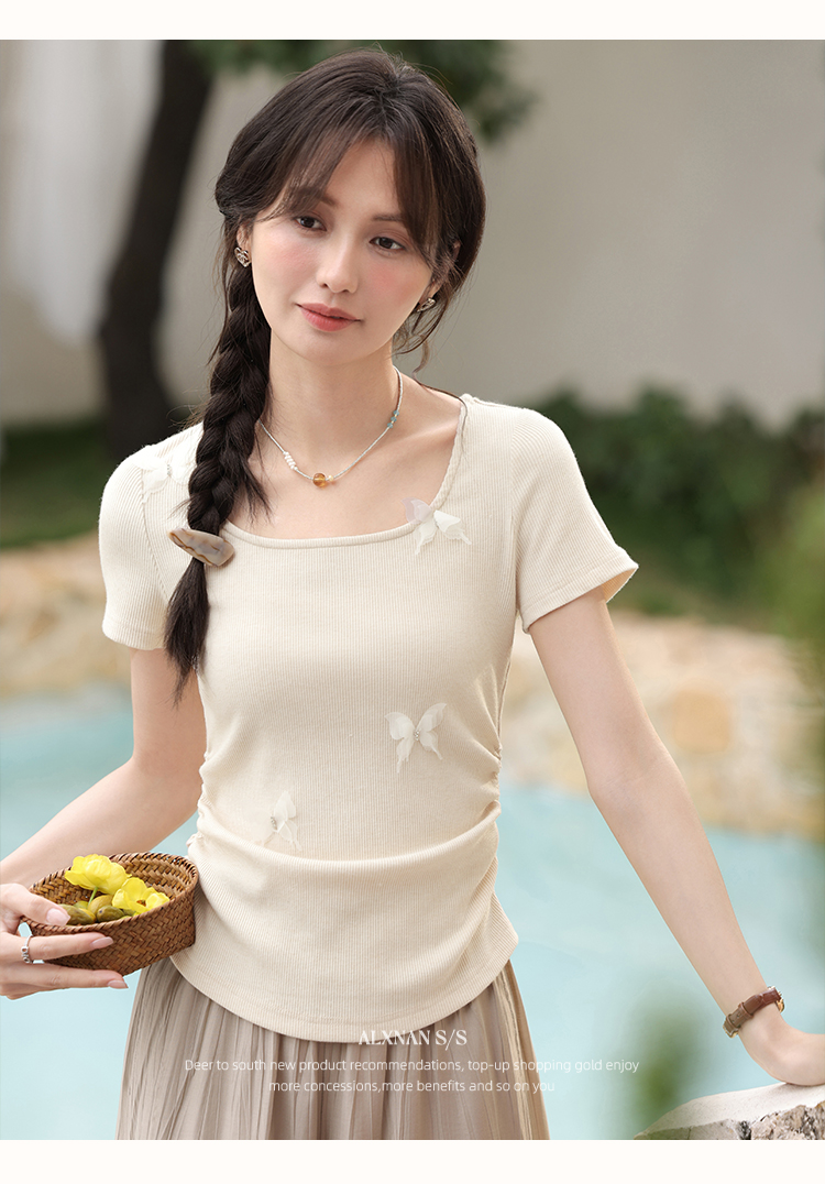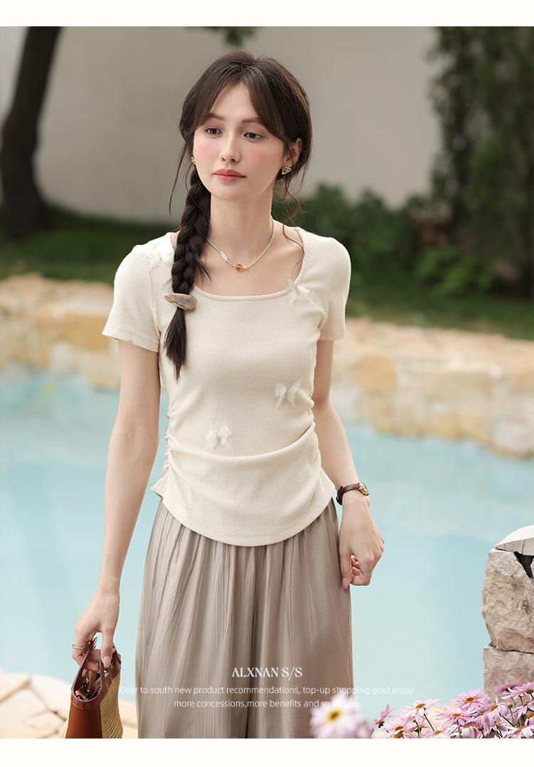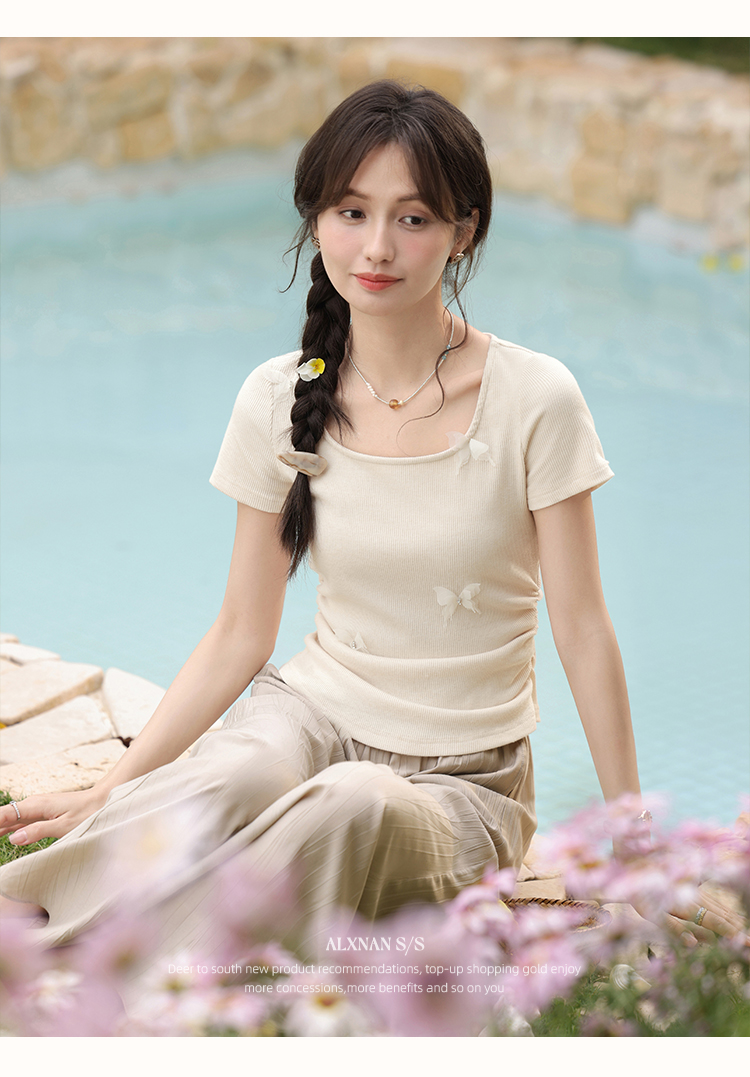 【65折秒杀】鹿向南「风与蝶序」杏色方领短袖T恤女夏新款设计感抽褶收腰上衣L53956