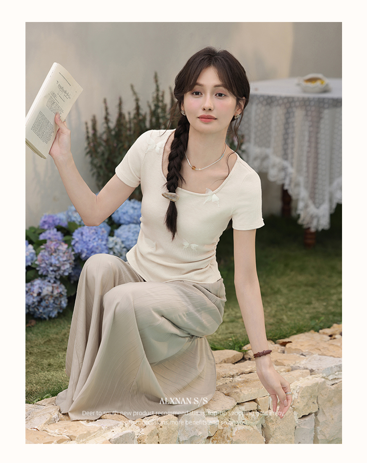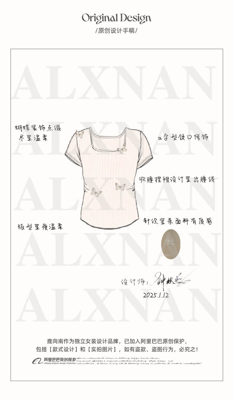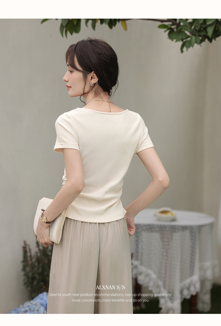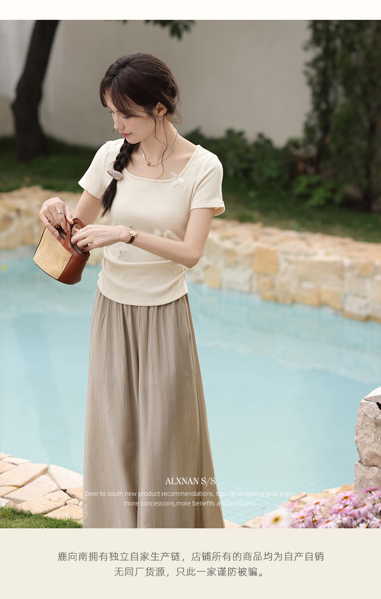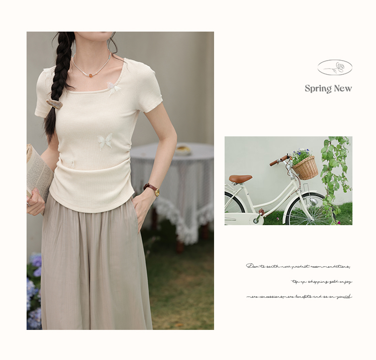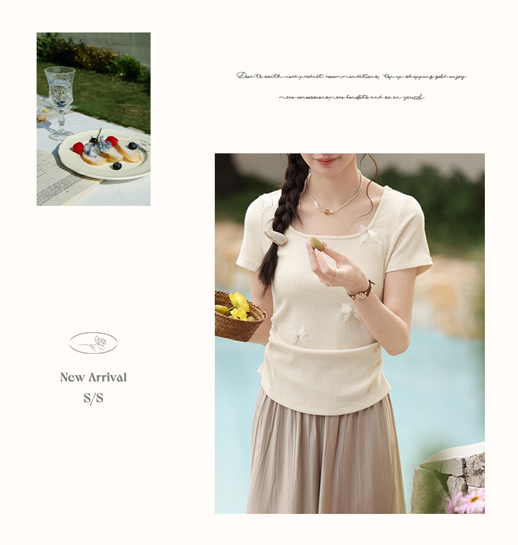 【65折秒杀】鹿向南「风与蝶序」杏色方领短袖T恤女夏新款设计感抽褶收腰上衣L53956