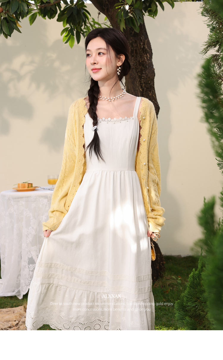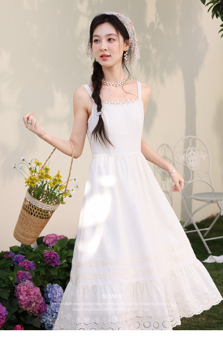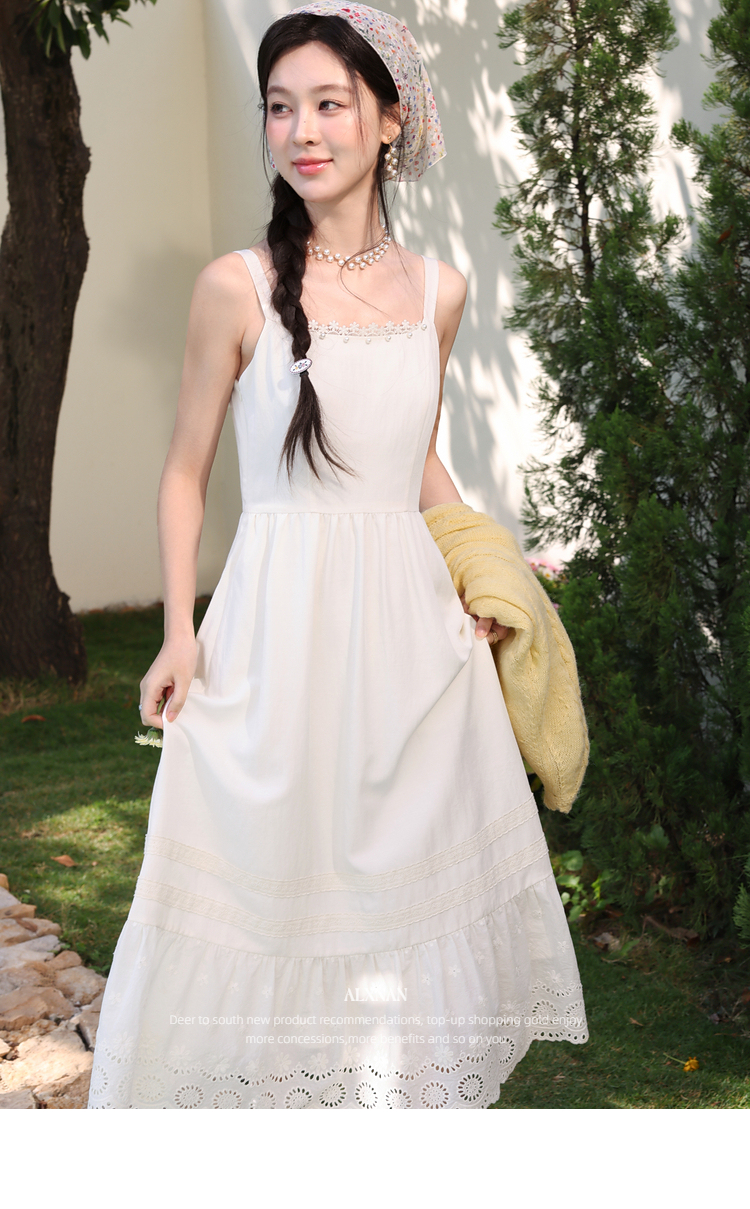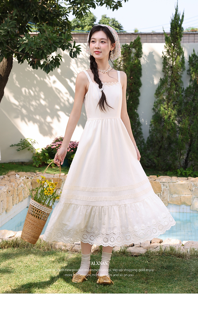 鹿向南「山茶漫记」米白色方领吊带连衣裙女春高腰显瘦巨好看长裙 商品图1