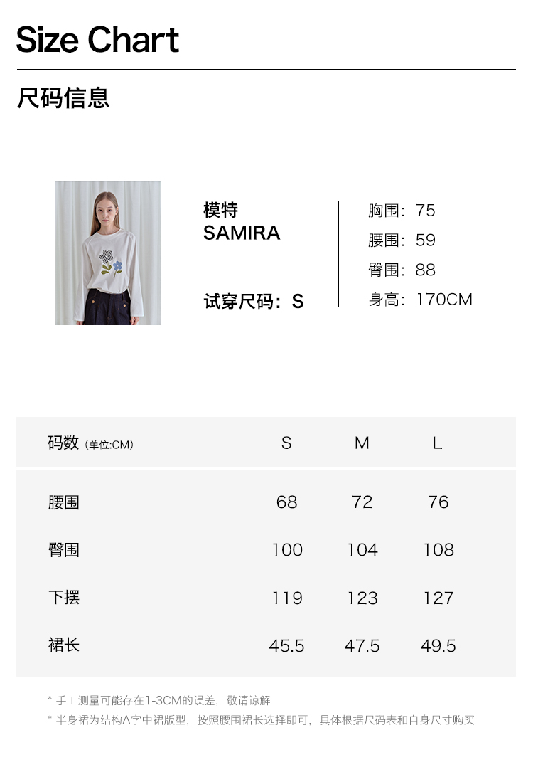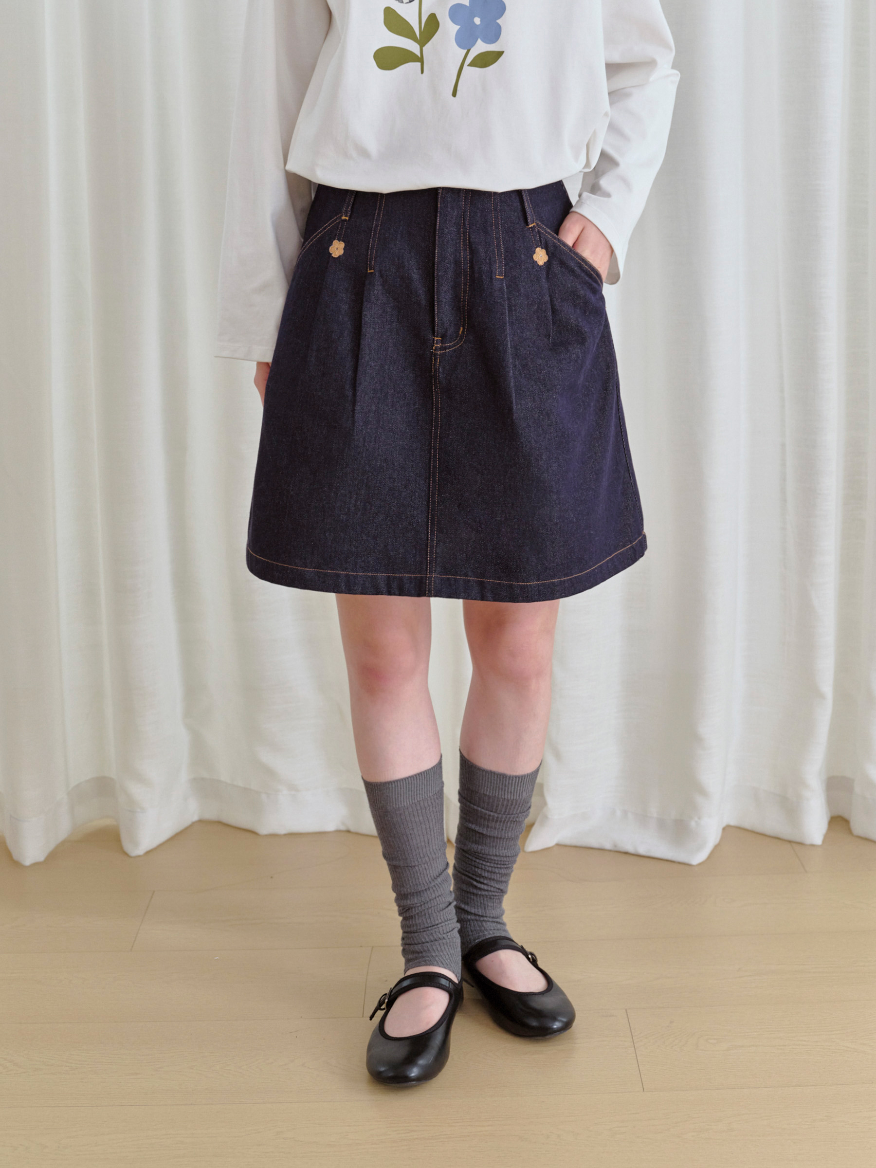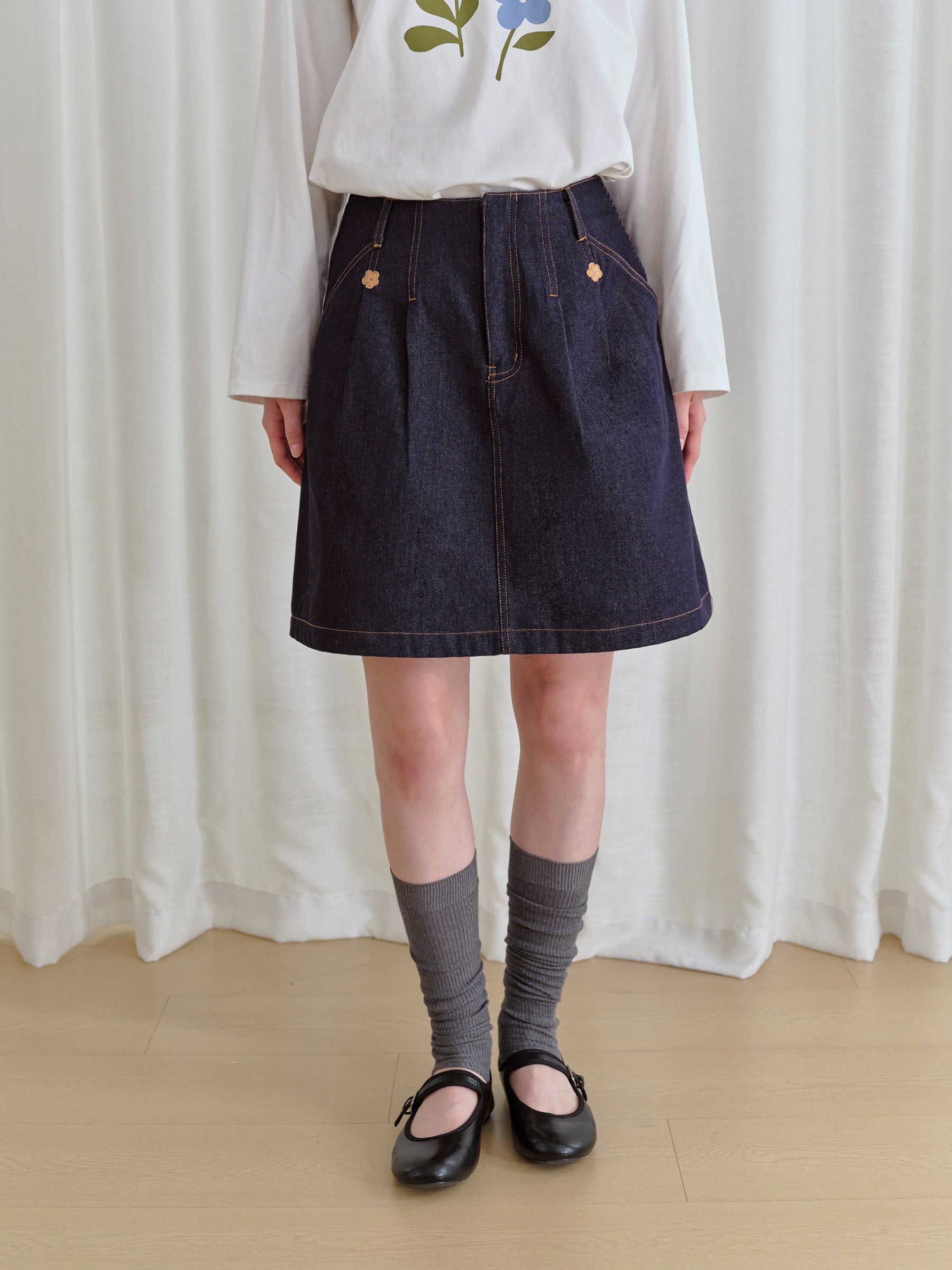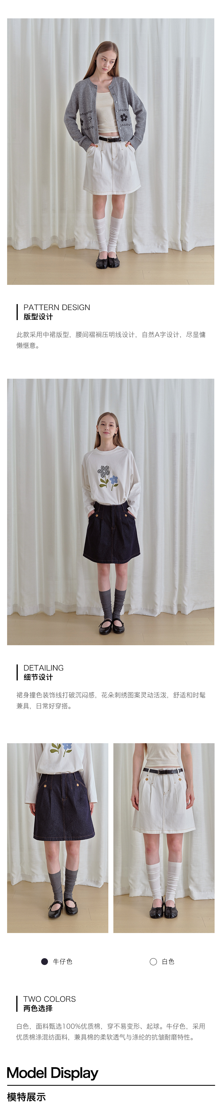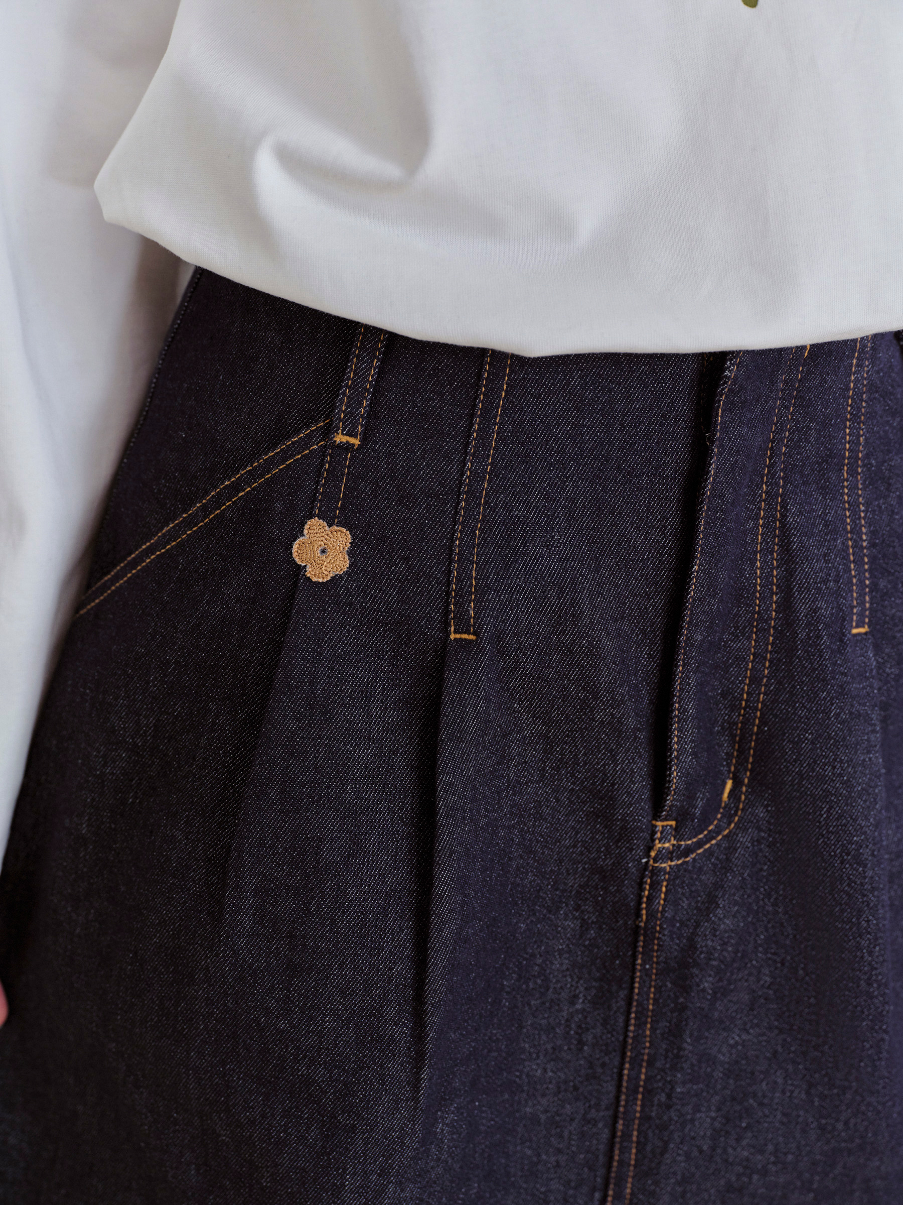 ForPoem 现货 25/FW原创设计复古刺绣花朵明线牛仔短裙女百搭高腰A字半身裙