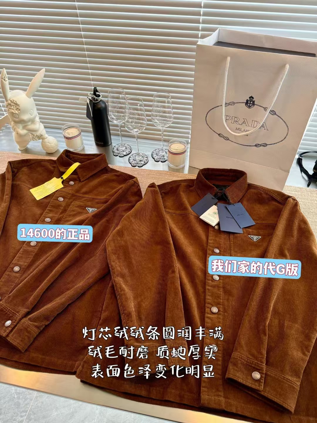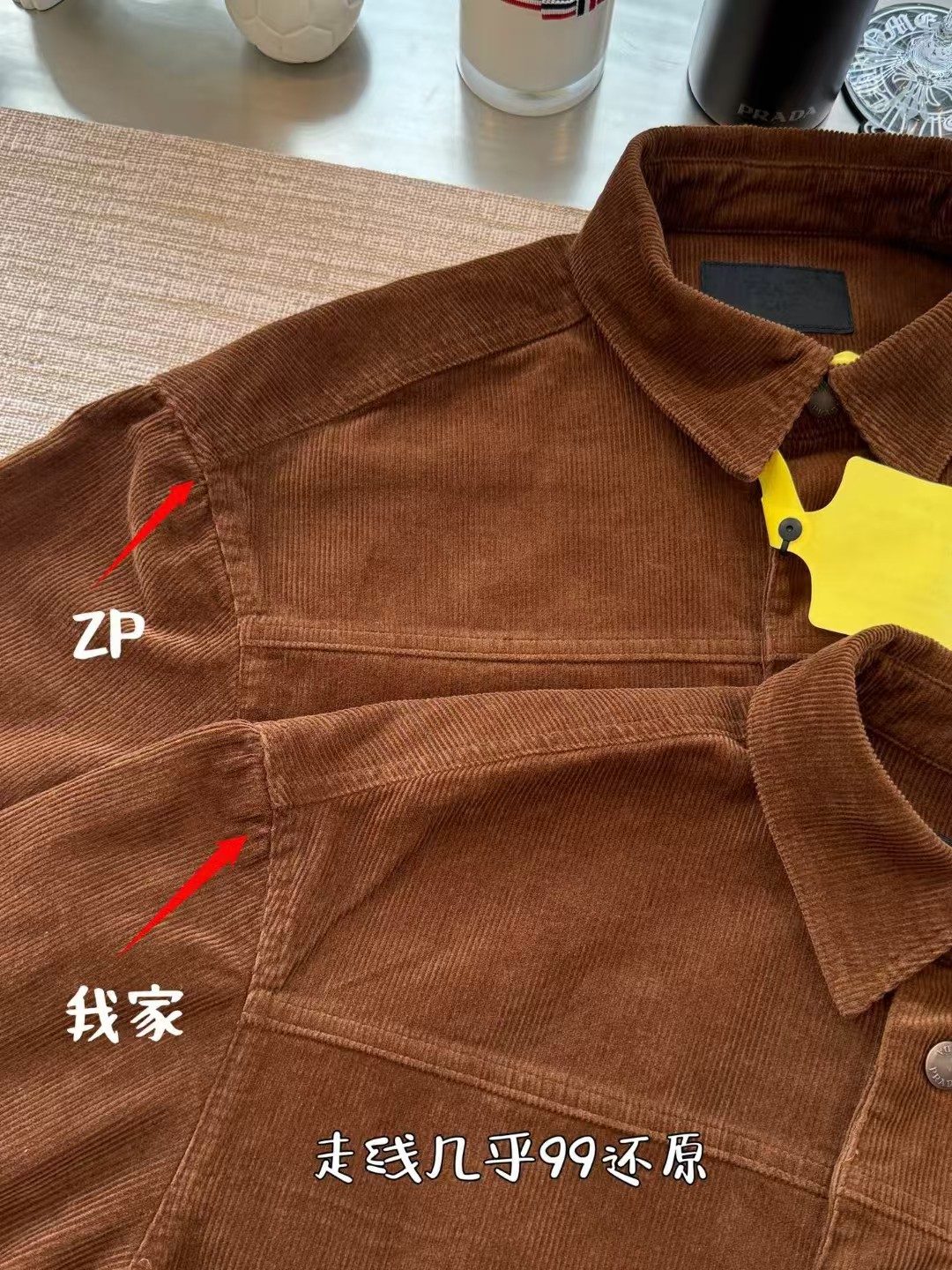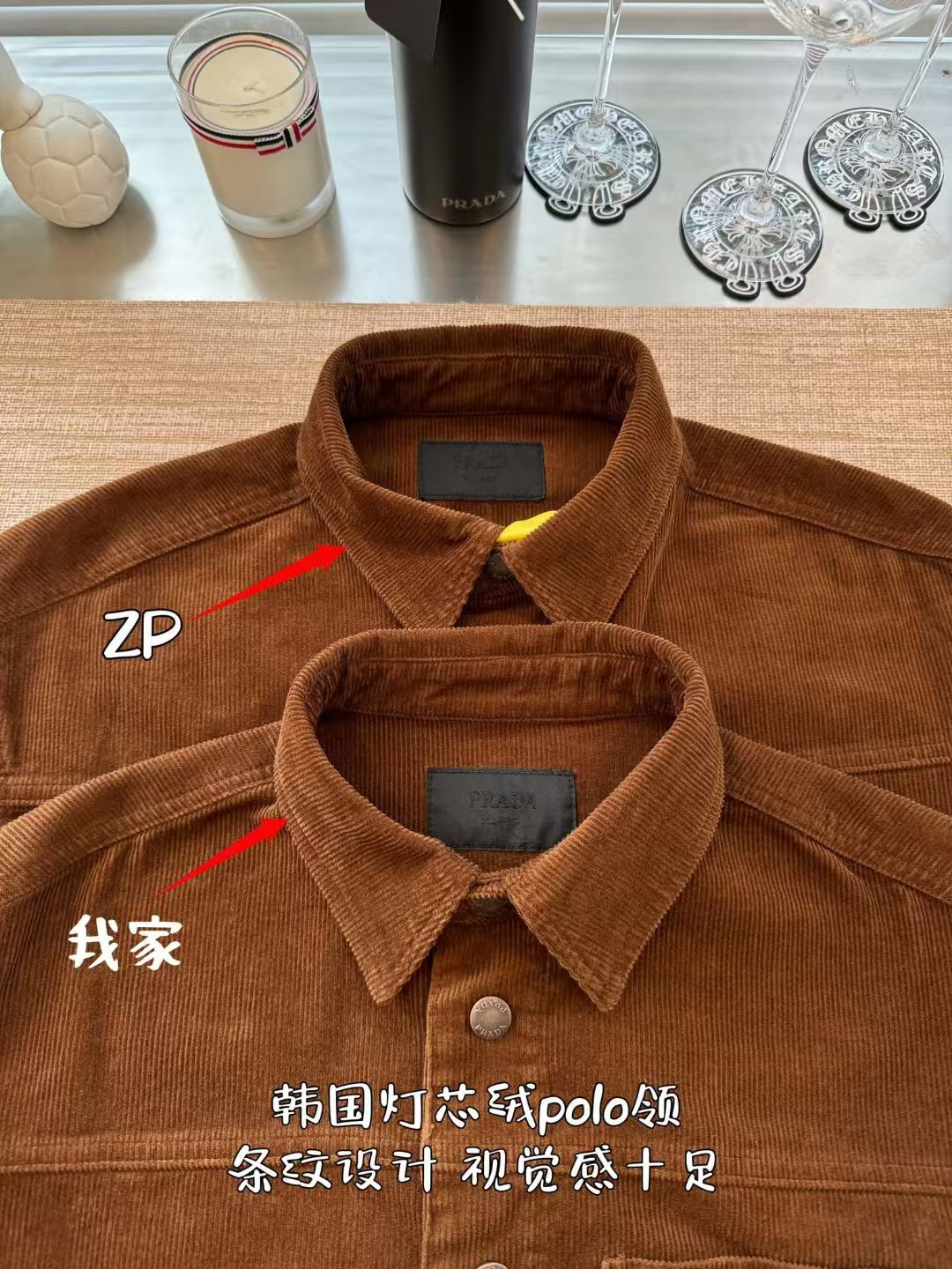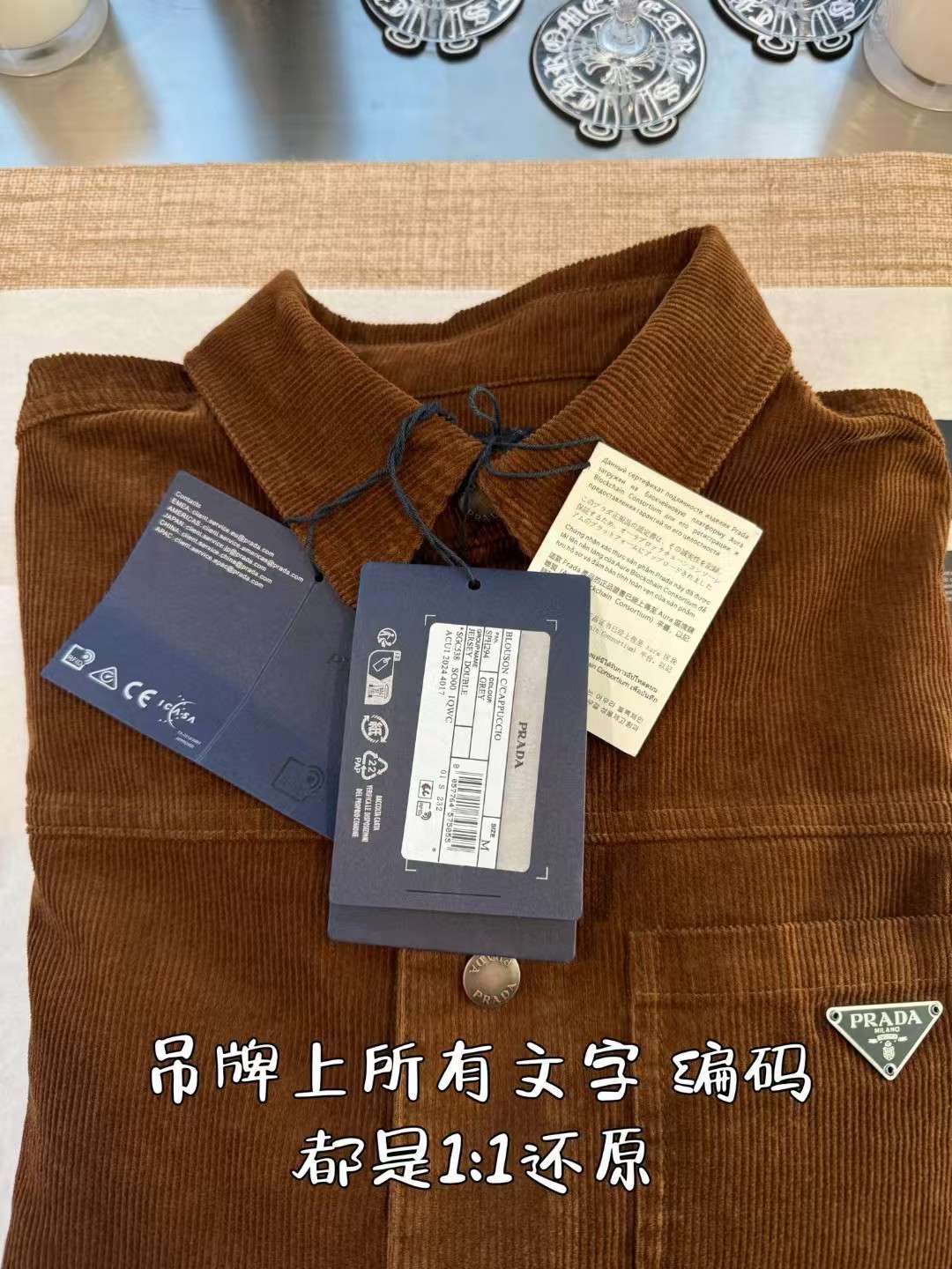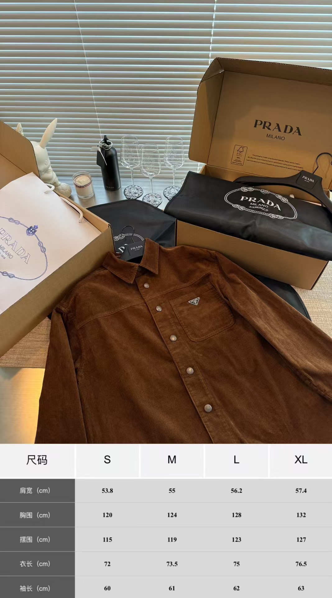 PRADA 24FW 灯芯绒美拉德夹克外套🫡风靡全球美拉德色系 上身很出圈,温暖又深沉,还有大地气息 超适合秋冬穿搭,层次感高级感 直接拉满,整件衣服采用韩国灯芯绒 立体感很强 全身定制开模五金 真正做到1:1copy!!闭眼入 码数:S M L XL