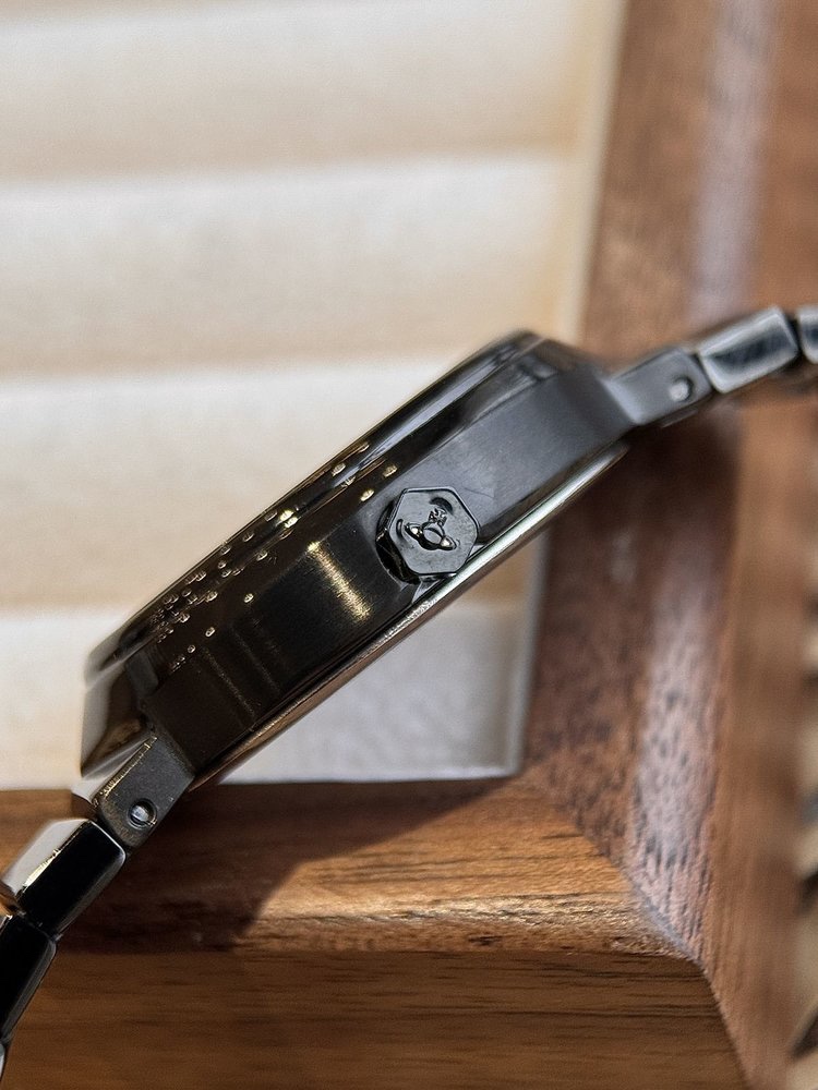 而且它是12点位立体土星标志!6点位薇薇安英文logo!三枚条钉时标 展示设计的不凡之处!经典三针+表冠上的土星标志,质感满满