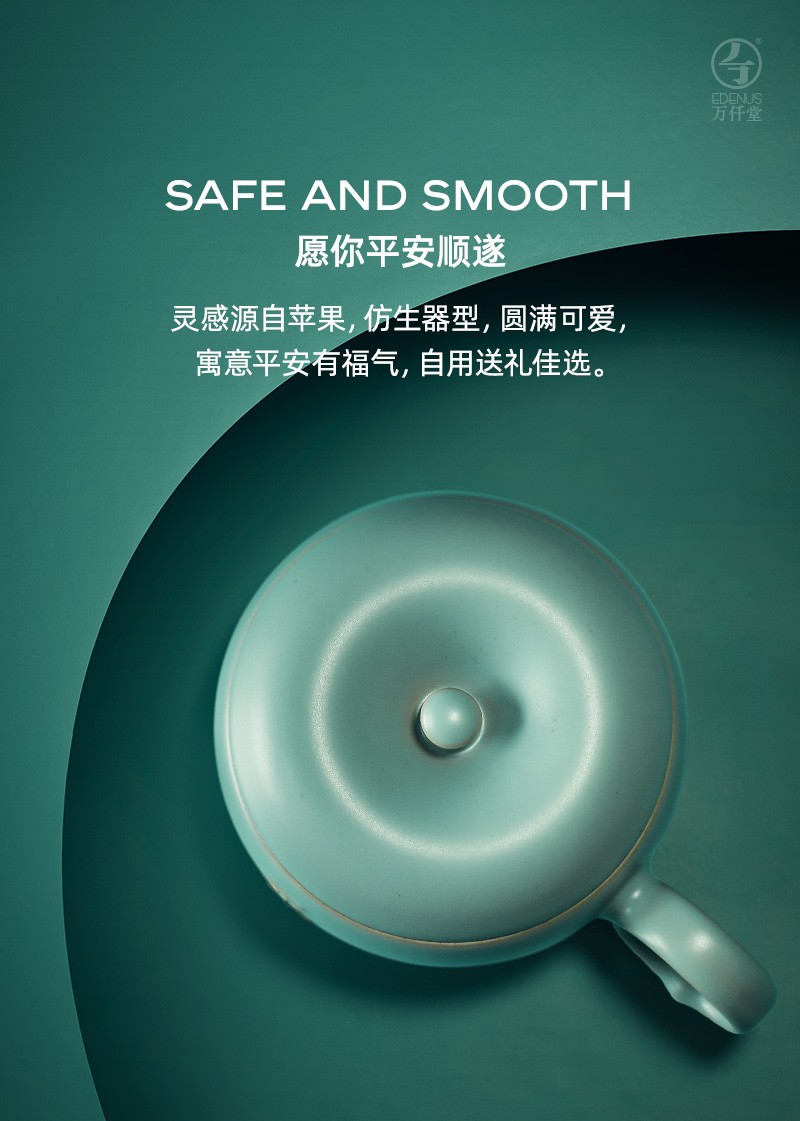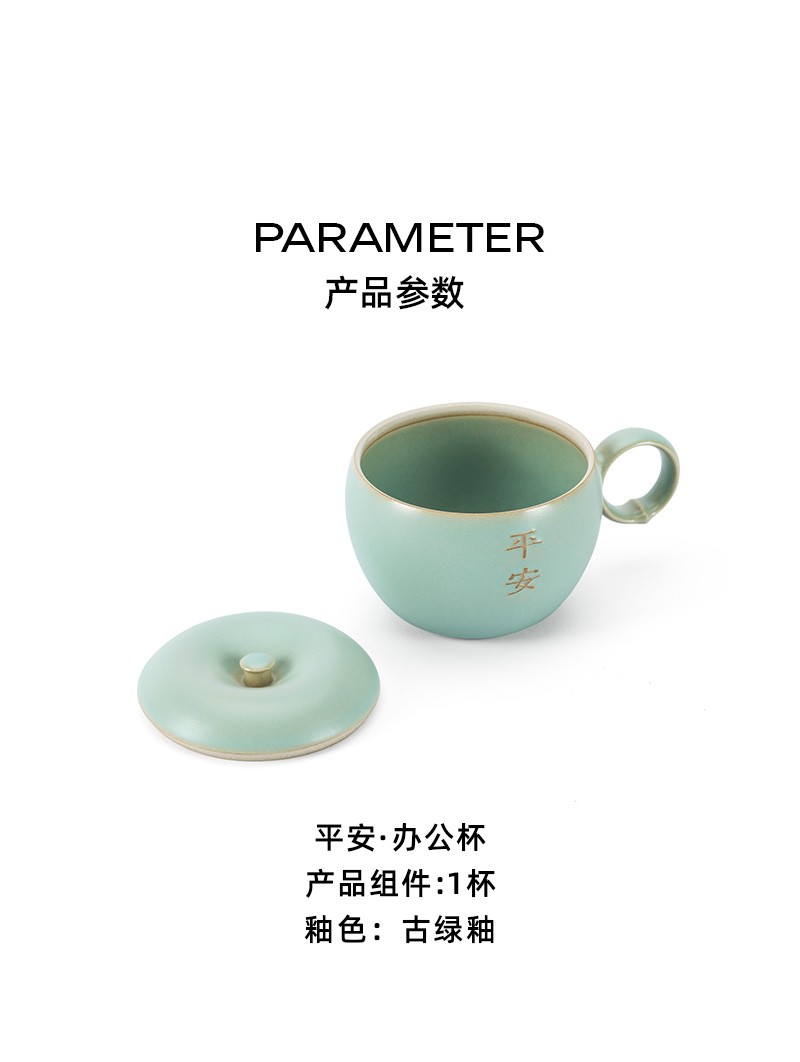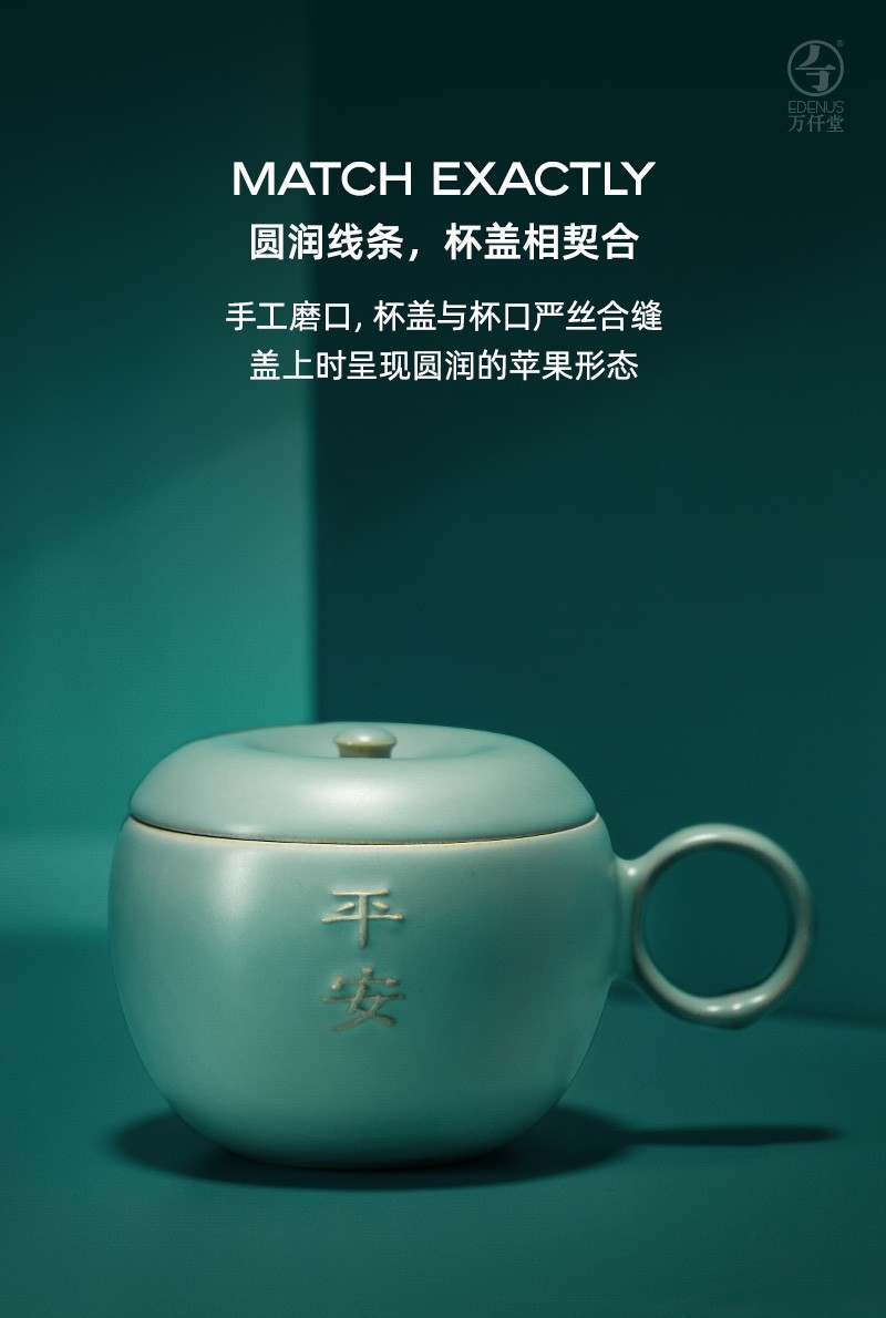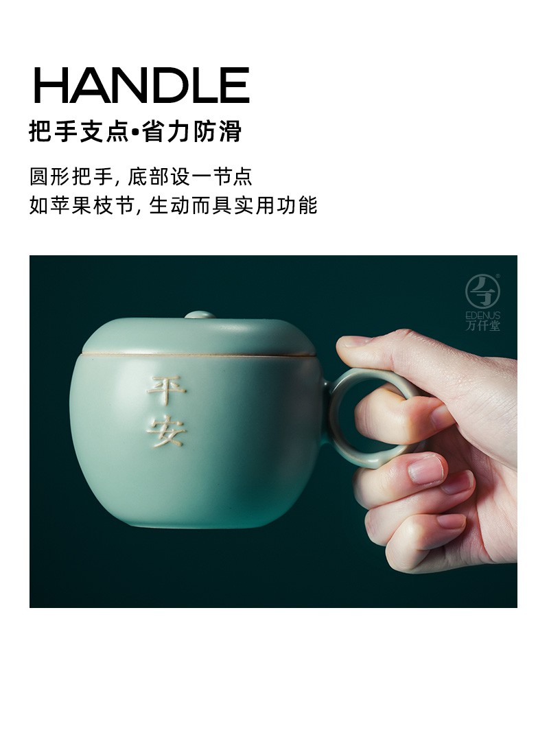 万仟堂 平安办公杯 陶瓷水杯马克杯女 创意苹果造型水果茶具 防尘带盖马克杯 大容量水杯 古绿釉 1杯 245ml
