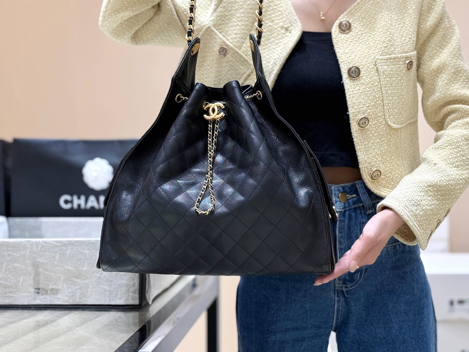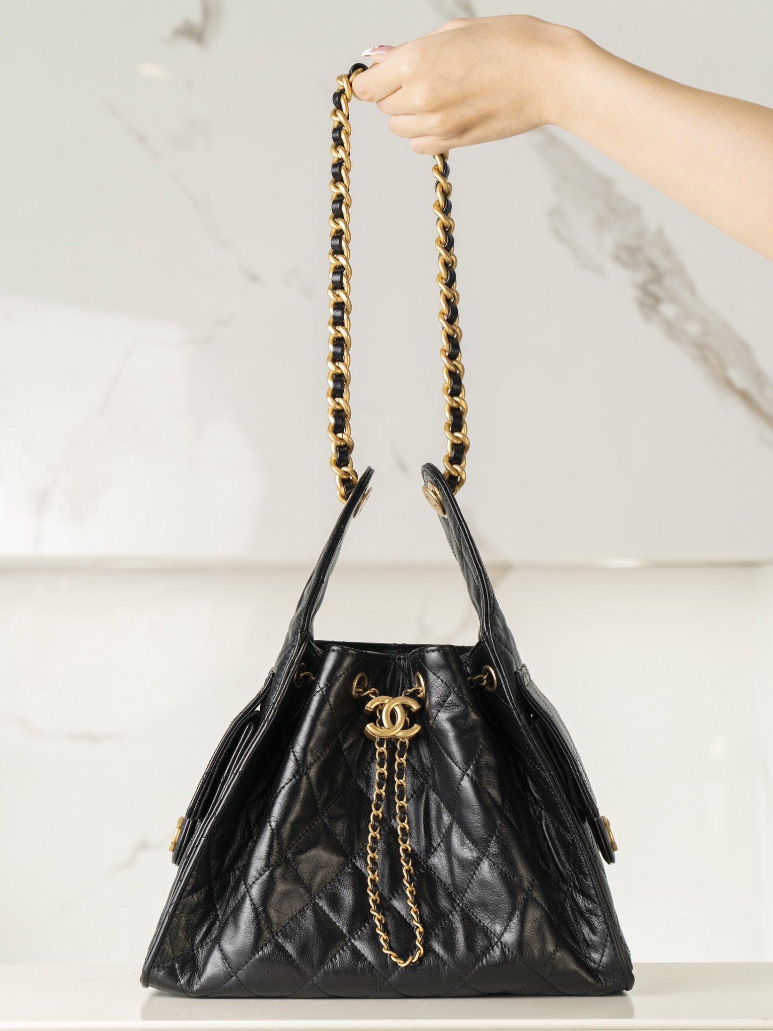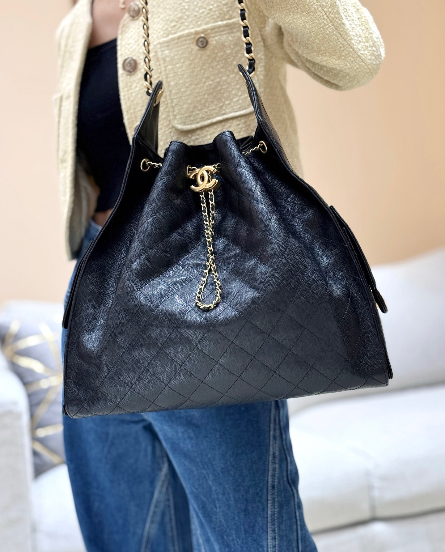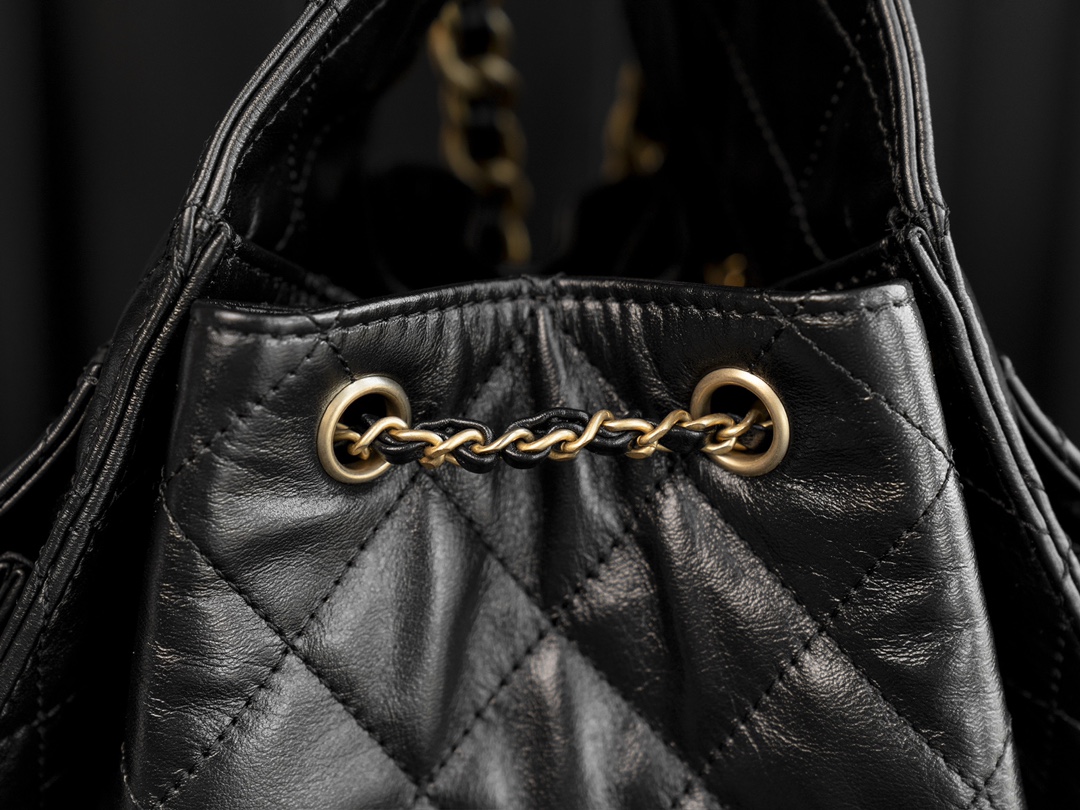 香奈儿 25Bag 25C 经典菱格皮穿链徽标Logo 牛皮材质金色五金 腋下包单肩包 抽绳水桶包 黑金🖤 小号(LZ*MM)