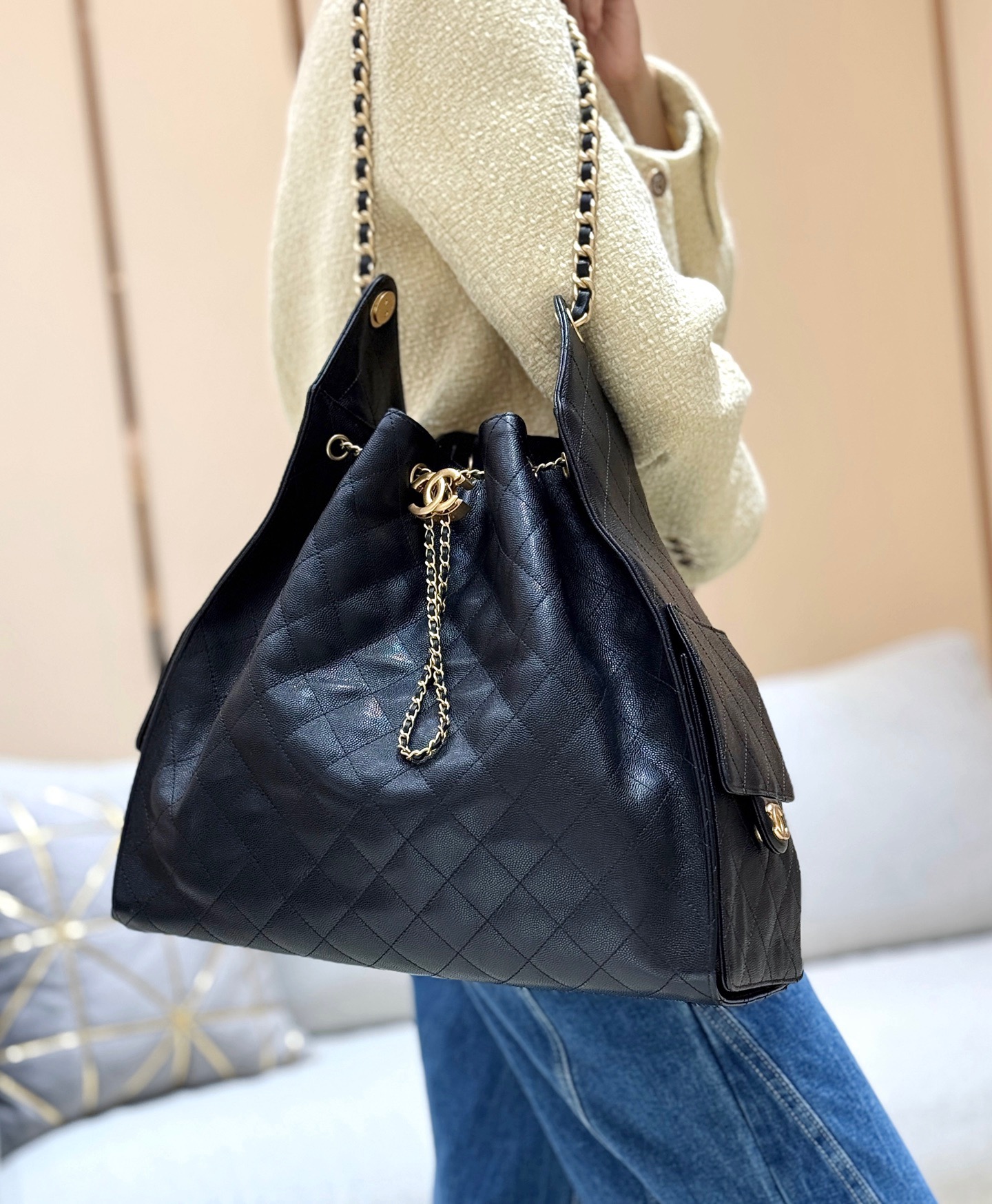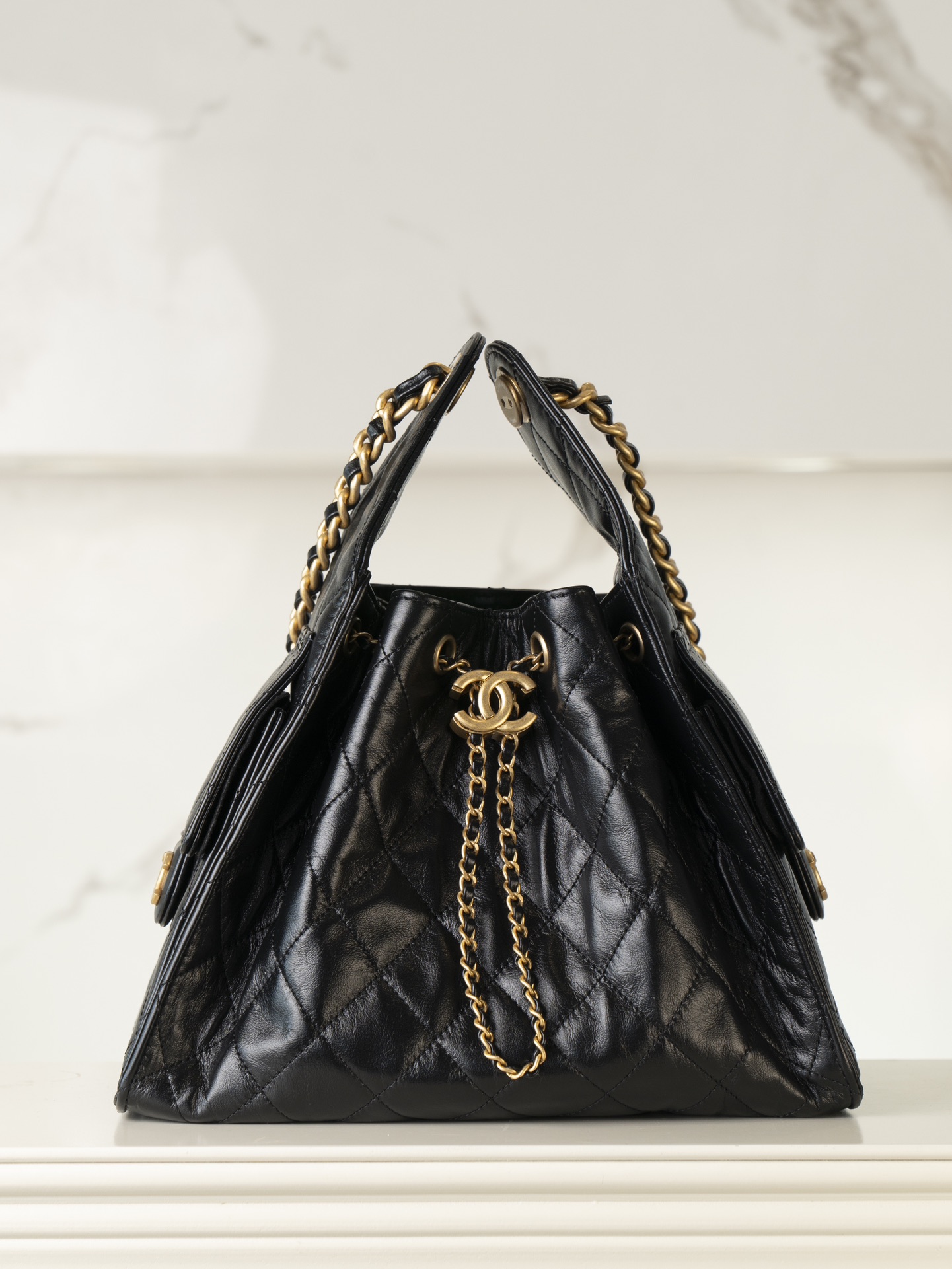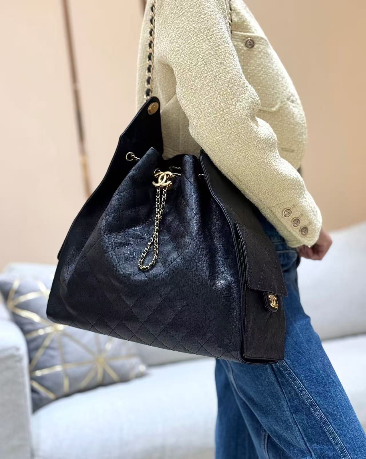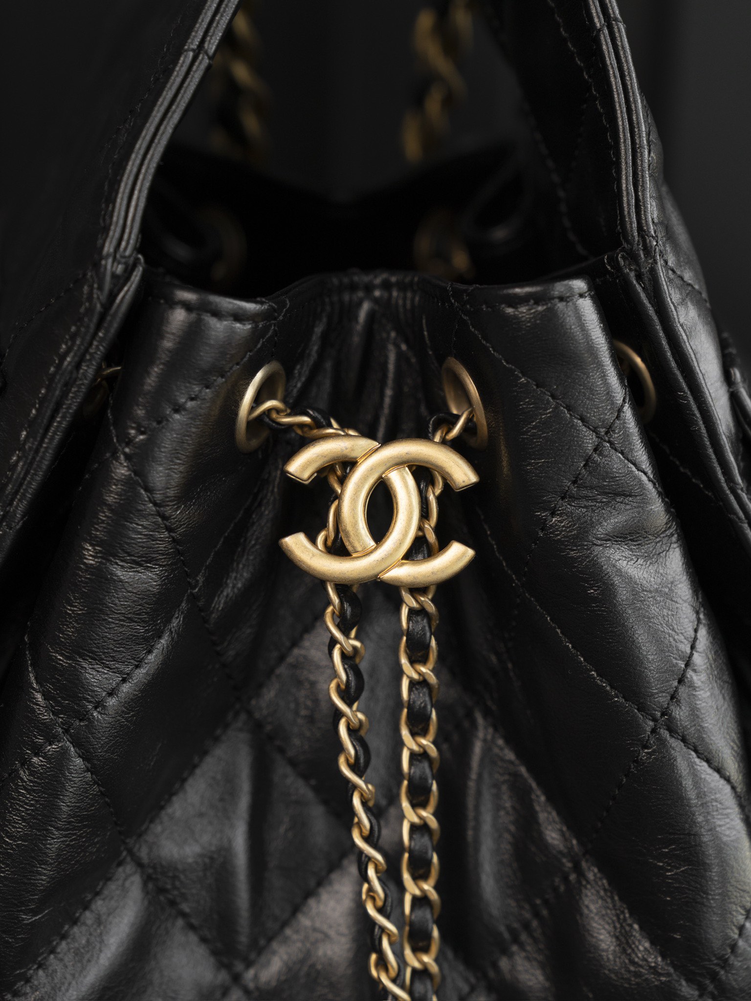 香奈儿 25Bag 25C 经典菱格皮穿链徽标Logo 牛皮材质金色五金 腋下包单肩包 抽绳水桶包 黑金🖤 小号(LZ*MM)